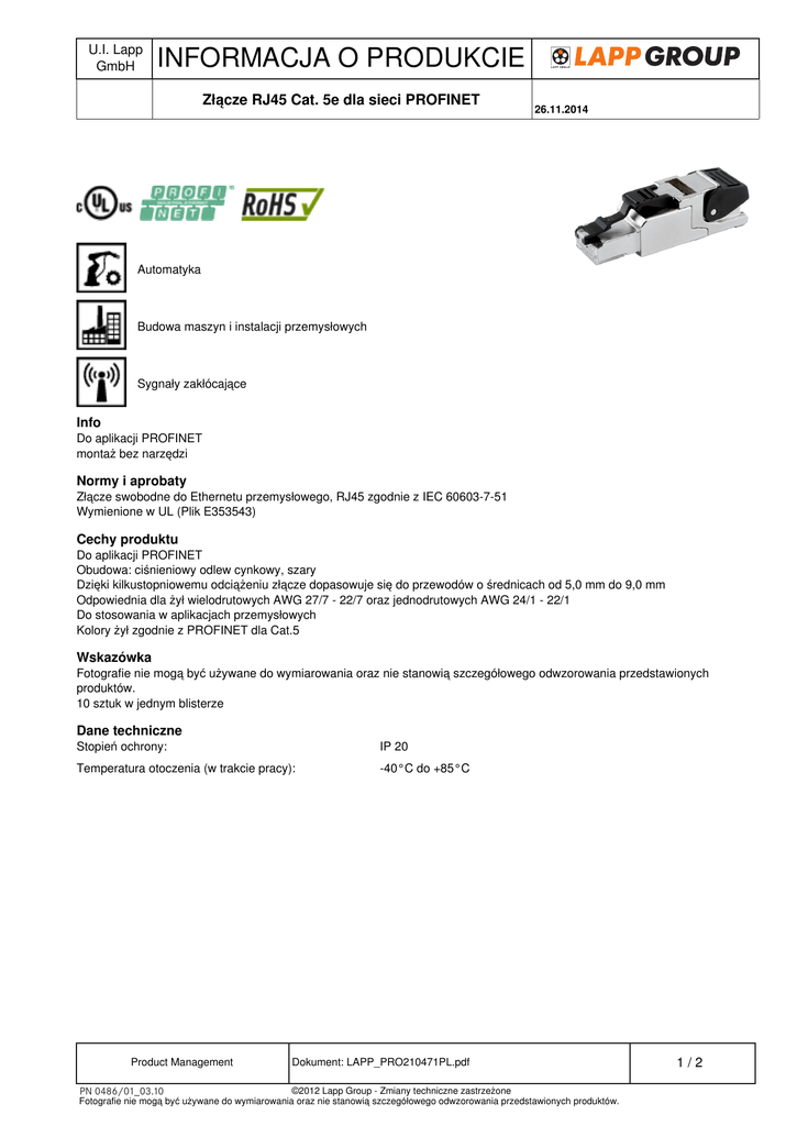 U.I. Lapp GmbH INFORMACJA O PRODUKCIE Złącze RJ45 Cat. 5e dla sieci PROFINET 26.11.2014 Automatyka Budowa maszyn i instalacji przemysłowych Sygnały zakłócające Info Do aplikacji PROFINET montaż bez narzędzi Normy i aprobaty Złącze swobodne do Ethernetu przemysłowego, RJ45 zgodnie z IEC 60603-7-51 Wymienione w UL (Plik E353543) Cechy produktu Do aplikacji PROFINET Obudowa: ciśnieniowy odlew cynkowy, szary Dzięki kilkustopniowemu odciążeniu złącze dopasowuje się do przewodów o średnicach od 5,0 mm do 9,0 mm Odpowiednia dla żył wielodrutowych AWG 27/7 - 22/7 oraz jednodrutowych AWG 24/1 - 22/1 Do stosowania w aplikacjach przemysłowych Kolory żył zgodnie z PROFINET dla Cat.5 Wskazówka Fotografie nie mogą być używane do wymiarowania oraz nie stanowią szczegółowego odwzorowania przedstawionych produktów. 10 sztuk w jednym blisterze Dane techniczne Stopień ochrony: IP 20 Temperatura otoczenia (w trakcie pracy): -40°C do +85°C Product Management Dokument: LAPP_PRO210471PL.pdf ©2012 Lapp Group - Zmiany techniczne zastrzeżone PN 0486/01_03.10 Fotografie nie mogą być używane do wymiarowania oraz nie stanowią szczegółowego odwzorowania przedstawionych produktów. 1/2 Powered by TCPDF (www.tcpdf.org) Maksymalna średnica Minimalna średnica zewnętrzna [mm] żyły w mm Maksymalna średnica AWG drut żyły w mm AWG 7-drutowy 21700605 ED-IEAX-5-PN-20-FC 5.0 9.0 1.0 27 - 22 U.I. Lapp GmbH Min. średnica zewnętrzna w [mm] 24 - 22 1.6 INFORMACJA O PRODUKCIE Dokument: LAPP_PRO210471PL.pdf Złącze RJ45 Cat. 5e dla sieci PROFINET Product Management Oznaczenie wyrobu 26.11.2014 ©2012 Lapp Group - Zmiany techniczne zastrzeżone PN 0486/01_03.10 Fotografie nie mogą być używane do wymiarowania oraz nie stanowią szczegółowego odwzorowania przedstawionych produktów. 2/2 Powered by TCPDF (www.tcpdf.org) Numer artykułu