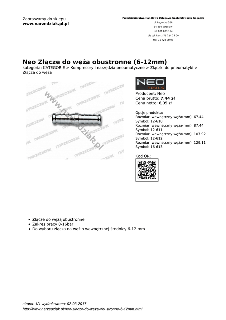 Zapraszamy do sklepu www.narzedziak.pl.pl Przedsiębiorstwo Handlowo Usługowe Gaabi Sławomir Gagatek ul. Legnicka 52A 54-204 Wrocław tel. 801 003 154 dla tel. kom.: 71 724 25 00 fax: 71 724 20 96 Neo Złącze do węża obustronne (6-12mm) kategoria: KATEGORIE > Kompresory i narzędzia pneumatyczne > Złączki do pneumatyki > Złącza do węża Producent: Neo Cena brutto: 7,44 zł Cena netto: 6,05 zł Opcje produktu: Rozmiar wewnętrzny Symbol: 12-610 Rozmiar wewnętrzny Symbol: 12-611 Rozmiar wewnętrzny Symbol: 12-612 Rozmiar wewnętrzny Symbol: 16-613 Kod QR: Złącze do wężą obustronne Zakres pracy 0-16bar Do wyboru złącza na wąż o wewnętrznej średnicy 6-12 mm strona: 1/1 wydrukowano: 02-03-2017 http://www.narzedziak.pl/neo-zlacze-do-weza-obustronne-6-12mm.html węża(mm): 67.44 węża(mm): 87.44 węża(mm): 107.92 węża(mm): 129.11