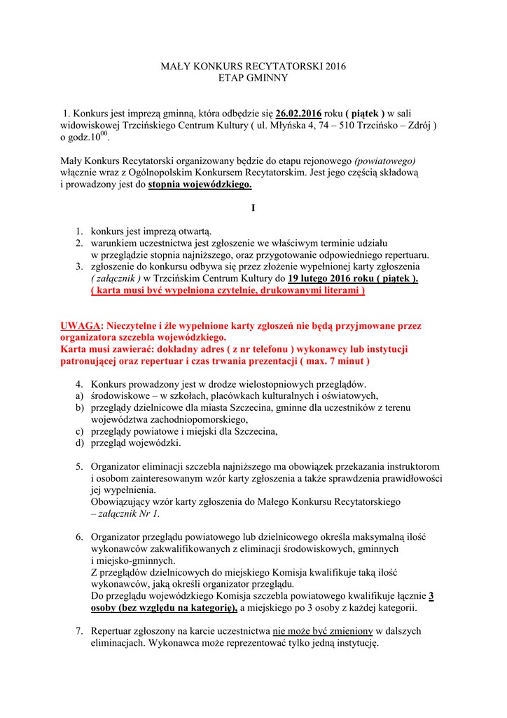 MAŁY KONKURS RECYTATORSKI 2016 ETAP GMINNY 1. Konkurs jest imprezą gminną, która odbędzie się 26.02.2016 roku ( piątek ) w sali widowiskowej Trzcińskiego Centrum Kultury ( ul. Młyńska 4, 74 – 510 Trzcińsko – Zdrój ) o godz.1000. Mały Konkurs Recytatorski organizowany będzie do etapu rejonowego (powiatowego) włącznie wraz z Ogólnopolskim Konkursem Recytatorskim. Jest jego częścią składową i prowadzony jest do stopnia wojewódzkiego. I 1. konkurs jest imprezą otwartą. 2. warunkiem uczestnictwa jest zgłoszenie we właściwym terminie udziału w przeglądzie stopnia najniższego, oraz przygotowanie odpowiedniego repertuaru. 3. zgłoszenie do konkursu odbywa się przez złożenie wypełnionej karty zgłoszenia ( załącznik ) w Trzcińskim Centrum Kultury do 19 lutego 2016 roku ( piątek ). ( karta musi być wypełniona czytelnie, drukowanymi literami ) UWAGA: Nieczytelne i źle wypełnione karty zgłoszeń nie będą przyjmowane przez organizatora szczebla wojewódzkiego. Karta musi zawierać: dokładny adres ( z nr telefonu ) wykonawcy lub instytucji patronującej oraz repertuar i czas trwania prezentacji ( max. 7 minut ) 4. Konkurs prowadzony jest w drodze wielostopniowych przeglądów. a) środowiskowe – w szkołach, placówkach kulturalnych i oświatowych, b) przeglądy dzielnicowe dla miasta Szczecina, gminne dla uczestników z terenu województwa zachodniopomorskiego, c) przeglądy powiatowe i miejski dla Szczecina, d) przegląd wojewódzki. 5. Organizator eliminacji szczebla najniższego ma obowiązek przekazania instruktorom i osobom zainteresowanym wzór karty zgłoszenia a także sprawdzenia prawidłowości jej wypełnienia. Obowiązujący wzór karty zgłoszenia do Małego Konkursu Recytatorskiego – załącznik Nr 1. 6. Organizator przeglądu powiatowego lub dzielnicowego określa maksymalną ilość wykonawców zakwalifikowanych z eliminacji środowiskowych, gminnych i miejsko-gminnych. Z przeglądów dzielnicowych do miejskiego Komisja kwalifikuje taką ilość wykonawców, jaką określi organizator przeglądu. Do przeglądu wojewódzkiego Komisja szczebla powiatowego kwalifikuje łącznie 3 osoby (bez względu na kategorię), a miejskiego po 3 osoby z każdej kategorii. 7. Repertuar zgłoszony na karcie uczestnictwa nie może być zmieniony w dalszych eliminacjach. Wykonawca może reprezentować tylko jedną instytucję. II 1. Uczestnicy konkursu występują w trzech kategoriach wiekowych: kat. I - uczniowie klas I – III kat. II - uczniowie klas IV – VI kat. III - uczniowie szkoły gimnazjalnej 2. Repertuar uczestników obejmuje dwa wiersze z publikowanej literatury dziecięcej dla recytatorów klas I – III, wiersz i prozę dla recytatorów klas IV – VI i gimnazjum. Łączny czas wykonywania repertuaru nie może przekraczać 7 minut. Ewidentne przekroczenie czasu prezentacji spowoduje jej przerwanie , co jest równoczesne z dyskwalifikacją uczestnika. III 1. Do oceny prezentacji konkursowych organizator powoła komisję 2. Komisja konkursowa dokonuje oceny wg następujących kryteriów: - dobór repertuaru ( wartości artystyczne utworów, ich dobór do możliwości wykonawczych uczestnika oraz wieku), - interpretacja utworów, - kultura słowa, - ogólny wyraz artystyczny. 3. Podstawą do sformułowania werdyktu jest wysłuchanie przez każdego członka Komisji – wszystkich uczestników przeglądu. 4. Ostateczny werdykt ustalony jest w drodze wspólnej dyskusji Komisji. 5. Każdy uczestnik może wystąpić tylko 1 raz w obecnej edycji konkursu. 6. Zwycięzcy konkursu przechodzą do dalszego etapu na szczeblu powiatowym w Centrum Kultury w Chojnie ( Plac Konstytucji 3 Maja, 74 – 500 Chojna ) dnia 11.03.2016 roku o godzinie 0900
