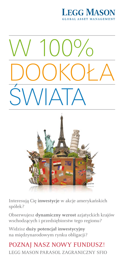 W 100% DOOKOŁA ŚWIATA Interesują Cię inwestycje w akcje amerykańskich spółek? Obserwujesz dynamiczny wzrost azjatyckich krajów wschodzących i przedsiębiorstw tego regionu? Widzisz duży potencjał inwestycyjny na międzynarodowym rynku obligacji? POZNAJ NASZ NOWY FUNDUSZ! LEGG MASON PARASOL ZAGRANICZNY SFIO SUBFUNDUSZ OCENA WYNIKÓW INWESTYCYJNYCH (MIN. PERSPEKTYWA) 5 lat Legg Mason Globalnych Zasobów 5 lat PROFIL ZYSKU/RYZYKA 1 234 5 1 234 5 67 Legg Mason Global Resources Fund Inwestycje w akcje głównie branży energetycznej, surowcowej, przemysłowej i użyteczności publicznej 67 Legg Mason QS MV Asia Pacific Ex Japan Equity Growth and Income Fund Potencjał akcji spółek notowanych lub prowadzących znaczną część działalności w regionie Azji Południowo-Wschodniej Azja Pd-Wsch: głównie Chiny, Hong Kong, Indonezja, Malezja, Filipiny, Singapur, Korea Południowa, Tajwan, Indie, Tajlandia Legg Mason ClearBridge US Aggressive Growth Fund Inwestycje w spółki amerykańskie o silnych fundamentach, wyraźnych przewagach konkurencyjnych oraz kompetentnym zarządzie USA 67 Legg Mason Opportunity Fund Wyjątkowe okazje inwestycyjne na wielu rynkach, w ramach różnych klas aktywów USA 67 Legg Mason Royce US Smaller Companies Fund Wysoki potencjał zysków, typowy dla segmentu małych i mikro przedsiębiorstw USA Legg Mason Western Asset Global Multi Strategy Fund Globalnie zdywersyfikowane inwestycje w instrumenty dłużne, poszukiwanie okazji inwestycyjnych w różnych regionach świata Globalne rynki papierów dłużnych Legg Mason Akcji Azjatyckich 5 lat Legg Mason Amerykańskich Spółek Wzrostowych 5 lat 1 234 56 1 234 5 7 Legg Mason Okazji Rynkowych 5 lat Legg Mason Małych Spółek Amerykańskich 3 lata Legg Mason Globalnych Papierów Dłużnych 1 234 5 1 23 PROFIL GEOGRAFICZNY SUBFUNDUSZU BAZOWEGO SUBFUNDUSZ BAZOWY 456 7 Minimalna kwota pierwszej i każdej kolejnej wpłaty na nabycie jednostek uczestnictwa wybranego subfunduszu wynosi 100 zł. Globalne rynki akcji surowcowych Źródłem informacji o profilu zysku/ryzyka są Kluczowe Informacje dla Inwestorów poszczególnych subfunduszy Legg Mason Parasol Zagraniczny SFIO, stan na dzień sporządzenia niniejszego materiału. Ważne informacje – przeczytaj uważnie Informacje na temat subfunduszy w ramach Legg Mason Parasol Zagraniczny SFIO („fundusz”), zarządzanego przez Legg Mason TFI SA („subfundusze”), zawarte są w prospekcie informacyjnym funduszu oraz w kluczowych informacjach dla inwestorów, które są dostępne na stronie internetowej www.leggmason.pl, w określonych punktach dystrybucji funduszu, jak również w formie pisemnej w siedzibie funduszu (Warszawa, ul. Bielańska 12). Prospekt informacyjny funduszu i kluczowe informacje dla inwestorów zawierają informacje niezbędne do oceny inwestycji, wskazują ryzyko uczestnictwa w funduszu, koszty, opłaty i informacje o podatkach. Przed zainwestowaniem w wybrany subfundusz należy zapoznać się z kluczowymi informacjami dla inwestorów dotyczącymi wybranej kategorii jednostki uczestnictwa subfunduszu, którego będzie dotyczyć zlecenie, jak również z prospektem informacyjnym funduszu. Indywidualna stopa zwrotu zależy od dnia nabycia oraz odkupienia jednostek uczestnictwa, a także od wielkości pobranych opłat manipulacyjnych i wysokości należnego podatku. Fundusz nie gwarantuje realizacji założonego celu inwestycyjnego, ani uzyskania określonego wyniku inwestycyjnego. Uczestnik funduszu musi liczyć się z możliwością utraty przynajmniej części wpłaconych środków. Fundusz lokuje aktywa poszczególnych subfunduszy głównie w lokaty inne niż papiery wartościowe lub instrumenty rynku pieniężnego (z zastrzeżeniem tytułów uczestnictwa funduszy zagranicznych). Subfundusze bazowe, o których mowa w niniejszym materiale, stanowiące podstawowy przedmiot lokat, określone są w stosunku do każdego z subfunduszy w prospekcie informacyjnym funduszu. Wartość aktywów netto LM Globalnych Zasobów, LM Akcji Azjatyckich, LM Amerykańskich Spółek Wzrostowych, LM Małych Spółek Amerykańskich oraz LM Okazji Rynkowych, wydzielonych w ramach LM Parasol Zagraniczny SFIO, może cechować się znaczną zmiennością ze względu na skład portfela inwestycyjnego. Niniejszy materiał ma wyłącznie charakter promocyjny, a zestawienia w nim zawarte należy traktować jako ilustrację, nie prognozę. Materiał ten nie stanowi oferty w rozumieniu Kodeksu cywilnego ani oferty publicznej w rozumieniu ustawy o ofercie publicznej i warunkach wprowadzania instrumentów finansowych do zorganizowanego systemu obrotu oraz o spółkach publicznych, doradztwa inwestycyjnego, innego rodzaju doradztwa, ani rekomendacji do zawarcia transakcji kupna lub sprzedaży jakiegokolwiek instrumentu finansowego, jak również innych informacji rekomendujących lub sugerujących strategie inwestycyjne. Legg Mason TFI SA, które zarządza funduszem, działa na podstawie decyzji z dnia 18.06.1998 r. wydanej przez Komisję Papierów Wartościowych i Giełd. XII2016