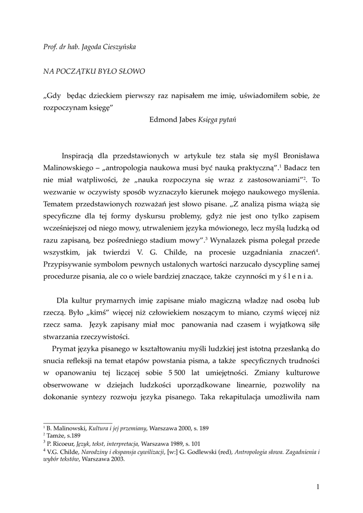 Prof. dr hab. Jagoda Cieszyńska NA POCZĄTKU BYŁO SŁOWO „Gdy będąc dzieckiem pierwszy raz napisałem me imię, uświadomiłem sobie, że rozpoczynam księgę” Edmond Jabes Księga pytań Inspiracją dla przedstawionych w artykule tez stała się myśl Bronisława Malinowskiego – „antropologia naukowa musi być nauką praktyczną”.1 Badacz ten nie miał wątpliwości, że „nauka rozpoczyna się wraz z zastosowaniami”2. To wezwanie w oczywisty sposób wyznaczyło kierunek mojego naukowego myślenia. Tematem przedstawionych rozważań jest słowo pisane. „Z analizą pisma wiążą się specyfczne dla tej formy dyskursu problemy, gdyż nie jest ono tylko zapisem wcześniejszej od niego mowy, utrwaleniem języka mówionego, lecz myślą ludzką od razu zapisaną, bez pośredniego stadium mowy”.3 Wynalazek pisma polegał przede wszystkim, jak twierdzi V. G. Childe, na procesie uzgadniania znaczeń4. Przypisywanie symbolom pewnych ustalonych wartości narzucało dyscyplinę samej procedurze pisania, ale co o wiele bardziej znaczące, także czynności m y ś l e n i a. Dla kultur prymarnych imię zapisane miało magiczną władzę nad osobą lub rzeczą. Było „kimś” więcej niż człowiekiem noszącym to miano, czymś więcej niż rzecz sama. Język zapisany miał moc panowania nad czasem i wyjątkową siłę stwarzania rzeczywistości. Prymat języka pisanego w kształtowaniu myśli ludzkiej jest istotną przesłanką do snucia refeksji na temat etapów powstania pisma, a także specyfcznych trudności w opanowaniu tej liczącej sobie 5 500 lat umiejętności. Zmiany kulturowe obserwowane w dziejach ludzkości uporządkowane linearnie, pozwoliły na dokonanie syntezy rozwoju języka pisanego. Taka rekapitulacja umożliwiła nam 1 B. Malinowski, Kultura i jej przemiany, Warszawa 2000, s. 189 Tamże, s.189 3 P. Ricoeur, Język, tekst, interpretacja, Warszawa 1989, s. 101 4 V.G. Childe, Narodziny i ekspansja cywilizacji, [w:] G. Godlewski (red), Antropologia słowa. Zagadnienia i wybór tekstów, Warszawa 2003. 2 1 (mnie i zespołowi moich pracowników) zbudowanie skutecznej terapii zaburzeń czytania i pisania. W gruncie rzeczy nie o sam mechanizm trudności tu idzie, a o konsekwencje braku zdolności czytania. Najtragiczniejszą grupą ludzi pozbawioną daru rozumienia pisma są niesłyszący, władający jedynie kodem migowym. Dramat tych osób polega nie tylko na wykluczeniu ze wspólnoty większości, ale przede wszystkim na odrębnym sposobie myślenia w świecie, gdzie tylko to co zapisane istnieje naprawdę. Równie bolesne doświadczenia są udziałem chorych z porażeniem mózgowym, autyzmem i afazją. Choć mają oni możliwość słuchania języka nie zawsze przekłada się ona na jego rozumienie, a niezmiernie rzadko na pełną umiejętność czytania i pisania. Zastosowanie pisma uformowało odmienne, w stosunku do społeczności oralnych, myślenie człowieka, dało możliwość opisywania światów odległych w czasie i przestrzeni, a tym samym pozwoliło człowiekowi przekroczyć pole własnego istnienia. „Bardziej niż jakikolwiek inny pojedynczy wynalazek pismo przekształca świadomość” – mówi Ong5. Być może pismo wyewoluowało z metod księgowania za pomocą kamiennych i glinianych liczmanów6. Już 8 000 lat p.n.e. wypalano z gliny tokeny i umieszczano je w glinianych pojemnikach, jak w kartotekach, a na nich wyciskano znaki. Taką samą funkcję pełniły kamienne calculi zaopatrzone w oznaczenia liczbowe. Rysunki umieszczone na tokenach stosowano potem jako symbole; przedstawiające obiekty np. owcę lub oliwę itp. Stało się to zalążkiem pisma, bo z czasem pojemniki zostały zastąpione przez tabliczki, a odciski przez wyryte znaki (V i VI tysiąclecie p.n.e.). Podobną funkcję musiały pełnić australijskie czuryngi – kawałki drewna lub kamienia z wyrytymi wzorami oznaczającymi miejscowości, rzeczy lub ludzi i zwierzęta. Naukowcy skłonni są więc przypuszczać, że pismo powstało z konieczności administracyjnych. Najstarszym dokumentem pisanym jest tabliczka z Uruk, pochodząca z IV wieku p.n.e., zawierająca umieszczone w kolumnach znaki rachunkowe7. Obok tych buchalteryjnych zapisów powstawały malowidła na ścianach jaskiń, swoiste mitogramy, będące formą przedstawień symbolicznych, pamiętników 5 W.J., Ong, Pismo a struktura świadomości, [w:] G. Godlewski (red), Antropologia słowa. Zagadnienia i wybór tekstów, Warszawa 2003. s. 368 6 Por. M. Kuckenburg, Mowa i pismo. Narodziny mowy i pisma, Warszawa 2006 7 G. Jean, Pismo-pamięć ludzkości, Wrocław, 1994 2 indywidualnych lub kronik zbiorowych, których sens musiał być przecież wyjaśniany językowo. To prapoczątki literatury. Rysunki naskalne i symbole były symultanicznym zapisem ogólnej idei, myśli, która był odczytywana, przez każdego nieco inaczej. Współczesna kultura nie możne w sposób jednoznaczny tych przekazów odbierać, choć badacze próbują je interpretować. Trzeba jednak znać kontekst, aby zrozumieć, co zostało symbolicznie „napisane”. Te obrazy nie są jeszcze pismem, jedynie jego zapowiedzią. Kuckenburg poszukując reliktów tego asocjacyjnego języka obrazowego odnalazł go także w zachodnich cywilizacjach, np. krzyż czy trzcina z gąbką mogą oznaczać: – mękę lub wprost Chrystusa, serce przebite strzałą – miłość, wąż Eskulapa – lekarza.8 Prymarne znaki pisma czyli piktogramy były symbolami rzeczy lub osób. Na tabliczce pochodzącej z Ur z 2360 r. p.n.e. widać wyraźnie rysunek przedstawiający osła (wydłużona głowa i szyja, uszy odchylone ku tyłowi). Do tej pory zidentyfkowano prawie 1 500 prymarnych piktogramów9. Wczesne tabliczki z pismem to, zdaniem Kuckenburga, nośniki informacji, jak dzisiejsze karty perforowane. Niektóre piktogramy utworzone przez różne cywilizacje, także współczesne, tworzone w metodach alternatywnej komunikacji, wykazują intrygujące podobieństwo.