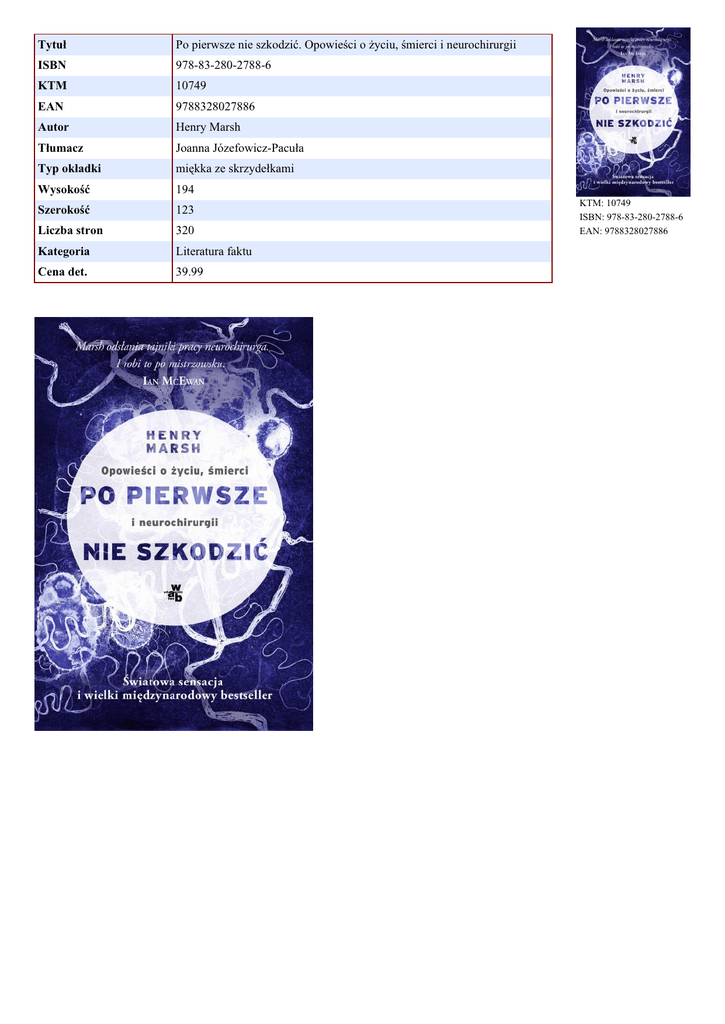 Tytuł Po pierwsze nie szkodzić. Opowieści o życiu, śmierci i neurochirurgii ISBN 978-83-280-2788-6 KTM 10749 EAN 9788328027886 Autor Henry Marsh Tłumacz Joanna Józefowicz-Pacuła Typ okładki miękka ze skrzydełkami Wysokość 194 Szerokość 123 Liczba stron 320 Kategoria Literatura faktu Cena det. 39.99 KTM: 10749 ISBN: 978-83-280-2788-6 EAN: 9788328027886