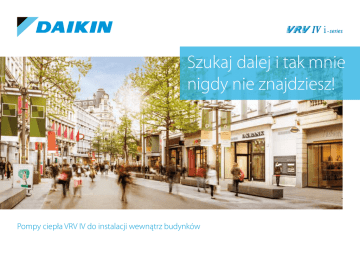 i Szukaj dalej i tak mnie nigdy nie znajdziesz! Pompy ciepła VRV IV do instalacji wewnątrz budynków Rozwiązanie niewidoczne Unikalne rozwiązanie jednostki zewnętrznej VRV Szukaj dalej i tak mnie nigdy nie znajdziesz! System VRV IV-i Daikin oferuje najbardziej estetyczne i zintegrowane rozwiązanie klimatyzacyjne na rynku. To szeroka oferta rozwiązań VRV przeznaczonych do każdej lokalizacji śródmiejskiej. Urządzenia charakteryzuje cicha praca oraz łatwość wtopienia się w otoczenie, dzięki czemu można uzyskać zgodność z przepisami budowlanymi. Dodatkowo wielką zaletą jest duża elastyczność prowadzenia instalacji. Dlaczego wybierać rozwiązania Daikin VRV IV-i ? Systemy klimatyzacyjne Daikin o wysokiej efektywności można instalować w najbardziej wymagających lokalizacjach. Te urządzenia są niewidoczne z poziomu ulicy. 2 Pełna integracja z architekturą otoczenia Całkowita elastyczność - instalacja w każdym miejscu w sklepie i w każdym typie budynku dzięki nieograniczonym możliwościom naszych rozwiązań Szybsze otwarcie obiektów - łatwiejsze i szybsze uzyskiwanie pozwoleń na budowę Zewnętrzne jednostki klimatyzacyjne można teraz zainstalować w miejscu, w którym nie było to wcześniej możliwe Bezproblemowe uzyskanie zgodności z przepisami dotyczącymi posadowienia agregatów, najlepsze rozwiązanie do lokalizacji miejskich, takich jak banki, sklepy i prawie każde inne miejsce, które przyjdzie Ci do głowy Efektywność, komfort i kontrola - Daikin VRV Najwyższy wskaźnik efektywności sezonowej w swojej klasie (ESEER), a to oznacza niższe zużycie energii, mniejsze koszty i obniżenie emisji CO2 Unikalna funkcja zmiennej temperatury czynnika chłodniczego eliminuje zimne przeciągi i nieprzerwanie dostosowuje pracę urządzenia do rzeczywistych warunków, maksymalizując w ten sposób efektywność sezonową Scentralizowane, proste w obsłudze sterowniki zapewniają optymalne działanie, maksymalizują efektywność i komfort Cicha praca Dzięki niskim poziomom głośności w czasie pracy, rozwiązanie to nadaje się idealnie do gęsto zabudowanych obszarów, takich jak centra miast Elastyczna instalacja Niezrównana elastyczność, ponieważ urządzenie jest podzielone na dwie części: wymiennik ciepła i sprężarkę Niewielka waga urządzeń skraca czas instalacji i zmniejsza wysiłek Kompaktowe wymiary maksymalizują przestrzeń użytkową w pomieszczeniu Niewidoczna elastyczność VRV Najlepsze wsparcie po sprzedaży Wsparcie tam, gdzie go potrzebujesz dzięki rozległej sieci wysoce wykwalifikowanych profesjonalistów Profesjonalne narzędzia doboru oraz znakomite wsparcie ekspertów pozwalają skrócić czas instalacji, zapewniają optymalne działanie urządzeń oraz pozwalają obniżyć koszty eksploatacji Dedykowane tryby pracy jeszcze bardziej obniżają poziom dźwięku, dzięki czemu urządzenie jest zgodne z przepisami dotyczącymi emisji hałasu w centrach miast 3 Unikalna koncepcja VRV IV seria i 5 z patentami Sekret miasta VRV IV seria i to naprawdę wyjątkowe rozwiązanie do instalacji w miejscach, w których ma być całkowicie niewidoczne. System instaluje się w całości wewnątrz budynku, widoczne są tylko kratki wentylacyjne na elewacji. Oferta dedykowana do instalacji wewnątrz budynku Rozwiązanie niewidoczne Rozwiązanie intuicyjne ›› ›› ›› ›› ›› 4 Możesz rozważyć zastosowanie w wielu budynkach ponieważ instalacja agregatu wewnątrz nie stanowi już przeszkody Możesz szybciej otworzyć działalność, ponieważ uzyskanie pozwolenia na budowę jest dużo prostsze Nie potrzebujesz stawiać agregatu na dachu lub przy budynku Szybsza i bardziej wydajna instalacja minimalizuje koszty ›› ›› Rozdzielona jednostka zewnętrzna oferuje niezrównaną elastyczność Łatwy i szybki transport, a do instalacji potrzebne są tylko 2 osoby Łatwy serwis, dostępność do wszystkich podzespołów Rozwiązanie inteligentne ›› ›› ›› ›› Zmienna temperatura czynnika chłodniczego decyduje o najlepszej efektywności sezonowej i gwarantuje najwyższy komfort Opatentowany wymiennik ciepła V-shape zapewnia najbardziej kompaktowe urządzenie, jakie kiedykolwiek było dostępne na rynku (wysokość 400 mm) Wentylator odśrodkowy dla najwyższej efektywności Wydajność wentylatora sterowanego inwerterem można dostosować w zależności od oporów instalacji kanałowej Aby ukryć kratki wentylcyjne można umieścić na fasadzie budynku elementy dekoracyjne (dekory, logo) co sprawi, że instalacja będzie całkowicie niewidoczna z poziomu ulicy. Można także uzgodnić wygląd krat na poziomie wykonywania projektu, aby stały się integralną częścią wyglądu budynku. 7 VRV IV seria i Wymiennik Kompaktową i łatwą do ukrycia sprężarkę można zainstalować na poziomie podłogi, na zapleczu, w magazynie, w pomieszczeniu technicznym lub w kuchni, a wymiennik ciepła można zainstalować w przestrzeni stropu podwieszonego. To oznacza, że system klimatyzacji jest całkowicie niewidoczny, a oprócz tego nie zajmuje komercyjnej powierzchni handlowej. ciepła Elastyczne rozwiązanie z prostą instalacją Maks. 70 m Maks. 30 m Jednostki wewnętrzne Unikalna rozdzielona jednostka zewnętrzna do instalacji wewnątrz budynku ›› ›› VRV ›› ›› Sprężarka ›› 8 Niezrównana elastyczność, ponieważ jednostka zewnętrzna jest podzielona na dwie części Krótsze przewody prowadzące do jednostek wewnętrznych obniżają koszty instalacji Lekka konstrukcja - do instalacji potrzebne tylko 2 osoby Instalację można przeprowadzić w dowolny sposób ponieważ wentylator z napędem inwerterowym pozwala dostosować ESP do długości przewodów Uchylna skrzynka elektryczna umożliwia łatwy dostęp do wszystkich części sprężarki uchylna skrzynka elektryczna VRV IV seria i Nowatorskie technologie Wymiennik ciepła V-shape ›› ›› ›› Rewolucyjny, nowy projekt na ryn