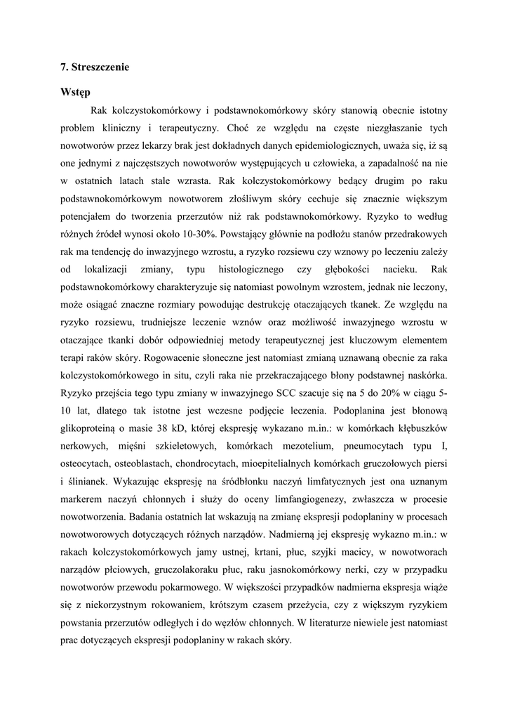 7. Streszczenie Wstęp Rak kolczystokomórkowy i podstawnokomórkowy skóry stanowią obecnie istotny problem kliniczny i terapeutyczny. Choć ze względu na częste niezgłaszanie tych nowotworów przez lekarzy brak jest dokładnych danych epidemiologicznych, uważa się, iż są one jednymi z najczęstszych nowotworów występujących u człowieka, a zapadalność na nie w ostatnich latach stale wzrasta. Rak kolczystokomórkowy bedący drugim po raku podstawnokomórkowym nowotworem złośliwym skóry cechuje się znacznie większym potencjałem do tworzenia przerzutów niż rak podstawnokomórkowy. Ryzyko to według różnych źródeł wynosi około 10-30%. Powstający głównie na podłożu stanów przedrakowych rak ma tendencję do inwazyjnego wzrostu, a ryzyko rozsiewu czy wznowy po leczeniu zależy od lokalizacji zmiany, typu histologicznego czy głębokości nacieku. Rak podstawnokomórkowy charakteryzuje się natomiast powolnym wzrostem, jednak nie leczony, może osiągać znaczne rozmiary powodując destrukcję otaczających tkanek. Ze względu na ryzyko rozsiewu, trudniejsze leczenie wznów oraz możliwość inwazyjnego wzrostu w otaczające tkanki dobór odpowiedniej metody terapeutycznej jest kluczowym elementem terapi raków skóry. Rogowacenie słoneczne jest natomiast zmianą uznawaną obecnie za raka kolczystokomórkowego in situ, czyli raka nie przekraczającego błony podstawnej naskórka. Ryzyko przejścia tego typu zmiany w inwazyjnego SCC szacuje się na 5 do 20% w ciągu 510 lat, dlatego tak istotne jest wczesne podjęcie leczenia. Podoplanina jest błonową glikoproteiną o masie 38 kD, której ekspresję wykazano m.in.: w komórkach kłębuszków nerkowych, mięśni szkieletowych, komórkach mezotelium, pneumocytach typu I, osteocytach, osteoblastach, chondrocytach, mioepitelialnych komórkach gruczołowych piersi i ślinianek. Wykazując ekspresję na śródbłonku naczyń limfatycznych jest ona uznanym markerem naczyń chłonnych i służy do oceny limfangiogenezy, zwłaszcza w procesie nowotworzenia. Badania ostatnich lat wskazują na zmianę ekspresji podoplaniny w procesach nowotworowych dotyczących różnych narządów. Nadmierną jej ekspresję wykazno m.in.: w rakach kolczystokomórkowych jamy ustnej, krtani, płuc, szyjki macicy, w nowotworach narządów płciowych, gruczolakoraku płuc, raku jasnokomórkowy nerki, czy w przypadku nowotworów przewodu pokarmowego. W większości przypadków nadmierna ekspresja wiąże się z niekorzystnym rokowaniem, krótszym czasem przeżycia, czy z większym ryzykiem powstania przerzutów odległych i do węzłów chłonnych. W literaturze niewiele jest natomiast prac dotyczących ekspresji podoplaniny w rakach skóry. Cel pracy Celem pracy była ocena ekspresji podoplaniny oraz unaczynienia chłonnego w rakach skóry, rogowaceniu słonecznym oraz w skórze zdrowej. Ocena dotyczyła zarówno podścieliska nowotworowego jak i masy guza. Jako cel wyznaczono również porównanie otrzymanych wyników średnich ekspresji w podścielisku i w masie ocenianych zmian oraz ocena ewentualnych korelacji ekspresji podoplaniny ze średnią wartością naczyń chlonnych. Materiał i metody: Do analizy włączono materiał tkankowy pobrany od 134 pacjentów leczonych w Katedrze i Klinice Dermatologii, Wenerologii i Alergologii Uniwersytetu Medycznego we Wrocławiu w latach 2004-2012. Badaną grupę stanowiło 57 pacjentów z potwierdzonym histopatologicznie rakiem kolczystokomórkowym skóry, 38 osób z rozpoznaniem raka podstawnokomórkowego skóry, oraz 20 osób z rogowaceniem słonecznym. Grupę kontrolną stanowiło 19 pacjentów, od których pobrano wycinki ze skóry zdrowej. Po dokonaniu oceny histologicznej przeprowadzono badania immunohistochemiczne z użyciem przeciwciała monoklonalnego D2-40 w celu określenia ekspresji podoplaniny oraz oznaczenia naczyń chłonnych. Ocenę ekspresji dokonano przy użyciu półilościowej skali wg Remmele (IRS) uwzględniającej natężenie reakcji barwnej, jak i odsetek komórek, w których obserwuje się reakcję. Wyniki: Średnia ekspresja podoplaniny zarówno w przypadku podścieliska jak i masy nowotworu była najwyższa dla raka kolczystokomórkowego (p<0,001), natomiast średnie ekspresje w podścielisku raka podstawnokomórkowego, rogowacenia słonecznego i w skórze właściwej nie różniły się istotnie między sobą (p>0,05). W przypadku średniej gęstości naczyń chłonnych nie wykazano różnic między rakiem podstawnokomórkowym i kolczystokomórkowym zarówno w podścielisku, jak i w masie guza (p>0,05). Nie wykazano również, aby średnia gęstość naczyń chłonnych różniła się w zależności od stopnia nasilenia ekspresji podoplaniny w podścielisku i masie nowotworu w przypadku wszystkich ocenianych zmian (p>0,05), stwierdzono natomiast dodatnią korelację między średnią ekspresją podoplaniny a średnią gęstością naczyń chłonnych w masie raka kolczystokomórkowego. W odniesieniu do poszczególnych zmian, wykazano, iż w przypadku podścieliska raka kolczystokomórkowego średnia ekspresja podoplaniny była wyższa dla postaci nierogowaciejącej w porównaniu do postaci rogowaciejącej (p=0,005), natomiast w komórkach nowotworowych w typie nierogowaciejącego obserwowano niższą średnią ekspresją w porównaniu do typu rogowaciejącego. Wnioski: Ekspresja podoplaniny w raku kolczystokomórkowym zarówno w masie guza jak i w podścielisku jest wyższa niż w raku podstawnokomórkowym, rogowaceniu słonecznym i w skórze zdrowej, natomiast ekspresja podoplaniny w raku podstawnokomórkowym i w rogowaceniu słonecznym (oceniana w masie zmiany i podścielisku) nie wykazuje różnic i jest podobna do ekspresji stwierdzanej w skórze zdrowej. Liczba naczyń chłonnych w raku kolczystokomórkowym i podstawnokomórkowym, zarówno w masie guza jak i w podścielisku, nie różni się między sobą, jest natomiast większa w porównaniu do ognisk rogowacenia