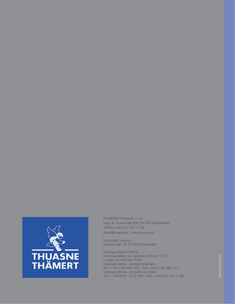 THUASNE Polska sp .z o.o. Łazy, Al. Krakowska 202, 05-552 Magdalenka Tel/Fax: +48 (22) 757 77 36 [email protected] · www.thuasne.pl Obsługa klienta-infolinia: od poniedziałku do czwartku 8:00 do 17:00, w piątki od 8:00 do 16:00 Obsługa klienta - produkcja seryjna: Tel.: +49 5139 988-205 · Fax: +49 5139 988-177 Obsługa klienta - produkty na miarę: Tel.+: +49 6451 7212-180 · Fax: +49 6451 7212-980 TM13431BDD12120323 THUASNE Niemcy Hauptstraße 16, D-35099 Burgwald LYMPHATREX ® Odzież kompresyjna stosowana w leczeniu obrzęków Delikatny ucisk - silne działanie LYMPHATREX ® – lepsza jakość życia dzięki skutecznemu działaniu ucisku Trwałe sukcesy w leczeniu dzięki zindywidualizowanemu podejściu Ucisk - wraz z drenażem limfatycznym, pielęgnacją skóry i terapią ruchową - jest centralnym elementem leczenia obrzęków. W fazie stabilizacyjnej i zachowawczej kompleksowej fizjoterapii przeciwobrzękowej (KPE 2) mają zastosowanie produkty z materiałów o krótkim naciągu z płaskim szwem, które są produkowane dla pacjentów na miarę. Wskazania • Pierwotny lub wtórny obrzęk limfatyczny • Obrzęk lipidowy • Obrzęk lipidowo-limfatyczny Czynnikami, które wpływają na to, czy chorzy stosują produkt - oprócz wybranych przetestowanych dermatologicznie materiałów, które gwarantują oczekiwany efekt leczniczy - są: optymalne dopasowanie do budowy anatomicznej i wysoka jakość wykonania. Jest to wymóg podstawowy, aby chorzy regularnie stosowali produkty uciskowe, do których mają zaufanie, niezależnie od tego, czy będą to pończochy, nakładki na palce u stóp, bandaże na rękę czy też produkty zakładane na górną część ciała. Dzięki wygodzie noszenia, specjalnej technologii ukształtowania w okolicach stawowych, właściwościom przyjaznym skórze i stonowanej kolorystyce, produkty LYMPHATREX® są bardziej akceptowane przez pacjentów. THUASNE THÄMERT oferuje produkty na miarę i wysokiej jakości produkty seryjne (biustonosze). Nasz personel jest gotów udzielić Państwu wszelkiej pomocy i kompetentnego doradztwa w kwestiach pielęgnacji w często niezwykle wymagającym przebiegu choroby, w kwestii wykonywania pomiarów u pacjentów oraz w kwestiach dostawy. • Obrzęk żylno-limfatyczny • Zastoje krwi wskutek unieruchomienia (zespół przekrwienia pochodzenia stawowego, niedowłady i niedowłady częściowe kończyn) Doradztwo i obsługa w dobrych rękach Doradztwo Produkty uciskowe LYMPHATREX® są ważnym elementem codziennego życia pacjentów. Gwarantują skuteczne efekty ucisku, a dzięki strukturze o dużych oczkach i właściwościom materiałów o krótkim naciągu stanowią uzupełnienie innych kluczowych elementów kompleksowej fizjoterapii przeciwobrzękowej takich jak terapia ruchowa. W celu osiągnięcia trwałej poprawy ważne jest regularne noszenie wyrobu uciskowego. Tylko wówczas osiągnie się zamierzony efekt. Kompetentny i empatyczny doradca ma w tej sprawie znaczenie kluczowe, gdyż produkty LYMPHATREX® są równie zindywidualizowane, jak sam pacjent. Udzielamy Państwu kompleksowego wsparcia, zarówno w kwestiach merytorycznych dotyczących materiałów i dokonywania pomiarów, jak również w kwestiach praktycznych związanych z zamawianiem, zakładaniem i noszeniem wyrobów uciskowych. Dopasowanie Poszerzamy Państwa wiedzę dotyczącą dokładnego dokonywania pomiarów i szkolimy Państwa z wykorzystaniem przejrzystych arkuszy pomiarowych. Przygotowujemy Państwa starannie do pracy z pacjentami o szczególnych wymaganiach, cierpiących na choroby układu limfatycznego, których przebieg niekiedy wymaga szczególnej opieki. Dokonywanie pomiarów tworzy podstawę zaufania pomiędzy pacjentem a Państwem i stanowi fundament dla akceptacji wyrobów uciskowych LYMPHATREX® przez pacjenta. Wybór Wyroby uciskowe LYMPHATREX® zapewniają wybór wysoce specyficznych dzianin o niezwykłych właściwościach dostosowanych do różnorodnych potrzeb medycznych i wymogów związanych z użytkowaniem. Produkty LYMPHATREX® Fine łatwo się zakłada i charakteryzuje je największa przyjazność dla skóry oraz niezwykły komfort noszenia. Produkty LYMPHATREX® Poly zostały opracowane z myślą o aktywnych pacjentach. Przyjemne w noszeniu mikrowłókna poliamidowe sprawiają, że pot szybko paruje, a produkty, z których zostały wykonane, szybko wysychają. Oba materiały są zaliczane do 2 klasy kompresji. Jeśli stadium obrzęku, który jest leczony wymaga silniejszego ucisku, najlepszym wyborem są nasze produkty z linii Fine Strong i Poly Strong o odpowiednio silniejszych właściwościach. Dzięki wyższej zawartości elastanu w dzianinie można osiągnąć wyższe klasy kompresji przy pełnym zachowaniu znakomitych właściwości noszenia. Wszystkie rodzaje dzianin dostępne są w dwóch kolorach. Wszystkie opcje wykończenia są dobierane i dopasowywane indywidualnie. Wykonanie Warunkiem perfekcji użytkowania wyrobów uciskowych LYMPHATREX® jest ich wykonanie na miarę. Na podstawie indywidualnie wykonywanych pomiarów ciała opracowywany jest wzór wyrobu, który zostaje przekazany bezpośrednio do naszego urządzenia produkcyjnego. Nawet nasz produkt seryjny biustonosz LYMPHATREX® jest tak zindywidualizowany, jak jego posiadaczka. Dzięki 30 różnym rozmiarom seryjnym, regulowanym ramiączkom i opcjonalnym kieszonkom na epitezę możliwe jest optymalne osiągnięcie celu leczniczego, a ponadto produkty te są wygodne w noszeniu. Szkolenie Podczas specjalnych warsztatów szkolimy Państwa, jak wykonywać właściwe pomiary i dobierać odpowiednie opcje wykończenia. Uzyskują Państwo wiedzę specjalistyczną w celu zapewnienia indywidualnej pomocy i kompetentnego doradztwa pacjentom z obrzękami. Niezależnie od tego nasz kompetentny personel wewnętrzny i zewnętrzny chętnie służy Państwu radą i pomocą. Kompleksowa pielęgnacja z zastosowaniem produktów LYMPHATREX ® poprzez: profesjonalne doradztw