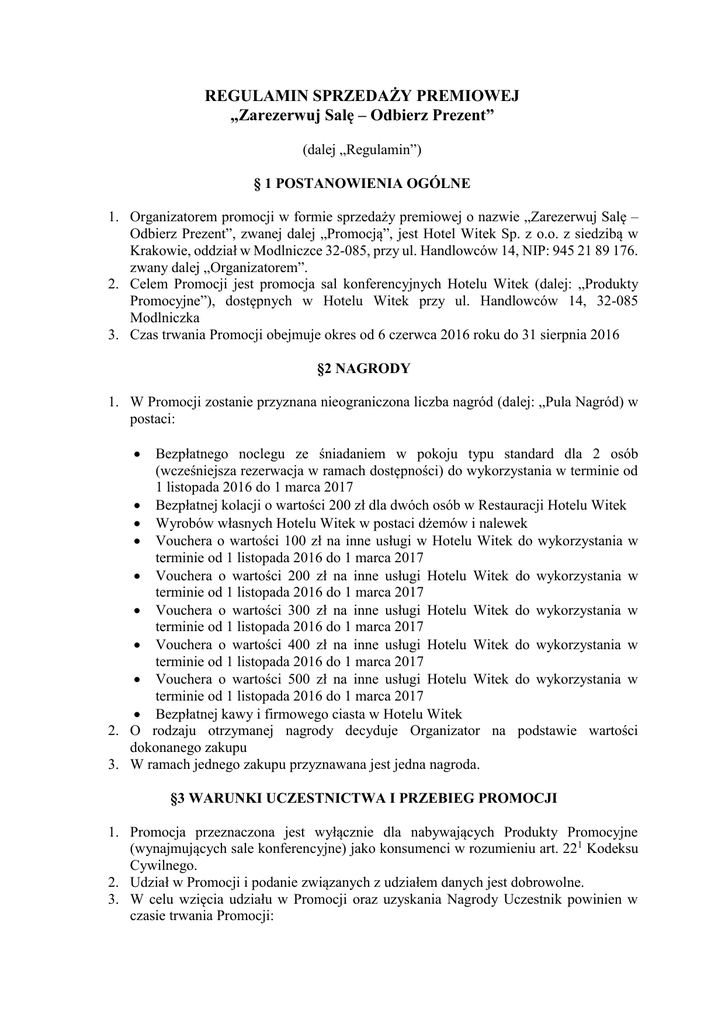 REGULAMIN SPRZEDAŻY PREMIOWEJ „Zarezerwuj Salę – Odbierz Prezent” (dalej „Regulamin”) § 1 POSTANOWIENIA OGÓLNE 1. Organizatorem promocji w formie sprzedaży premiowej o nazwie „Zarezerwuj Salę – Odbierz Prezent”, zwanej dalej „Promocją”, jest Hotel Witek Sp. z o.o. z siedzibą w Krakowie, oddział w Modlniczce 32-085, przy ul. Handlowców 14, NIP: 945 21 89 176. zwany dalej „Organizatorem”. 2. Celem Promocji jest promocja sal konferencyjnych Hotelu Witek (dalej: „Produkty Promocyjne”), dostępnych w Hotelu Witek przy ul. Handlowców 14, 32-085 Modlniczka 3. Czas trwania Promocji obejmuje okres od 6 czerwca 2016 roku do 31 sierpnia 2016 §2 NAGRODY 1. W Promocji zostanie przyznana nieograniczona liczba nagród (dalej: „Pula Nagród) w postaci: Bezpłatnego noclegu ze śniadaniem w pokoju typu standard dla 2 osób (wcześniejsza rezerwacja w ramach dostępności) do wykorzystania w terminie od 1 listopada 2016 do 1 marca 2017 Bezpłatnej kolacji o wartości 200 zł dla dwóch osób w Restauracji Hotelu Witek Wyrobów własnych Hotelu Witek w postaci dżemów i nalewek Vouchera o wartości 100 zł na inne usługi w Hotelu Witek do wykorzystania w terminie od 1 listopada 2016 do 1 marca 2017 Vouchera o wartości 200 zł na inne usługi Hotelu Witek do wykorzystania w terminie od 1 listopada 2016 do 1 marca 2017 Vouchera o wartości 300 zł na inne usługi Hotelu Witek do wykorzystania w terminie od 1 listopada 2016 do 1 marca 2017 Vouchera o wartości 400 zł na inne usługi Hotelu Witek do wykorzystania w terminie od 1 listopada 2016 do 1 marca 2017 Vouchera o wartości 500 zł na inne usługi Hotelu Witek do wykorzystania w terminie od 1 listopada 2016 do 1 marca 2017 Bezpłatnej kawy i firmowego ciasta w Hotelu Witek 2. O rodzaju otrzymanej nagrody decyduje Organizator na podstawie wartości dokonanego zakupu 3. W ramach jednego zakupu przyznawana jest jedna nagroda. §3 WARUNKI UCZESTNICTWA I PRZEBIEG PROMOCJI 1. Promocja przeznaczona jest wyłącznie dla nabywających Produkty Promocyjne (wynajmujących sale konferencyjne) jako konsumenci w rozumieniu art. 221 Kodeksu Cywilnego. 2. Udział w Promocji i podanie związanych z udziałem danych jest dobrowolne. 3. W celu wzięcia udziału w Promocji oraz uzyskania Nagrody Uczestnik powinien w czasie trwania Promocji: 4. 5. 6. 7. 1. zakupić w Hotelu Witek usługi wynajęcia Sali lub usługi wynajęcia Sali oraz usług komplementarnych (przerwy kawowe dla uczestników konferencji, obiady dla uczestników konferencji, noclegi dla uczestników konferencji) za minimum 100 zł brutto. 2. okazać paragon fiskalny lub Fakturę świadczący o ich zakupie u Organizatora 3. zezwolić przedstawicielowi Organizatora na dokonanie stosownej adnotacji na paragonie fiskalnym lub FV 4. odebrać Nagrodę w Hotelu Witek Wykonanie czynności wymienionych w ust. 4 stanowić będzie zgłoszenie Uczestnika do Promocji (dalej „Zgłoszenie”). Uczestnik może dokonać wielu Zgłoszeń i otrzymać odpowiadającą ich liczbie ilość Nagród, przy czym na każde zgłoszenie musi przypadać odrębny paragon lub faktura potwierdzające zakup, z różnymi datami (paragony i faktury z tego samego dnia traktowane są jako jeden dowód zakupu) Wydawanie Nagród w Hotelu Witek odbywać się będzie we wszystkie dni czasu Trwania Promocji. Nagroda zostanie wydana Uczestnikowi bezpośrednio po stwierdzeniu przez pracownika Hotelu Witek, iż Uczestnik dokonał prawidłowego Zgłoszenia do Promocji. §4 POSTĘPOWANIE REKLAMACYJNE 1. Wszelkie reklamacje dotyczące sposobu przeprowadzenia Promocji Uczestnicy winni zgłaszać na piśmie u Organizatora 2. Pisemna reklamacja powinna zawierać imię, nazwisko i dokładny adres Uczestnika oraz dokładny opis i uzasadnienie reklamacji. 3. Reklamacje rozpatrywane będą przez Organizatora w terminie 7 (siedmiu) dni od daty ich otrzymania. 4. Uczestnik zostanie o sposobie rozpatrzenia reklamacji powiadomiony listem poleconym na adres podany w reklamacji, lub pocztą elektroniczną, wysłanym w terminie 7 (siedmiu) dni od daty rozpatrzenia danej reklamacji. 5. Roszczenia nierozpatrzone lub nie uwzględnione w postępowaniu reklamacyjnym mogą być dochodzone przed sądem powszechnym. §5 POSTANOWIENIA KOŃCOWE 1. Niniejszy Regulamin dostępny jest w Hotelu Witek oraz na stronie internetowej www.hotelwitek.pl 2. Organizator zastrzega sobie prawo wprowadzenia zmian w niniejszym Regulaminie, w każdym czasie bez podania przyczyny. Zmiany w regulaminie nie mogą jednak naruszać praw nabytych przez Uczestników.