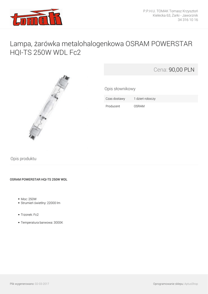 P.P.H.U. TOMAK Tomasz Krzysztoń Kielecka 63, Żarki - Jaworznik 34 316 10 16 Lampa, żarówka metalohalogenkowa OSRAM POWERSTAR HQI-TS 250W WDL Fc2 Cena: 90,00 PLN Opis słownikowy Czas dostawy 1 dzień roboczy Producent OSRAM Opis produktu OSRAM POWERSTAR HQI-TS 250W WDL Moc: 250W Strumień świetlny: 22000 lm Trzonek: Fc2 Temperatura barwowa: 3000K Plik wygenerowano: 02-03-2017 Powered by TCPDF (www.tcpdf.org) Oprogramowanie sklepu: AptusShop