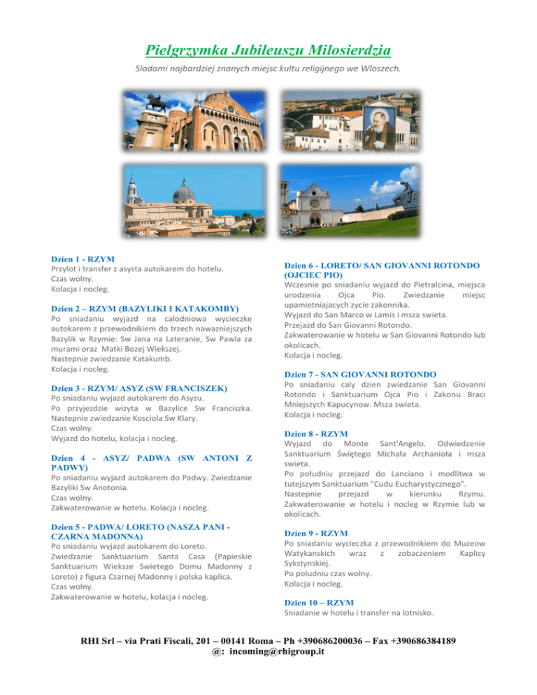 Pielgrzymka Jubileuszu Milosierdzia Sladami najbardziej znanych miejsc kultu religijnego we Wloszech. Dzien 1 - RZYM Przylot i transfer z asysta autokarem do hotelu. Czas wolny. Kolacja i nocleg. Dzien 2 – RZYM (BAZYLIKI I KATAKOMBY) Po sniadaniu wyjazd na calodniowa wycieczke autokarem z przewodnikiem do trzech nawazniejszych Bazylik w Rzymie: Sw Jana na Lateranie, Sw Pawla za murami oraz Matki Bozej Wiekszej. Nastepnie zwiedzanie Katakumb. Kolacja i nocleg. Dzien 3 - RZYM/ ASYZ (SW FRANCISZEK) Po sniadaniu wyjazd autokarem do Asyzu. Po przyjezdzie wizyta w Bazylice Sw Franciszka. Nastepnie zwiedzanie Kosciola Sw Klary. Czas wolny. Wyjazd do hotelu, kolacja i nocleg. Dzien 4 - ASYZ/ PADWA (SW ANTONI Z PADWY) Po sniadaniu wyjazd autokarem do Padwy. Zwiedzanie Bazyliki Sw Anotonia. Czas wolny. Zakwaterowanie w hotelu. Kolacja i nocleg. Dzien 5 - PADWA/ LORETO (NASZA PANI CZARNA MADONNA) Po sniadaniu wyjazd autokarem do Loreto. Zwiedzanie Sanktuarium Santa Casa (Papieskie Sanktuarium Wieksze Swietego Domu Madonny z Loreto) z figura Czarnej Madonny i polska kaplica. Czas wolny. Zakwaterowanie w hotelu, kolacja i nocleg. Dzien 6 - LORETO/ SAN GIOVANNI ROTONDO (OJCIEC PIO) Wczesnie po sniadaniu wyjazd do Pietralcina, miejsca urodzenia Ojca Pio. Zwiedzanie miejsc upamietniajacych zycie zakonnika. Wyjazd do San Marco w Lamis i msza swieta. Przejazd do San Giovanni Rotondo. Zakwaterowanie w hotelu w San Giovanni Rotondo lub okolicach. Kolacja i nocleg. Dzien 7 - SAN GIOVANNI ROTONDO Po sniadaniu caly dzien zwiedzanie San Giovanni Rotondo i Sanktuarium Ojca Pio i Zakonu Braci Mniejszych Kapucynow. Msza swieta. Kolacja i nocleg. Dzien 8 - RZYM Wyjazd do Monte Sant'Angelo. Odwiedzenie Sanktuarium Świętego Michała Archanioła i msza swieta. Po południu przejazd do Lanciano i modlitwa w tutejszym Sanktuarium "Cudu Eucharystycznego". Nastepnie przejazd w kierunku Rzymu. Zakwaterowanie w hotelu i nocleg w Rzymie lub w okolicach. Dzien 9 - RZYM Po sniadaniu wycieczka z przewodnikiem do Muzeow Watykanskich wraz z zobaczeniem Kaplicy Sykstynskiej. Po poludniu czas wolny. Kolacja i nocleg. Dzien 10 – RZYM Sniadanie w hotelu i transfer na lotnisko. RHI Srl – via Prati Fiscali, 201 – 00141 Roma – Ph +390686200036 – Fax +390686384189 @: [email protected]