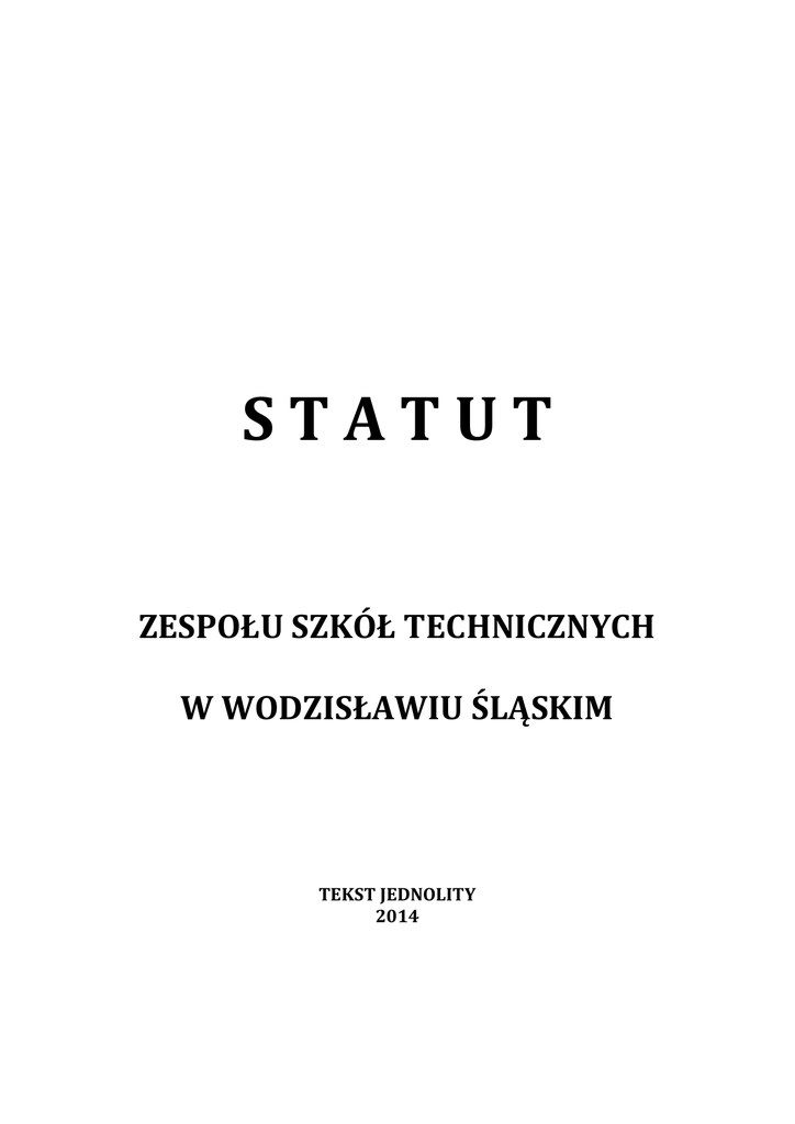STATUT ZESPOŁU SZKÓŁ TECHNICZNYCH W WODZISŁAWIU ŚLĄSKIM TEKST JEDNOLITY 2014 Statut Zespołu Szkół Technicznych w Wodzisławiu Śląskim STATUT ZESPOŁU SZKÓŁ TECHNICZNYCH W WODZISŁAWIU ŚL. POSTANOWIENIA WSTĘPNE Statut określa nazwę szkoły, jej cele i zadania, organ prowadzący szkołę, organy szkoły i ich kompetencje, organizację szkoły, zasady rekrutacji uczniów, ich prawa i obowiązki oraz procedury tworzenia i dokonywania zmian w WSO. Ilekroć w statucie jest mowa o "szkole" należy przez to rozumieć Zespół Szkół Technicznych. Statut został opracowany na podstawie przepisów: - Ustawy o Systemie Oświaty z dnia 7 września 1991r. (Dz.U. Nr 95, poz. 425, z późn. zmianami); - Rozporządzenia Ministra Edukacji Narodowej i Sportu z dnia 21.05.2001 (Dz.U. Nr 61 poz. 624) ze zmianami z dnia 9.02.2007 (Dz. U. Nr 35 poz. 222 z dnia 9.02.2007). w sprawie ramowych statutów publicznego przedszkola oraz publicznych szkół; NAZWA SZKOŁY §1 Nazwa szkoły brzmi: Zespół Szkół Technicznych w Wodzisławiu Śląskim §2 Zespół Szkół Technicznych w Wodzisławiu Śl. jest szkołą publiczną. Czas trwania szkoły jest nieograniczony. §3 Siedzibą Zespołu Szkół Technicznych jest miasto Wodzisław Śląski: Adres: Zespół Szkół Technicznych 44-300 Wodzisław Śl. ul. Pszowska 92 tel. 032 456 27 20, 032 456 26 24 fax. 032 456 27 20 strona: www.zstwodzislaw.net e-mail: [email protected] §4 Organem prowadzącym szkołę jest Powiat Wodzisławski. Organem nadzoru pedagogicznego jest Śląski Kurator Oświaty. 2 Statut Zespołu Szkół Technicznych w Wodzisławiu Śląskim §5 W skład Zespołu Szkół Technicznych wchodzą następujące szkoły: − Technikum Nr 3 im. rtm. Witolda Pileckiego, − III Liceum Ogólnokształcące z oddziałami sportowymi im. rtm. Witolda Pileckiego, − Zasadnicza Szkoła Zawodowa Nr 2 im. rtm. Witolda Pileckiego, §6 Szkoła używa nazwy Zespół Szkół Technicznych oraz nazw szkół wchodzących w jego skład w pełnym brzmieniu. INFORMACJE O SZKOLE §7 Zespół Szkół składa się z następujących typów szkół: 1. Technikum Nr 3 im. rtm. Witolda Pileckiego podbudowa programowa gimnazjum czas trwania nauki 4 lata Młodzież klas I, II i III kształci się w zawodach (wg nowej podstawy programowej): - technik budownictwa, - technik elektronik, - technik informatyk, - technik teleinformatyk, - technik urządzeń i systemów energetyki odnawialnej. Absolwenci po przystąpieniu do egzaminów kwalifikacyjnych i pozytywnym wyniku z poszczególnych kwalifikacji uzyskują tytuł technika. Młodzież klas IV kształci się w zawodach (wg starej podstawy programowej): - technik budownictwa, - technik elektronik, - technik informatyk, - technik teleinformatyk Absolwenci po przystąpieniu i pozytywnym wyniku egzaminu z przygotowania zawodowego otrzymują tytuł technika w wyuczonej specjalności. 2. III Liceum Ogólnokształcące z oddziałami sportowymi im. rtm. Witolda Pileckiego podbudowa programowa gimnazjum czas trwania nauki 3 lata Dopuszcza się możliwość utworzenia oddziałów klas sportowych 3. Zasadnicza Szkoła Zawodowa Nr 2 im. rtm. Witolda Pileckiego podbudowa programowa gimnazjum czas trwania nauki 3 lata 3 Statut Zespołu Szkół Technicznych w Wodzisławiu Śląskim Młodzież klas I i III kształci się w zawodach: - monter zabudowy i robót wykończeniowych w budownictwie – 712 905, - monter sieci instalacji i urządzeń sanitarnych – 712 616 §8 Zawody i specjalności, w których szkoła kształci mogą ulec rozszerzeniu zgodnie z przepisami w sprawie klasyfikacji zawodów i specjalności szkolnictwa zawodowego, przy uwzględnieniu zapotrzebowania lokalnego rynku pracy i własnej bazy po uzgodnieniu z Rejonowym Biurem Pracy i organem prowadzącym. 4 Statut Zespołu Szkół Technicznych w Wodzisławiu Śląskim CELE I ZADANIA SZKOŁY Postanowienia wstępne: Każdy członek szkolnej społeczności - jako człowiek - bez względu na wiek i funkcję w szkole ma prawo do: - poszanowania swej godności, swego dobrego imienia oraz swej własności osobistej ze strony wszystkich pozostałych, - rzetelnej i sprawiedliwej oceny swego zachowania i postępów w nauce lub oceny swej pracy przez przełożonych. Każdy członek szkolnej społeczności ma obowiązek: - poszanowania godności osobistej, dobrego imienia i własności pozostałych osób, - przestrzegania zasady poszanowania cudzej godności w kontaktach z innymi ludźmi, - jeśli ma przyznaną władzę nad innymi osobami, musi dbać o dobro podległych sobie osób i o rzetelną i sprawiedliwą ocenę ich zachowania i osiągnięć. Nikt nie ma prawa do: - wykorzystania swojej przewagi: wieku, funkcji, siły fizycznej czy ekonomicznej do naruszania godności i praw innego człowieka a ewentualna wina musi być udowodniona, - każdy członek szkolnej społeczności odpowiada proporcjonalnie do dojrzałości, wieku, kwalifikacji czy funkcji za szkody uczynione drugiemu człowiekowi. Misją szkoły jest: - budowanie i kształcenie więzi z tradycją i kulturą narodową, - przygotowanie do życia w rodzinie i społeczeństwie, - wspieranie każdego ucznia, - rozwijanie cech umysłu i osobowości w nauczaniu zawodowym i ogólnym. Wizją szkoły jest doskonalenie obszarów pracy szkoły: obszaru kształcenia, wychowania i opieki, organizacji i zarządzania. 1. Działania w obszarze kształcenia: - stwarzać środowisko sprzyjające uczeniu się, - być placówką o wysokim poziomie nauczania, - stosować aktywizujące metody nauczania, - indywidualnie podchodzić do ucznia, - uczyć wykorzystywania informacji z różnych źródeł wiedzy, - uczyć efektywnie posługiwać się technologią informacyjną, - stosować motywacyjny system oceniania uczniów, - organizować konkursy, zawody wyzwalające w uczniach chęć współzawodnictwa, - inspirować uczniów i nauczycieli do samorozwoju, - dawać szansę każdemu uczniowi i pomagać rozwijać jego pasje i zainteresowania