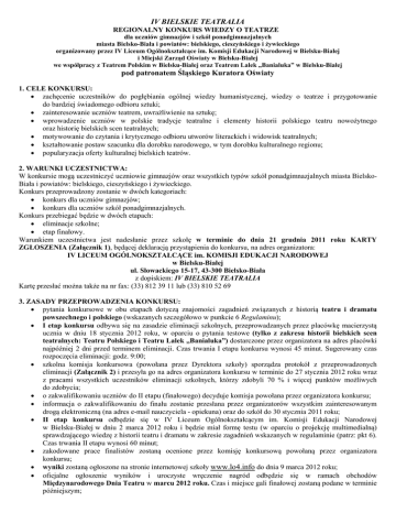 IV BIELSKIE TEATRALIA REGIOALY KOKURS WIEDZY O TEATRZE dla uczniów gimnazjów i szkół ponadgimnazjalnych miasta Bielsko-Biała i powiatów: bielskiego, cieszyńskiego i żywieckiego organizowany przez IV Liceum Ogólnokształcące im. Komisji Edukacji arodowej w Bielsku-Białej i Miejski Zarząd Oświaty w Bielsku-Białej we współpracy z Teatrem Polskim w Bielsku-Białej oraz Teatrem Lalek „Banialuka” w Bielsku-Białej pod patronatem Śląskiego Kuratora Oświaty 1. CELE KOKURSU: • zachęcenie uczestników do pogłębiania ogólnej wiedzy humanistycznej, wiedzy o teatrze i przygotowanie do bardziej świadomego odbioru sztuki; • zainteresowanie uczniów teatrem, uwrażliwienie na sztukę; • wprowadzenie uczniów w polskie tradycje teatralne i elementy historii polskiego teatru nowożytnego oraz historię bielskich scen teatralnych; • motywowanie do czytania i krytycznego odbioru utworów literackich i widowisk teatralnych; • kształtowanie postaw szacunku dla dorobku narodowego, w tym dorobku kulturalnego regionu; • popularyzacja oferty kulturalnej bielskich teatrów. 2. WARUKI UCZESTICTWA: W konkursie mogą uczestniczyć uczniowie gimnazjów oraz wszystkich typów szkół ponadgimnazjalnych miasta BielskoBiała i powiatów: bielskiego, cieszyńskiego i żywieckiego. Konkurs przeprowadzony zostanie w dwóch kategoriach: • konkurs dla uczniów gimnazjów; • konkurs dla uczniów szkół ponadgimnazjalnych. Konkurs przebiegać będzie w dwóch etapach: • eliminacje szkolne; • etap finałowy. Warunkiem uczestnictwa jest nadesłanie przez szkołę w terminie do dnia 21 grudnia 2011 roku KARTY ZGŁOSZEIA (Załącznik 1), będącej deklaracją przystąpienia do konkursu, na adres organizatora: IV LICEUM OGÓLOKSZTAŁCĄCE im. KOMISJI EDUKACJI ARODOWEJ w Bielsku-Białej ul. Słowackiego 15-17, 43-300 Bielsko-Biała z dopiskiem: IV BIELSKIE TEATRALIA Kartę przesłać można także na nr fax: (33) 812 39 11 lub (33) 810 52 69 3. ZASADY PRZEPROWADZEIA KOKURSU: • pytania konkursowe w obu etapach dotyczą znajomości zagadnień związanych z historią teatru i dramatu powszechnego i polskiego (wskazanych szczegółowo w punkcie 6 Regulaminu); • I etap konkursu odbywa się na zasadzie eliminacji szkolnych, przeprowadzanych przez placówkę macierzystą ucznia w dniu 18 stycznia 2012 roku, w oparciu o pytania testowe (tylko z zakresu historii bielskich scen teatralnych: Teatru Polskiego i Teatru Lalek „Banialuka”) dostarczone przez organizatora na adres placówki najpóźniej 2 dni przed terminem eliminacji. Czas trwania I etapu konkursu wynosi 45 minut. Sugerowany czas rozpoczęcia eliminacji: godz. 9:00; • szkolna komisja konkursowa (powołana przez Dyrektora szkoły) sporządza protokół z przeprowadzonych eliminacji (Załącznik 2) i przesyła go na adres organizatora konkursu w terminie do 27 stycznia 2012 roku wraz z pracami wszystkich uczestników eliminacji szkolnych, którzy zdobyli 70 % i więcej punktów możliwych do zdobycia; • o zakwalifikowaniu uczniów do II etapu (finałowego) decyduje komisja powołana przez organizatora konkursu; • informacja o zakwalifikowaniu do finału zostanie przesłana przez organizatorów wszystkim zainteresowanym drogą elektroniczną (na adres e-mail nauczyciela - opiekuna) oraz do szkół do 30 stycznia 2011 roku; • II etap konkursu odbędzie się w IV Liceum Ogólnokształcącym im. Komisji Edukacji Narodowej w Bielsku-Białej w dniu 2 marca 2012 roku i będzie miał formę testu (w oparciu o projekcję multimedialną) sprawdzającego wiedzę z historii teatru i dramatu w zakresie zagadnień wskazanych w regulaminie (patrz: pkt 6). Czas trwania II etapu wynosi 60 minut; • zakodowane prace finalistów zostaną ocenione przez komisję konkursową powołaną przez organizatora konkursu; • wyniki zostaną ogłoszone na stronie internetowej szkoły www.lo4.info do dnia 9 marca 2012 roku; • oficjalne ogłoszenie wyników i uroczyste wręczenie nagród odbędzie się w ramach obchodów Międzynarodowego Dnia Teatru w marcu 2012 roku. Czas i miejsce gali finałowej zostaną podane w terminie późniejszym; • zwycięzcy otrzymają nagrody w postaci dyplomów oraz atrakcyjnych nagród rzeczowych, zaś nauczyciele sprawujący opiekę merytoryczną – listy gratulacyjne. 4. TERMIARZ: • do 21 grudnia 2011 roku – nadesłanie Karty zgłoszenia; • do 16 stycznia 2012 roku – przesłanie pytań konkursowych do poszczególnych placówek, które zadeklarowały udział w konkursie; • 18 stycznia 2012 roku, godz. 9:00 – 10:00 – I etap konkursu (eliminacje szkolne); • do 27 stycznia 2012 roku – przesłanie wyników konkursu (w formie protokołu) na adres organizatora konkursu; • 2 marca 2012 roku – II etap konkursu w IV Liceum Ogólnokształcącym im. Komisji Edukacji Narodowej w Bielsku – Białej; • 9 marca 2012 roku – nieoficjalne ogłoszenie wyników konkursu, zamieszczenie listy laureatów na stronie internetowej szkoły: www.lo4.setia.pl • marzec 2012 roku – oficjalne ogłoszenie wyników i uroczyste wręczenie nagród. 5. KOTAKT Z ORGAIZATORAMI: Wszystkie informacje dotyczące przebiegu Konkursu będą na stronie www.lo4.setia.pl, w zakładce BIELSKIE TEATRALIA. Wszelkie pytania prosimy kierować na adres e-mail szkoły: [email protected] na bieżąco aktualizowane 6. ZAGADIEIA DO III BIELSKICH TEATRALIÓW I ETAP (historia bielskich scen teatralnych: Teatru Polskiego i Teatru Lalek „Banialuka”): • Źródła podstawowe: informacje ze stron internetowych Teatru Polskiego (www.teatr.bielsko.biala.pl) oraz Teatru Lalek „Banialuka” (www.banialuka.pl ); typy lalek wykorzystywanych w teatrze lalkowym (marionetki, kukiełki, pacynki, jawajki, cienie) oraz sposoby ich animacji. • Źródła uzupełniające: Lucyna Kozień, Teatr Lalek Banialuka 1947 – 1997, Bielsko-Biała 1997. Andrzej Linert, Teatr Polski w Bielsku-Białej 1945 – 2000, Bielsko-Biała 2001. II ETAP (z historii teat