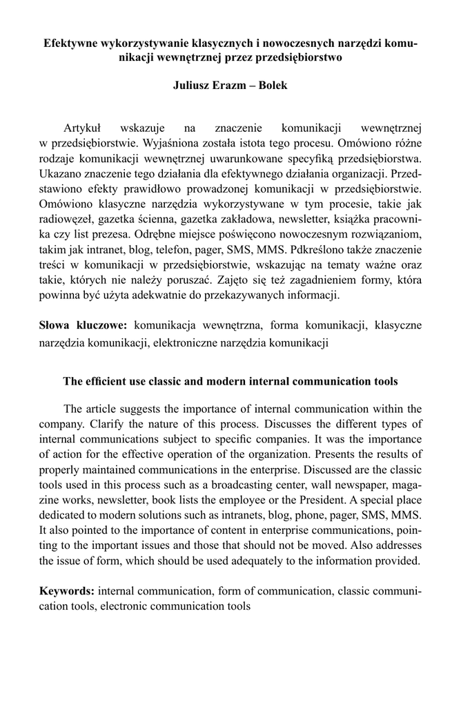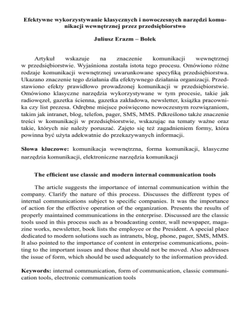 Efektywne wykorzystywanie klasycznych i nowoczesnych narzędzi komunikacji wewnętrznej przez przedsiębiorstwo Juliusz Erazm – Bolek Artykuł wskazuje na znaczenie komunikacji wewnętrznej w przedsiębiorstwie. Wyjaśniona została istota tego procesu. Omówiono różne rodzaje komunikacji wewnętrznej uwarunkowane specyfiką przedsiębiorstwa. Ukazano znaczenie tego działania dla efektywnego działania organizacji. Przedstawiono efekty prawidłowo prowadzonej komunikacji w przedsiębiorstwie. Omówiono klasyczne narzędzia wykorzystywane w tym procesie, takie jak radiowęzeł, gazetka ścienna, gazetka zakładowa, newsletter, książka pracownika czy list prezesa. Odrębne miejsce poświęcono nowoczesnym rozwiązaniom, takim jak intranet, blog, telefon, pager, SMS, MMS. Pdkreślono także znaczenie treści w komunikacji w przedsiębiorstwie, wskazując na tematy ważne oraz takie, których nie należy poruszać. Zajęto się też zagadnieniem formy, która powinna być użyta adekwatnie do przekazywanych informacji. Słowa kluczowe: komunikacja wewnętrzna, forma komunikacji, klasyczne narzędzia komunikacji, elektroniczne narzędzia komunikacji The efficient use classic and modern internal communication tools The article suggests the importance of internal communication within the company. Clarify the nature of this process. Discusses the different types of internal communications subject to specific companies. It was the importance of action for the effective operation of the organization. Presents the results of properly maintained communications in the enterprise. Discussed are the classic tools used in this process such as a broadcasting center, wall newspaper, magazine works, newsletter, book lists the employee or the President. A special place dedicated to modern solutions such as intranets, blog, phone, pager, SMS, MMS. It also pointed to the importance of content in enterprise communications, pointing to the important issues and those that should not be moved. Also addresses the issue of form, which should be used adequately to the information provided. Keywords: internal communication, form of communication, classic communication tools, electronic communication tools