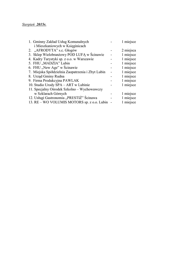 Sierpień 2015r. 1. Gminny Zakład Usług Komunalnych i Mieszkaniowych w Księginicach 2. „AFRODYTA” s.c. Głogów 3. Sklep Wielobranżowy POD LUFĄ w Ścinawie 4. Kadry Turystyki sp. z o.o. w Warszawie 5. FHU „MADZIA” Lubin 6. FHU „New Age” w Ścinawie 7. Miejska Spółdzielnia Zaopatrzenia i Zbyt Lubin 8. Urząd Gminy Rudna 9. Firma Produkcyjna PAWLAK 10. Studio Urody SPA – ART w Lubinie 11. Specjalny Ośrodek Szkolno – Wychowawczy w Szklarach Górnych 12. Usługi Gastronomia „PRESTIŻ” Ścinawa 13. RE – WO VOLUMIS MOTORS sp. z o.o. Lubin - 1 miejsce - 2 miejsca 1 miejsce 1 miejsce 1 miejsce 1 miejsce 1 miejsce 1 miejsce 1 miejsce 1 miejsce - 1 miejsce 1 miejsce 1 miejsce