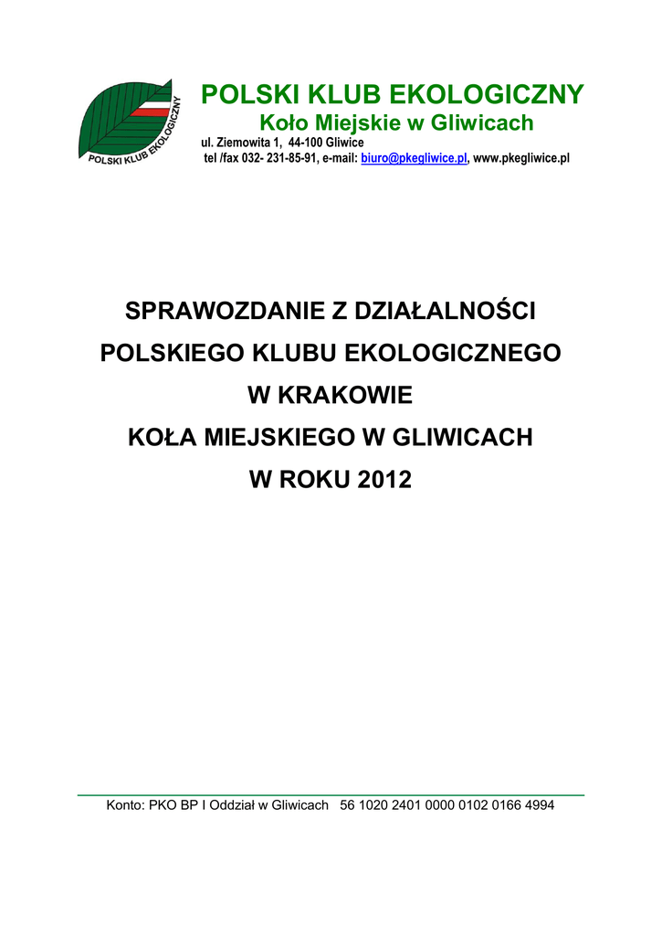 POLSKI KLUB EKOLOGICZNY Koło Miejskie w Gliwicach ul. Ziemowita 1, 44-100 Gliwice tel /fax 032- 231-85-91, e-mail: [email protected], www.pkegliwice.pl SPRAWOZDANIE Z DZIAŁALNOŚCI POLSKIEGO KLUBU EKOLOGICZNEGO W KRAKOWIE KOŁA MIEJSKIEGO W GLIWICACH W ROKU 2012 Konto: PKO BP I Oddział w Gliwicach 56 1020 2401 0000 0102 0166 4994 Polski Klub Ekologiczny Koło Miejskie w Gliwicach prowadzi szeroko zakrojoną działalność w zakresie edukacji ekologicznej na poziomie lokalnym, regionalnym, ogólnopolskim i międzynarodowym. Wykorzystuje różnorodne formy: spotkania, prelekcje, wykłady, debaty, konferencje, konkursy, imprezy otwarte – rajd rowerowy, kiermasz ekologiczny, publikacje, elektroniczny Biuletyn Ekologiczny PKE, strona internetowa www.pkegliwice.pl. Są bardzo pozytywne sygnały, że na stronie internetowej znajdują się ciekawe i przydatne informacje. Adresatami działalności PKE Gliwice są dzieci, młodzież szkolna, konsumenci zainteresowani kupowaniem produktów ekologicznych, rolnicy ekologiczni, pracownicy samorządu, ale także osoby bezrobotne i nieaktywne zawodowo, osadzeni w areszcie śledczym Polski Klub Ekologiczny Koło Miejskie w Gliwicach realizuje swoje cele statutowe poprzez wdrażanie projektów oraz działania stałe, realizowane w większości wolontarystycznie. I. REALIZACJA PROJEKTÓW W 2012 r. PKE Gliwice wdrażał następujące projekty dofinansowane ze źródeł zewnętrznych: 1. Kampania Wyżywić Świat – realizowana w ramach projektu dofinansowanego przez Unię Europejską w okresie styczeń 2010 – grudzień 2012. Kampania prowadzona jest w ramach projektu „Przeciwko głodowi – bądźmy konsekwentni!” realizowana jest w Polsce przez Polski Klub Ekologiczny Koło Miejskie w Gliwicach wspólnie z Polską Zieloną Siecią. Projekt koordynowany jest przez Francuski Komitet na Rzecz Solidarności Międzynarodowej. Organizacjami wspierającymi kampanię są: Polska Akcja Humanitarna (PAH), europejska sieć EUROSTEP, Evert Vermeer Stichting (Holandia), COSPE i Terra Nuova (Włochy), Germanwatch (Niemcy), SOS Faim (Belgia i Luksemburg). Celem kampanii było uwrażliwienie opinii publicznej oraz decydentów na problem głodu – jego przyczyny oraz sposoby zapobiegania i walki z nim. W ramach projektu odbywały się warsztaty dla młodzieży mające na celu podniesienie świadomości młodej części społeczeństwa na tematy globalne związane z głodem i ubóstwem; warsztaty dla rolników mające na celu promocję wytwarzania żywności w sposób zrównoważony i sprzedaży jej na rynku lokalnym, gliwicki kiermasz produktów ekologicznych i tradycyjnych połączony z debatą nt. lokalnej produkcji i konsumpcji, warsztaty dla członków lokalnych organizacji pozarządowych i zaangażowanych społecznie osób nt. problemów globalnych. Ponadto wydane zostały materiały informacyjne, prowadzona była też na bieżąco promocja projektu. W ramach projektu przeprowadzono następujące działania: 1. warsztaty dla młodzieży mające na celu podniesienie świadomości młodej części społeczeństwa na tematy globalne związane z głodem i ubóstwem; 2. warsztaty dla rolników mające na celu promocję wytwarzania żywności w sposób zrównoważony i sprzedaży jej na rynku lokalnym; 3. gliwicki kiermasz produktów ekologicznych i tradycyjnych połączony z debatą nt. lokalnej produkcji i konsumpcji; 4. opracowanie i wydanie materiałów merytorycznych na temat suwerenności żywnościowej, zrównoważonej produkcji i konsumpcji żywności; 5. warsztaty dla członków lokalnych organizacji pozarządowych i zaangażowanych społecznie osób nt. problemów globalnych; 6. cykl artykułów skierowanych do społeczeństwa, mających na celu zwiększenie świadomości problemów i zależności globalnych; 7. organizacja międzynarodowego seminarium kształcącego w Warszawie, skierowanego do działaczy organizacji pozarządowych i pracowników instytucji zajmujących się problemami globalnymi; 8. dostarczanie rzetelnych informacji i przykładów niespójności polityk Unii Europejskiej decydentom – głównie posłom Parlamentu i Parlamentu Europejskiego; 9. udział w Zgromadzeniach Parlamentarnych UE-AKP w charakterze obserwatorów 2. BERAS IMPLEMENATION – międzynarodowy projekt dofinansowany przez Unię Europejską, realizowany w okresie grudzień 2010 – wrzesień 2013. Projekt ma na celu promocję zrównoważonej – ekologicznej produkcji rolnej i świadomej konsumpcji. Projekt ma dwa aspekty – środowiskowy – obejmujący zbilansowanie substancji odżywczych w gospodarstwie, aby nie dopuścić do przenawożenia gleby i przedostawania się azotu i fosforu do wód oraz społeczny, polegający na zwiększaniu świadomości konsumentów w zakresie zalet kupowania lokalnych produktów ekologicznych bezpośrednio od rolników (m. in. ograniczenie transportu). 29 września 2012 r. odbył się XVII Gliwicki Kiermasz Żywności Ekologicznej i Tradycyjnej – Natura, zdrowie kultura. Impreza ta jest największą tego typu na Śląsku. Każdego roku gromadzi coraz większą liczbę wystawców i konsumentów. Gliwicki kiermasz to nie tylko miejsce, gdzie można zaopatrzyć się w żywność ekologiczną - równolegle prowadzone są warsztaty edukacyjne, dyskusje, pokazy filmów, które mają za zadanie zwiększyć świadomość konsumentów na temat różnych sposobów produkcji żywności ze wskazaniem tych najbardziej i najmniej szkodliwych dla środowiska. Kiermasz ma ciekawą formę, która przyciąga mieszkańców Śląska w różnym wieku, dzięki czemu możliwe jest dotarcie z przesłaniem do szerokiej grupy odbiorców. W 2012 roku kiermasz odwiedziło ponad 1700 osób – to rekordowa liczba. W ramach projektu założono utworzenie Centrów Informacji BERAS; promocję i wdrażanie systemu ERA; szkolenia dla rolników dotyczące recyklingu substancji odżywczych, spotkania doradców dotyczące systemu ERA; promocję „Diety dla Bałtyku