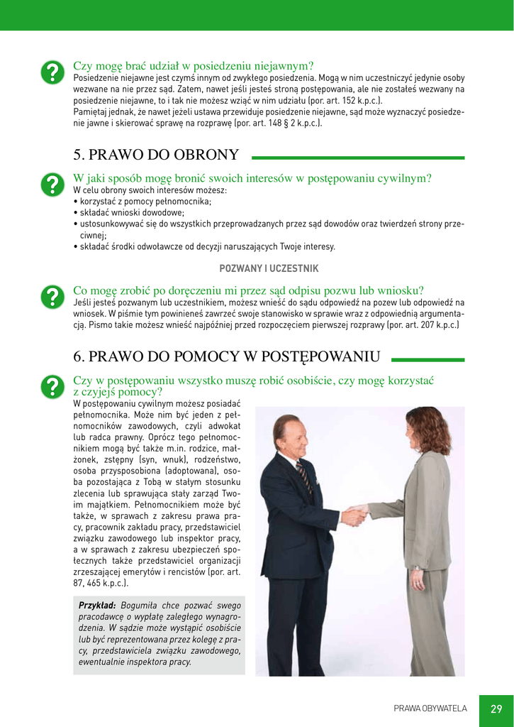 Czy mogę brać udział w posiedzeniu niejawnym? Posiedzenie niejawne jest czymś innym od zwykłego posiedzenia. Mogą w nim uczestniczyć jedynie osoby wezwane na nie przez sąd. Zatem, nawet jeśli jesteś stroną postępowania, ale nie zostałeś wezwany na posiedzenie niejawne, to i tak nie możesz wziąć w nim udziału (por. art. 152 k.p.c.). Pamiętaj jednak, że nawet jeżeli ustawa przewiduje posiedzenie niejawne, sąd może wyznaczyć posiedzenie jawne i skierować sprawę na rozprawę (por. art. 148 § 2 k.p.c.). 5. PRAWO DO OBRONY W jaki sposób mogę bronić swoich interesów w postępowaniu cywilnym? W celu obrony swoich interesów możesz: • k orzystać z pomocy pełnomocnika; • s kładać wnioski dowodowe; •u stosunkowywać się do wszystkich przeprowadzanych przez sąd dowodów oraz twierdzeń strony przeciwnej; • s kładać środki odwoławcze od decyzji naruszających Twoje interesy. POZWANY I UCZESTNIK Co mogę zrobić po doręczeniu mi przez sąd odpisu pozwu lub wniosku? Jeśli jesteś pozwanym lub uczestnikiem, możesz wnieść do sądu odpowiedź na pozew lub odpowiedź na wniosek. W piśmie tym powinieneś zawrzeć swoje stanowisko w sprawie wraz z odpowiednią argumentacją. Pismo takie możesz wnieść najpóźniej przed rozpoczęciem pierwszej rozprawy (por. art. 207 k.p.c.) 6. PRAWO DO POMOCY W POSTĘPOWANIU Czy w postępowaniu wszystko muszę robić osobiście, czy mogę korzystać z czyjejś pomocy? W postępowaniu cywilnym możesz posiadać pełnomocnika. Może nim być jeden z pełnomocników zawodowych, czyli adwokat lub radca prawny. Oprócz tego pełnomocnikiem mogą być także m.in. rodzice, małżonek, zstępny (syn, wnuk), rodzeństwo, osoba przysposobiona (adoptowana), osoba pozostająca z Tobą w stałym stosunku zlecenia lub sprawująca stały zarząd Twoim majątkiem. Pełnomocnikiem może być także, w sprawach z zakresu prawa pracy, pracownik zakładu pracy, przedstawiciel związku zawodowego lub inspektor pracy, a w sprawach z zakresu ubezpieczeń społecznych także przedstawiciel organizacji zrzeszającej emerytów i rencistów (por. art. 87, 465 k.p.c.). Przykład: Bogumiła chce pozwać swego pracodawcę o wypłatę zaległego wynagrodzenia. W sądzie może wystąpić osobiście lub być reprezentowana przez kolegę z pracy, przedstawiciela związku zawodowego, ewentualnie inspektora pracy. PRAWA OBYWATELA 29