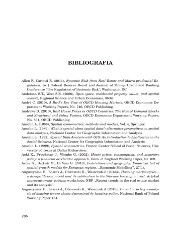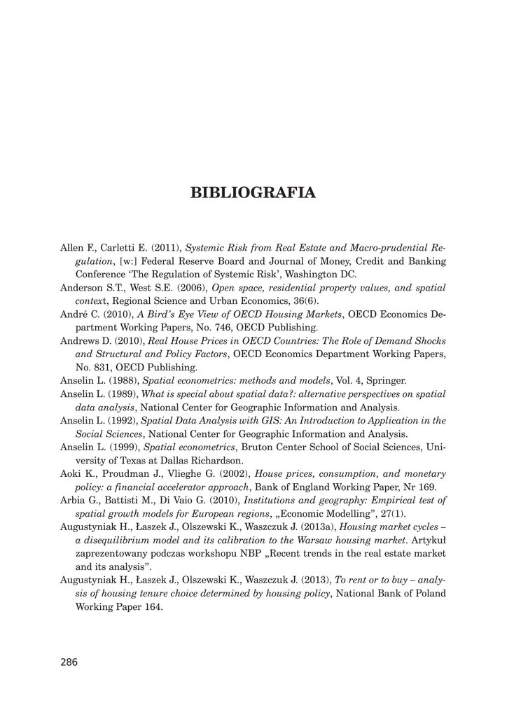 BIBLIOGRAFIA Allen F., Carletti E. (2011), Systemic Risk from Real Estate and Macro-prudential Regulation, [w:] Federal Reserve Board and Journal of Money, Credit and Banking Conference ‘The Regulation of Systemic Risk’, Washington DC. Anderson S.T., West S.E. (2006), Open space, residential property values, and spatial context, Regional Science and Urban Economics, 36(6). André C. (2010), A Bird’s Eye View of OECD Housing Markets, OECD Economics Department Working Papers, No. 746, OECD Publishing. Andrews D. (2010), Real House Prices in OECD Countries: The Role of Demand Shocks and Structural and Policy Factors, OECD Economics Department Working Papers, No. 831, OECD Publishing. Anselin L. (1988), Spatial econometrics: methods and models, Vol. 4, Springer. Anselin L. (1989), What is special about spatial data?: alternative perspectives on spatial data analysis, National Center for Geographic Information and Analysis. Anselin L. (1992), Spatial Data Analysis with GIS: An Introduction to Application in the Social Sciences, National Center for Geographic Information and Analysis. Anselin L. (1999), Spatial econometrics, Bruton Center School of Social Sciences, University of Texas at Dallas Richardson. Aoki K., Proudman J., Vlieghe G. (2002), House prices, consumption, and monetary policy: a financial accelerator approach, Bank of England Working Paper, Nr 169. Arbia G., Battisti M., Di Vaio G. (2010), Institutions and geography: Empirical test of spatial growth models for European regions, „Economic Modelling”, 27(1). Augustyniak H., aszek J., Olszewski K., Waszczuk J. (2013a), Housing market cycles – a disequilibrium model and its calibration to the Warsaw housing market. Artykuï zaprezentowany podczas workshopu NBP „Recent trends in the real estate market and its analysis”. Augustyniak H., aszek J., Olszewski K., Waszczuk J. (2013), To rent or to buy – analysis of housing tenure choice determined by housing policy, National Bank of Poland Working Paper 164. 286 Bibliograğa Augustyniak H., aszek J., Olszewski K., Waszczuk J. (2013), Modeling of cycles in the residential real estate markets – interactions between the primary and the secondary market and multiplier effects, National Bank of Poland Working Paper 143. Augustyniak H., Gajewski K., aszek J., ¿ochowski G. (2013), PrzedsiÚbiorstwo deweloperskie na rynku w Polsce oraz problemy jego analizy, „Bezpieczny Bank” 4(53). Bajari P., Chan P., Krueger D., Miller D. (2010), A Dynamic Model of Housing Demand: Estimation and Policy Implications, NBER Working Paper No. 15955. Bavaud F. (1998), Models for spatial weights: a systematic look, Geographical Analysis, 30(2). Blood R. (1998), Rola ubezpieczenia w finansowaniu hipotecznych kredytów mieszkaniowych w Stanach Zjednoczonych, Urban Institute, USAID, luty 1998 r. Blood R. (1998), Krótki przeglÈd ubezpieczeñ kredytów hipotecznych w innych krajach, Urban Institute, USAID, marzec 1998 r. Boskin M.J., Dulberger E.R., Gordon R.J., Griliches Z., Jorgenson D.W. (1996), Toward a More Accurate Measure of the Cost of Living, Final Report to the Senate Finance Committee from the Advisory Commission To Study The Consumer Price Index, grudzieñ, 1996 r., USA. http://www.ssa.gov/history/reports/boskinrpt.html#cpi8 (pobrane 4 wrzeĂnia 2010 r.). Boskin M.J., Dulberger E.R., Gordon R.J., Griliches Z., Jorgenson D.W. (1998), Consumer Prices, the Consumer Price Index, and the Cost of Living, „Jouranl of Economic Perspectives”, Vol. 12, No. 1. Bourassa S., Hoesli M., Scognamiglio D. (2010), Housing finance, prices, and tenure in Switzerland, MPRA Paper No. 45990. Bracke P. (2011), How Long Do Housing Cycles Last? A Duration Analysis for 19 OECD Countries, IMF Working Paper WP/11/231. Branna J., Madej K., BÚdkowski M., Serdeñ M., Sosiñski P., Luc M. (2012), Analiza zaleĝnoĂci pomiÚdzy cenÈ a lokalizacjÈ nieruchomoĂci na przykïadzie Krakowa, „Roczniki Geomatyki”, V. X, 4(54). Brus W. (1970), Koszt spoïeczny usïugi mieszkaniowej, IGM, Warszawa. Bryx M. (2007), Rynek nieruchomoĂci: system i funkcjonowanie, Poltext, Warszawa. Brzoza-Brzezina M., Chmielewski T., Nieděwiedziñska J. (2010), Substitution between domestic and foreign currency loans in Central Europe: do central banks matter? ECB Working Paper No. 1187. Burnham J.B. (1972), Private Financial Institutions and the Residential Mortgage Cycle, with Particular Reference to the Savings and Loan Industry, [w:] Board of Governors of the Federal Reserve System, Ways To Moderate Fluctuations in Housing Construction. Case K.E., Shiller R.J. (2003), Is There a Bubble in the Housing Market?, Brookings Papers on Economic Activity 34(2). 287 Bezpieczny Bank 4(53)/2013 Cellmer R. (2010), Analiza przestrzenna dynamiki zmian cen nieruchomoĂci lokalowych z wykorzystaniem regresji waĝonej geograficznie, „Acta Scientarium Polonorum. Administratio Locorum”, 9(4). Centralny Bank Irlandii (2011), Valuation Processes in the Banking Crisis – Lessons Learned – Guiding the Future. Charlton M., Fotheringham S., Brunsdon C. (2009), Geographically weighted regression, White paper. National Centre for Geocomputation, National University of Ireland Maynooth. Chiquier L. (1998), A French Secondary Mortgage Facility; Caisse de Refinancement Hypothecaire, „Housing Finance International”, No. 3. Chiquier L. (1998), Dual Index Mortgages: Lessons from International Practice and Conditions of Development in Poland, Housing Finance International, No 13. Christian J.W. (1991), Integrating Housing Finance into the National Finance Systems for Developing Countries, Housing Finance International, June. Clapp J.M. (2003), A Semiparametric Method for Valuating Residential Locations: Application to Automated Valuation, The Journal of Real Estate Finance and Economics, 27(3). CMHC (1994), The Canadian System of Housing Finance in Historical Perspective. Crosby N., Hughes C., Murdoch J. (2004), Influences on secured lending property