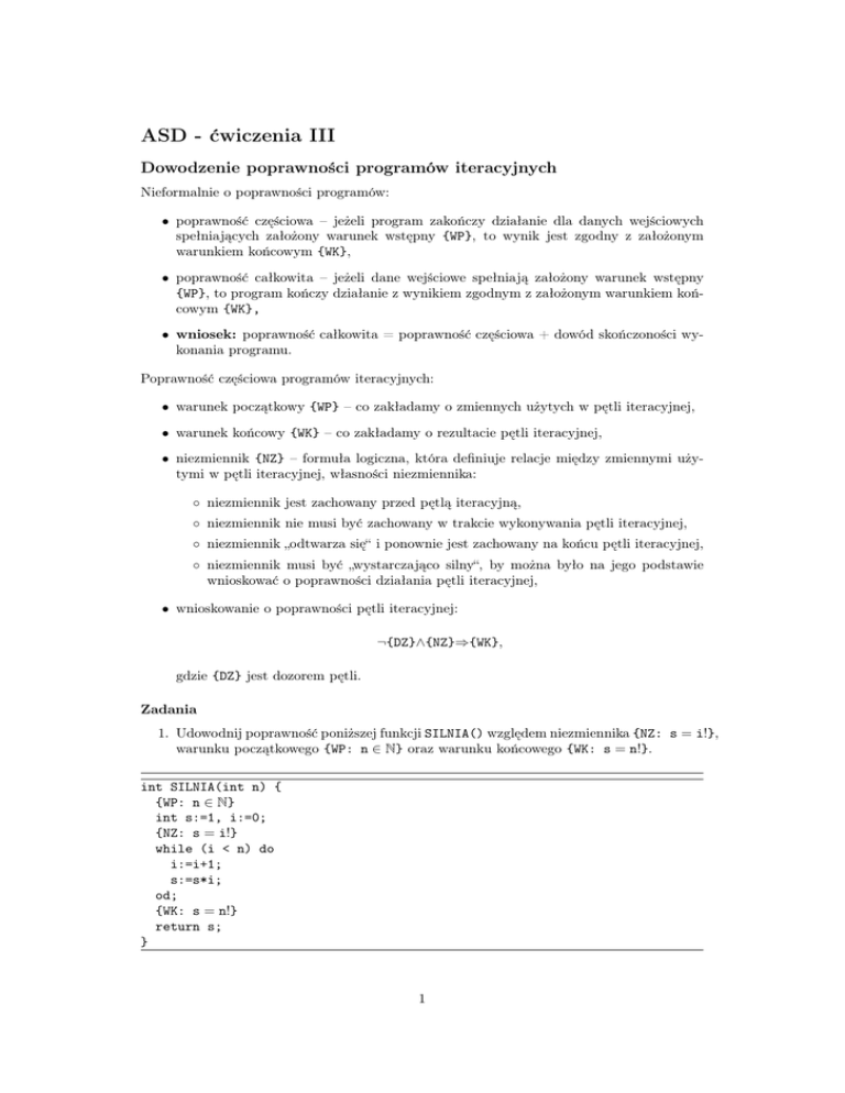 1. Udowodnij poprawność poniższej funkcji SILNIA() względem niezmiennika {NZ: s = i!},