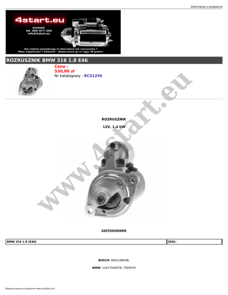 Informacje o produkcie ROZRUSZNIK BMW 316 1.8 E46 Cena : 530,00 zł ar t. eu Nr katalogowy : RCS1256 ROZRUSZNIK w w w .4 st 12V, 1.4 kW ZASTOSOWANIE BMW 316 1.8 (E46) 2001- BOSCH: 0001108196; BMW: 12417505979; 7505979 Wygenerowano w programie www.oscGold.com eu ar t. .4 st w w w