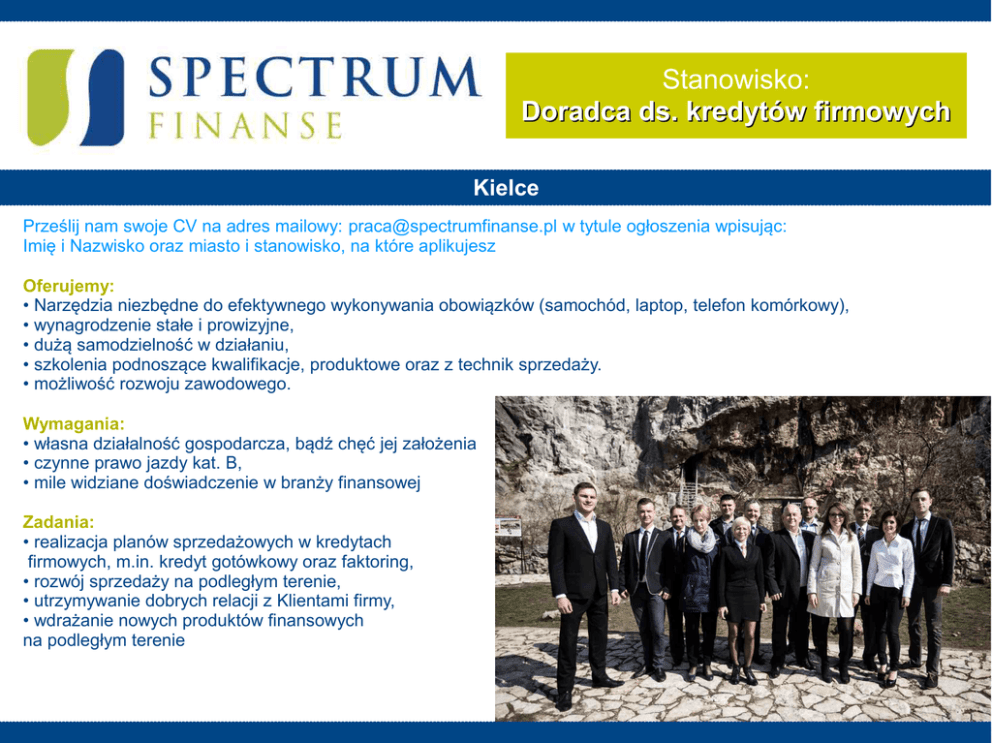 Stanowisko: Doradca ds. kredytów firmowych Kielce Prześlij nam swoje CV na adres mailowy: [email protected] w tytule ogłoszenia wpisując: Imię i Nazwisko oraz miasto i stanowisko, na które aplikujesz Oferujemy: • Narzędzia niezbędne do efektywnego wykonywania obowiązków (samochód, laptop, telefon komórkowy), • wynagrodzenie stałe i prowizyjne, • dużą samodzielność w działaniu, • szkolenia podnoszące kwalifikacje, produktowe oraz z technik sprzedaży. • możliwość rozwoju zawodowego. Wymagania: • własna działalność gospodarcza, bądź chęć jej założenia • czynne prawo jazdy kat. B, • mile widziane doświadczenie w branży finansowej Zadania: • realizacja planów sprzedażowych w kredytach firmowych, m.in. kredyt gotówkowy oraz faktoring, • rozwój sprzedaży na podległym terenie, • utrzymywanie dobrych relacji z Klientami firmy, • wdrażanie nowych produktów finansowych na podległym terenie
