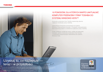 10 POWODÓW, DLA KTÓRYCH WARTO UAKTUALNIĆ KOMPUTER PRZENOŚNY FIRMY TOSHIBA DO SYSTEMU WINDOWS VISTA™ Komputery przenośne firmy Toshiba zapewniają obecnie najlepsze możliwości pracy mobilnej. Uaktualnienie komputera przenośnego do systemu Windows Vista pozwala korzystać z rozwiązań nowej generacji, które stanowią przełom w dziedzinie wydajności pracy mobilnej. Chcąc zwiększyć wydajność pracy i oddać się doskonałej rozrywce, wybierz komputery przenośne firmy Toshiba z możliwością ekspresowego uaktualnienia do systemu Windows Vista. Uzyskaj to, co najlepsze — teraz i w przyszłości * Nie wszystkie funkcje systemu Windows Vista™ będą dostępne na wszystkich komputerach oznaczonych logo Windows Vista™ Capable. Na wszystkich komputerach z logo Windows Vista™ Capable, które zostaną uaktualnione do systemu Windows Vista™ będzie można uruchamiać podstawowe rozwiązania systemu Microsoft Vista™, takie jak innowacje w zakresie organizowania i wyszukiwania informacji, bezpieczeństwa oraz niezawodności. Niektóre funkcje wersji Premium systemu Windows Vista™ — na przykład nowy interfejs użytkownika Windows® Aero™ — wymagają ulepszonego lub dodatkowego sprzętu. Szczegółowe informacje można znaleźć na stronie http://www.microsoft.com/poland/windowsvista/default.aspx. BARDZIEJ INTUICYJNA PRACA MOBILNA Uaktualniając komputer przenośny firmy Toshiba do systemu Windows Vista, zyskujesz łatwość obsługi dzięki zaletom interfejsu użytkownika Windows® Aero™ lub podstawowego interfejsu użytkownika. Nowy dynamiczny pulpit umożliwia szybszą i wydajniejszą nawigację, natomiast nowe menu Start pozwala błyskawicznie i wygodnie przechodzić do żądanych aplikacji i plików. Dzięki bardziej produktywnemu zarządzaniu informacjami możesz poświęcić całą swoją uwagę wykonywanemu zadaniu. WIĘKSZA WYDAJNOŚĆ PRACY System Windows Vista znacznie usprawnia sposób organizowania informacji na komputerach przenośnych firmy Toshiba. Wyszukiwanie błyskawiczne to innowacyjna funkcja, która w prosty sposób umożliwia jednoczesne znajdowanie plików i aplikacji przez wpisanie słowa kluczowego. Zawartość określonych plików można teraz wyświetlać w podglądzie przy użyciu ikon z podglądem na żywo, oszczędzając w ten sposób czas poświęcany dotąd na otwieranie i zamykanie plików, dzięki czemu praca jest jeszcze wydajniejsza. ZAPIERAJĄCA DECH W PIERSIACH ZAWARTOŚĆ CYFROWA Funkcje komputerów przenośnych firmy Toshiba, takie jak technologia wyświetlania Toshiba TruBrite®, stacja dysków HD DVD i pilot zdalnego sterowania dla komputerów pełniących rolę centrum multimedialnego, zostały zaprojektowane w celu uzyskania jak najwyższej jakości rozrywki cyfrowej. Nowy system menu Windows Media Center w systemie Windows Vista pozwala wyświetlać i zarządzać wszystkimi plikami cyfrowymi, na przykład filmami, muzyką, zdjęciami, grami i programami telewizyjnymi (na żywo oraz nagrane), w jednym miejscu. DZIEL SIĘ WSPOMNIENIAMI, FOTOGRAFIAMI CYFROWYMI I FILMAMI Dzięki komputerom przenośnym firmy Toshiba z systemem Windows Vista edytowanie, nagrywanie, przekazywanie i przesyłanie cyfrowej zawartości jest łatwiejsze niż kiedykolwiek. Wbudowane opcje łączności z sieciami LAN, WLAN i WWAN ułatwiają bezpośrednie przesyłanie zawartości do witryn sieci Web (na przykład blogów). Poczta systemu Windows zawiera nowe zaawansowane funkcje, które minimalizują wcześniejsze zagrożenia związane z używaniem poczty e-mail. BEZPROBLEMOWY DOSTĘP DO INTERNETU — ZAWSZE I WSZĘDZIE Wbudowana obsługa połączeń bezprzewodowych w komputerach przenośnych firmy Toshiba gwarantuje swobodny dostęp do Internetu w podróży. Funkcje programu Internet Explorer 7 w systemie Windows Vista zapewniają bezpieczeństwo i chronią prywatność. Teraz możesz również chronić swoje dzieci przed nieodpowiednimi treściami w trybie online. Dodatkowymi zaletami programu Internet Explorer 7 są nowe funkcje, takie jak przeglądanie na kartach, osadzone pole wyszukiwania i dopasowywanie obszaru wydruku, które pozwalają na bardziej wydajną pracę w trybie online. 2 BEZPIECZEŃSTWO DANYCH Funkcje Toshiba EasyGuard, takie jak ochrona dysku twardego, klawiatura odporna na zalanie, zabezpieczenie przed wstrząsami i zegar ochrony antykradzieżowej, powodują, że komputery przenośne firmy Toshiba są wytrzymałe i bezpieczne. Zaawansowane technologie zabezpieczeń systemu Windows Vista zostały zaprojektowane w celu ochrony przed najnowszą generacją wirusów, robaków, programów szpiegujących oraz innego złośliwego oprogramowania. Wszystkie powyższe rozwiązania powodują, że dane są zabezpieczone przed przypadkową utratą wskutek awarii sprzętu lub działań złośliwego oprogramowania i wirusów. WYNIKI PRACY BĘDĄ ZAWSZE BEZPIECZNE Centrum kopii zapasowych i przywracania w systemie Windows Vista to miejsce, w którym można zapisywać i automatycznie tworzyć kopie zapasowe danych, minimalizując ryzyko utraty ważnych informacji. Za pomocą komputera przenośnego firmy Toshiba z systemem Windows Vista™ Business użytkownik biznesowy może tworzyć codzienne „punkty przywracania“ zawierające kopie zapasowe plików, które umożliwiają przywrócenie starszych wersji dokumentów w przypadku wprowadzenia w nich niechcianych zmian. ŁATWOŚĆ NAWIĄZYWANIA POŁĄCZEŃ Kreator konfiguracji sieci i Centrum udostępniania pozwalają na łatwiejsze niż kiedykolwiek tworzenie, konfigurowanie i rozwiązywanie problemów z połączeniami sieciowymi. Dzięki komputerom przenośnym firmy Toshiba wyposażonym we wbudowaną obsługę sieci przewodowych i bezprzewodowych użytkownicy mogą uzyskiwać zdalny dostęp do dokumentów i programów za pośrednictwem sieci lub Internetu. Aby zwiększyć wydajność pracowników mobilnych, funkcja Obszar spotkań w systemie Windows umożliwia użytkownikom — zarówno w siec