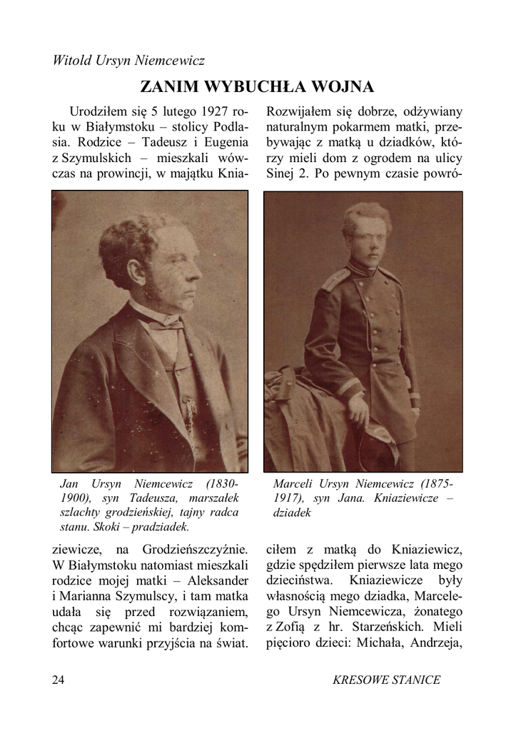 Witold Ursyn Niemcewicz ZANIM WYBUCHŁA WOJNA Urodziłem się 5 lutego 1927 roku w Białymstoku – stolicy Podlasia. Rodzice – Tadeusz i Eugenia z Szymulskich – mieszkali wówczas na prowincji, w majątku Knia- Rozwijałem się dobrze, odżywiany naturalnym pokarmem matki, przebywając z matką u dziadków, którzy mieli dom z ogrodem na ulicy Sinej 2. Po pewnym czasie powró- Jan Ursyn Niemcewicz (18301900), syn Tadeusza, marszałek szlachty grodzieńskiej, tajny radca stanu. Skoki – pradziadek. Marceli Ursyn Niemcewicz (18751917), syn Jana. Kniaziewicze – dziadek ziewicze, na Grodzieńszczyźnie. W Białymstoku natomiast mieszkali rodzice mojej matki – Aleksander i Marianna Szymulscy, i tam matka udała się przed rozwiązaniem, chcąc zapewnić mi bardziej komfortowe warunki przyjścia na świat. ciłem z matką do Kniaziewicz, gdzie spędziłem pierwsze lata mego dzieciństwa. Kniaziewicze były własnością mego dziadka, Marcelego Ursyn Niemcewicza, żonatego z Zofią z hr. Starzeńskich. Mieli pięcioro dzieci: Michała, Andrzeja, 24 KRESOWE STANICE Aleksander Szymulski (1867-1938), dziadek Marianna z Łagunów Szymulska (1872-1935), babcia Tadeusza, Antoninę i Jadwigę. Majątek Kniaziewicze podobno obejmował w przeszłości wraz z folwarkiem Mandzin około 1000 ha gruntów ornych wraz z łąkami, nieużytkami i kawałkiem lasu. Potem obszar ten uległ znacznemu zmniejszeniu. Przez włości przepływały dwie malownicze rzeki: Świsłocz i wpadająca do niej Wiereciejka. Posiadłość przedzielała bita droga (szosa) łącząca Grodno z Wielką Brzostowicą. Dziadka Marcelego nie znałem, zmarł w 1917 roku (podobno w saniach, wracając z polowania). Z opowieści wiem, że był ekscentrykiem. Jeździł na bicyklu (dawnym typie roweru o kołach nierównej wielkości), na widok którego konie ponosiły a wieśniaczki przechodziły na drugą stronę drogi żegnając się, spluwając przy tym i mówiąc, że „ancychryst jedzie”. Z objazdowego cyrku z Astrachania dziadek kupił kilka jednogarbnych wielbłądów i chciał nimi uprawiać rolę. Pamiętam fotografię dziadka przebranego za Araba i siedzącego na wielbłądzie. Pomysł okazał się całkowicie chybiony. Fornale nie potrafili obchodzić się z egzotycznymi dla nich zwierzętami, które nie słuchały ich i na dodatek opluwały cuchnącą wydzieliną. Wielbłądy zaczęły chorować i zdychać. Część z nich padła, resztę dziadek gdzieś oddał. Babcię Zofię pamiętam bardzo słabo. Mieszkała wraz z synem Andrzejem „we dworze”, bardzo starym, drewnianym, obrośniętym dzikim winem i zapadającym się już w ziemię KRESOWE STANICE 25 niewielkim dworku (nie żadna rezydencja). Rodzice ze mną mieszkali w oddzielnym budynku i tylko stołowali się początkowo we dworze. Pamiętam babcię jak częstowała mnie czekoladą (była już staruszką) i to wszystko. Z opowieści słyszanych od matki wiem, że życie w Kniaziewiczach miała ciężkie. Narzeczony matki, Władysław Rozwadowski, zmarł od ran odniesionych podczas walk polskobolszewickich w 1919 roku. Jej rodzice zadecydowali potem (tak wówczas było), że ma wyjść za mąż za przyjaciela poległego narzeczonego, którym był mój ojciec. Babka Zofia starała się nie dopuścić do zawarcia małżeństwa z „panną nie z tej sfery”. Kazała ojcu iść do miasta i tam szukać sobie zajęcia. Nie chciała dopuścić do podziału majątku i całość zamierzała przekazać najstarszemu synowi – Andrzejowi. Ojciec, po powrocie z wojska w 1921 roku, postanowił osiąść na ojcowiźnie, bo kochał ziemię i był do niej Marceli Ursyn Niemcewicz z synami: Michałem (najprzywiązany. Uparł starszym), Andrzejem i Tadeuszem (najmłodszym) w się i na przekór Kniaziewiczach. Rok 1903. swojej matce i jej 26 KRESOWE STANICE intrygom ożenił się z Eugenią Szymulską, którą szczerze kochał. Ślub odbył się 30 czerwca 1923 roku w Kościele Wniebowzięcia N.M.P. (obecna katedra) w Białymstoku. Nowożeńcy osiedli w Kniaziewiczach i nastąpił podział majątku między dwóch braci (według „Spisu ziemian Rzeczypospolitej Polskiej w roku 1930” ojciec był właścicielem 397 ha ziemi w majątku Kniaziewicze). Siostra ojca, Jadwiga, wyszła za mąż za Wincentego Krassowskiego i objęła folwark Mandzin (170 ha ziemi według ww. spisu). Drugą córkę, Antoninę, babka oddała do klasztoru Karmelitanek Bosych w Krakowie, a syna Michała (artystę malarza) wysłała w świat (zmarł w niedostatku w San Remo). Początki gospodarowania w Kniaziewiczach były bardzo trudne. Prawie wszystko uległo zniszczeniu i rozgrabieniu podczas kilkakrotnie przechodzących przez te tereny frontów I Wojny Światowej (1914-1918), a potem wojny polsko-bolszewickiej w 1920 roku. Trzeba było zaczynać niemal od zera. Do tego jeszcze nadeszły lata I Kryzysu Światowego. Jednak, dzięki uporowi i pracowitości, rodzice z każdym rokiem osiągali pewien postęp. Stryjowi Andrzejowi natomiast gospodarowanie przynosiło same niepowodzenia. Był człowiekiem wykształconym, ale nieudolnym, łatwowiernym i nie KRESOWE STANICE znał się na rolnictwie. Współpraca między braćmi nie układała się dobrze. Dochodziło do zatargów, babka nie mogła zrozumieć dlaczego Tadziowi wszystko się udaje, a Andrzejkowi nie. Do tego babka upokarzała moją matkę skutkiem czego rodzice zaprzestali stołować się we dworze. Najwcześniejszym wydarzeniem, które utkwiło w mojej pamięci, było awaryjne lądowanie wojskowego aeroplanu w pobliżu naszego domu. Pilot gościł u nas do czasu przybycia ekipy mechaników i naprawy maszyny. Po odlocie przysłał nam swoją fotografię. Pamiętam, że nazywał się Ekiert i stacjonował w Grudziądzu. Potem jeszcze, przelatując kiedyś w pobliżu, zboczył z kursu, okrążył kilkakrotnie nasz dom i pomachał ręką. Co niedziela jeździliśmy parokonną bryczką do kościoła parafialnego w Wielkich Ejsmontach. Za Kniaziewiczami