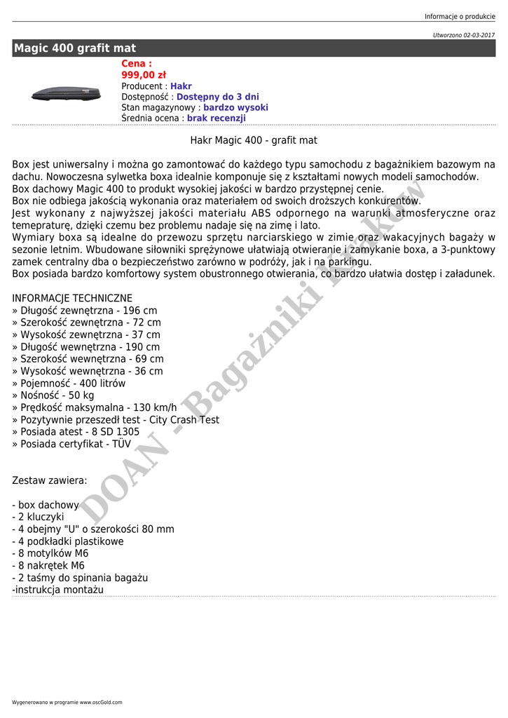 Informacje o produkcie Utworzono 02-03-2017 Magic 400 grafit mat Cena : 999,00 zł Producent : Hakr Dostępność : Dostępny do 3 dni Stan magazynowy : bardzo wysoki Średnia ocena : brak recenzji Hakr Magic 400 - grafit mat O Zestaw zawiera: AN -B ag aż n INFORMACJE TECHNICZNE » Długość zewnętrzna - 196 cm » Szerokość zewnętrzna - 72 cm » Wysokość zewnętrzna - 37 cm » Długość wewnętrzna - 190 cm » Szerokość wewnętrzna - 69 cm » Wysokość wewnętrzna - 36 cm » Pojemność - 400 litrów » Nośność - 50 kg » Prędkość maksymalna - 130 km/h » Pozytywnie przeszedł test - City Crash Test » Posiada atest - 8 SD 1305 » Posiada certyfikat - TÜV ik i K ra kó w Box jest uniwersalny i można go zamontować do każdego typu samochodu z bagażnikiem bazowym na dachu. Nowoczesna sylwetka boxa idealnie komponuje się z kształtami nowych modeli samochodów. Box dachowy Magic 400 to produkt wysokiej jakości w bardzo przystępnej cenie. Box nie odbiega jakością wykonania oraz materiałem od swoich droższych konkurentów. Jest wykonany z najwyższej jakości materiału ABS odpornego na warunki atmosferyczne oraz temepraturę, dzięki czemu bez problemu nadaje się na zimę i lato. Wymiary boxa są idealne do przewozu sprzętu narciarskiego w zimie oraz wakacyjnych bagaży w sezonie letnim. Wbudowane siłowniki sprężynowe ułatwiają otwieranie i zamykanie boxa, a 3-punktowy zamek centralny dba o bezpieczeństwo zarówno w podróży, jak i na parkingu. Box posiada bardzo komfortowy system obustronnego otwierania, co bardzo ułatwia dostęp i załadunek. D - box dachowy - 2 kluczyki - 4 obejmy "U" o szerokości 80 mm - 4 podkładki plastikowe - 8 motylków M6 - 8 nakrętek M6 - 2 taśmy do spinania bagażu -instrukcja montażu Wygenerowano w programie www.oscGold.com