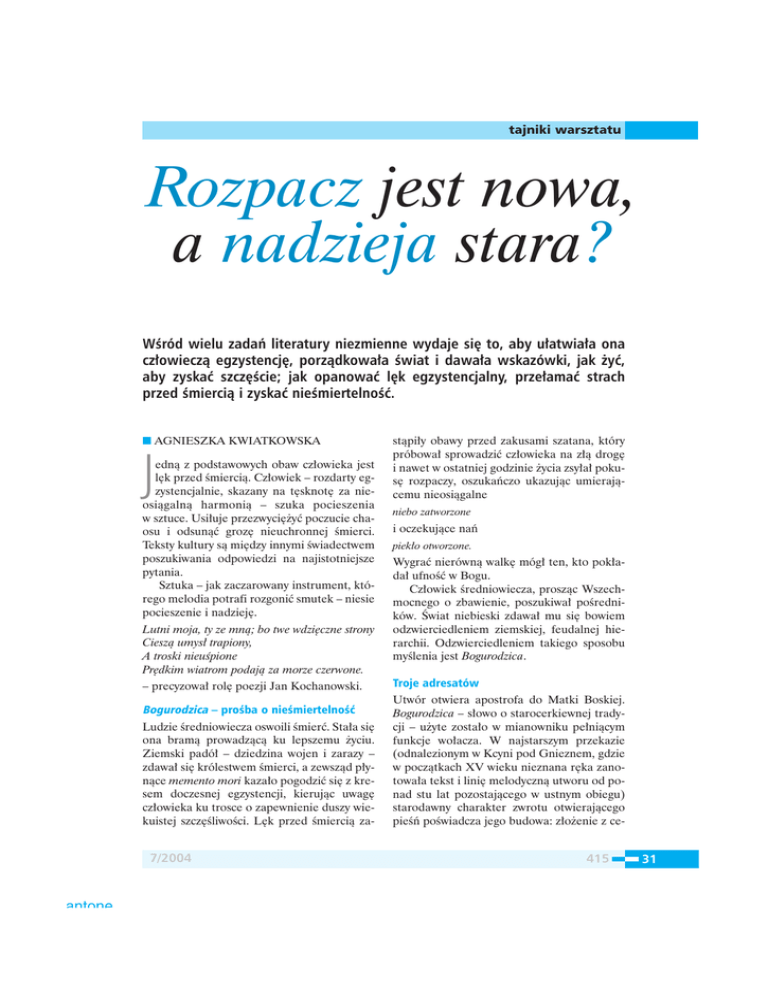 tajniki warsztatu Rozpacz jest nowa, a nadzieja stara? WÊród wielu zadaƒ literatury niezmienne wydaje si´ to, aby u∏atwia∏a ona cz∏owieczà egzystencj´, porzàdkowa∏a Êwiat i dawa∏a wskazówki, jak ˝yç, aby zyskaç szcz´Êcie; jak opanowaç l´k egzystencjalny, prze∏amaç strach przed Êmiercià i zyskaç nieÊmiertelnoÊç. ■ AGNIESZKA KWIATKOWSKA J ednà z podstawowych obaw cz∏owieka jest l´k przed Êmiercià. Cz∏owiek – rozdarty egzystencjalnie, skazany na t´sknot´ za nieosiàgalnà harmonià – szuka pocieszenia w sztuce. Usi∏uje przezwyci´˝yç poczucie chaosu i odsunàç groz´ nieuchronnej Êmierci. Teksty kultury sà mi´dzy innymi Êwiadectwem poszukiwania odpowiedzi na najistotniejsze pytania. Sztuka – jak zaczarowany instrument, którego melodia potrafi rozgoniç smutek – niesie pocieszenie i nadziej´. Lutni moja, ty ze mnà; bo twe wdzi´czne strony Cieszà umys∏ trapiony, A troski nieuÊpione Pr´dkim wiatrom podajà za morze czerwone. – precyzowa∏ rol´ poezji Jan Kochanowski. Bogurodzica – proÊba o nieÊmiertelnoÊç Ludzie Êredniowiecza oswoili Êmierç. Sta∏a si´ ona bramà prowadzàcà ku lepszemu ˝yciu. Ziemski padó∏ – dziedzina wojen i zarazy – zdawa∏ si´ królestwem Êmierci, a zewszàd p∏ynàce memento mori kaza∏o pogodziç si´ z kresem doczesnej egzystencji, kierujàc uwag´ cz∏owieka ku trosce o zapewnienie duszy wiekuistej szcz´ÊliwoÊci. L´k przed Êmiercià za- 7/2004 antone stàpi∏y obawy przed zakusami szatana, który próbowa∏ sprowadziç cz∏owieka na z∏à drog´ i nawet w ostatniej godzinie ˝ycia zsy∏a∏ pokus´ rozpaczy, oszukaƒczo ukazujàc umierajàcemu nieosiàgalne niebo zatworzone i oczekujàce naƒ piek∏o otworzone. Wygraç nierównà walk´ móg∏ ten, kto pok∏ada∏ ufnoÊç w Bogu. Cz∏owiek Êredniowiecza, proszàc Wszechmocnego o zbawienie, poszukiwa∏ poÊredników. Âwiat niebieski zdawa∏ mu si´ bowiem odzwierciedleniem ziemskiej, feudalnej hierarchii. Odzwierciedleniem takiego sposobu myÊlenia jest Bogurodzica. Troje adresatów Utwór otwiera apostrofa do Matki Boskiej. Bogurodzica – s∏owo o starocerkiewnej tradycji – u˝yte zosta∏o w mianowniku pe∏niàcym funkcje wo∏acza. W najstarszym przekazie (odnalezionym w Kcyni pod Gnieznem, gdzie w poczàtkach XV wieku nieznana r´ka zanotowa∏a tekst i lini´ melodycznà utworu od ponad stu lat pozostajàcego w ustnym obiegu) starodawny charakter zwrotu otwierajàcego pieʃ poÊwiadcza jego budowa: z∏o˝enie z ce- 415 31 tajniki warsztatu koƒcówk´ charakterystycznà dla form przymiotnikowych sprzed przeg∏osu polskiego, co nale˝y przypisywaç wp∏ywom wschodniej s∏owiaƒszczyzny, gdzie przeg∏os nie zaszed∏. Foto: Fortunata Obràpalska lownikiem bogu-rodzica. W póêniejszych zapisach z regu∏y zast´powano go bardziej nowoczesnym z∏o˝eniem dope∏niaczowym boga-rodzica. Starsza forma podkreÊla pe∏nà pokory, s∏u˝ebnà postaw´ Maryi, która urodzi∏a Boga dla Boga. Trójzg∏oskowo wymawiane imi´ Maryja jest odbierane jako zdrobnienie ∏aciƒskiego Maria. Pieszczotliwej formie imienia towarzyszy ca∏y szereg zdrobnieƒ i pozytywnie zabarwionych epitetów: dziewica (od dziewa – panna gotowa do zam´Êcia), matka (od maç, dziÊ zachowanego niemal wy∏àcznie w frazeologizmach o zabarwieniu wulgarnym), zwolena (wybrana), Bogiem s∏awiena (s∏awiona przez Boga, uwielbiona przez Boga, od dawnego czasownika bogos∏awiç, dziÊ: b∏ogos∏awiç). Co ciekawe, epitety s∏awiena i zwolena zachowa∏y 32 416 Apostrofa do Matki Boskiej Wbrew pozorom nie wskazuje ona g∏ównego adresata lirycznego. Zbiorowe „ja” liryczne – spo∏ecznoÊç wierzàcych – zwraca si´ najpierw do Maryi, gdy˝ ona wydaje si´ wyznawcom najbli˝sza. OÊmielajà si´ mówiç do niej w sposób pieszczotliwy i proszà o wstawiennictwo. Bogurodzica ma uprosiç u swojego Syna spe∏nienie ludzkich próÊb. To w∏aÊnie Chrystus, z powagà nazwany Bo˝ycem i Gospodzinem, jest g∏ównym adresatem pieÊni. Imiona, którymi zosta∏ nazwany, sygnalizujà jego pot´g´ i wszechmoc. Bo˝yc (syn Boga) to okreÊlenie utworzone typowym formantem: -icz, -ycz na wschodzie s∏owiaƒszczyzny (królewicz, carewicz) oraz -ic, -yc w rejonach zachodnich (ksi´˝yc – ksià˝´; syn ksi´dza, czyli ksi´cia). Gospodzin – leksem oznaczajàcy pana i w∏adc´ – podkreÊla rol´ Chrystusa jako w∏adcy Êwiata. Zanoszàc proÊby do osoby tak pot´˝nej, dobrze mieç mo˝nych or´downików. Modlàcy powo∏ujà si´ te˝ na postaç Chrystusowi szczególnie bliskà – na Jana Chrzciciela. Twórcy Êredniowieczni ch´tnie eksponowali zwiàzek pomi´dzy Jezusem a jego o pó∏ roku starszym kuzynem – synem Êw. El˝biety. W czasie spotkania brzemiennych matek, mi´dzy dzieçmi nawiàza∏a si´ szczególna wi´ê. Na dêwi´k g∏osu Maryi Jan poruszy∏ si´ w ∏onie El˝biety. ApokryfiÊci dopowiadajà, ˝e Jan zosta∏ wówczas ochrzczony Duchem Êw i uwolniony od zmazy grzechu pierworodnego, a w Marii widzà akuszerk´ i pierwszà piastunk´ tego, który mia∏ póêniej ochrzciç Chrystusa w Jordanie. S∏owo a obraz Szczególny zwiàzek Jezusa, Jana i Marii – zwany ideà trina sanctitas – by∏ ˝ywo poÊwiadczany przez literatur´ i obecny w tradycji ludowej. Znalaz∏ te˝ swoje odzwierciedlenie w wyobra˝eniach plastycznych zwanych deesis (z gr. proÊba, modlitwa) bàdê trimorphion. Na tych przedstawieniach widnieje Chrystus Pan i W∏adca WszechÊwiata, zasiadajàcy na tronie polonistyka Panto tajniki warsztatu Na nic zda si´ jednak szcz´Êliwe ˝ycie, jeÊli z t´czy. U stóp tronu stojà: Matka Boska i Jan u jego kresu czyha z∏owroga Êmierç. Strach Chrzciciel, zanoszàcy do Wszechmocnego przed nià mo˝e prze∏amaç wiara w ˝ycie ludzkie modlitwy. Takie upostaciowanie, powieczne, w wiekuisty przebyt, i modlitwa o niechodzàce ze Wschodu, zyska∏o popularnoÊç biaƒski cha
