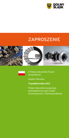 Zaproszenie X Polsko-Saksońskie Forum Gospodarcze Stadion Wrocław 14 października 2013 Polsko-Saksońska kooperacja przedsiębiorstw jako nośnik innowacyjności i internacjonalizacji 2 Wstęp X Polsko-Saksońskie Forum Gospodarcze 14 października 2013 Temat przewodni: Polsko-Saksońska kooperacja przedsiębiorstw jako nośnik innowacyjności i internacjonalizacji Tegoroczne Polsko-Saksońskie Forum Gospodarcze jest organizowane już po raz dziesiąty. Okrągła rocznica to doskonała okazja do przypomnienia kilku słów o historii tego przedsięwzięcia. Pierwsza edycja forum odbyła się w kwietniu 2004 r. w Dreźnie z inicjatywy ministrów gospodarki i pracy Polski i Saksonii. W 2005 r. zostało podpisane w Warszawie wspólne oświadczenie o współpracy gospodarczej obu krajów, co stworzyło formalną podstawę do kontynuacji spotkań, naprzemiennie w Polsce i Saksonii. Ideą przyświecającą organizacji tego typu spotkań przedstawicieli przemysłu, sfer gospodarczych i administracji obu krajów jest stworzenie platformy wspierającej współpracę małych i średnich przedsiębiorstw oraz pomoc w lepszym i efektywniejszym powiązaniu regionalnych możliwości i inicjatyw. Jest również próbą stworzenia transgranicznej sieci współpracy, która w optymalny sposób przyczynić się może do wykorzystania potencjału poszczególnych firm, podniesienia na wyższy poziom ich stopnia innowacyjności i tym samym konkurencyjności na rynku światowym. W 2013 r. gospodarzem wydarzenia jest Urząd Marszałkowski Województwa Dolnośląskiego. Forum jest organizowane we współpracy z Ministerstwem Gospodarki RP, Saksońskim Ministerstwem Gospodarki Pracy i Transportu oraz Saksońską Agencją Wspierania Gospodarki. Tematem przewodnim X Polsko-Saksońskiego Forum Gospodarczego jest: „Polsko-Saksońska kooperacja przedsiębiorstw jako nośnik innowacyjności i internacjonalizacji”. Powyższa tematyka zostanie pogłębiona i wzbogacona o dwa workshopy: Workshop 1 – Innowacyjne technologie materiałów lekkich i tekstyliów dla branży kolejowej, motoryzacyjnej i innych, Workshop 2 – Techniki wykorzystywane w OŹE i magazynowaniu energii. Przy okazji Forum odbędzie się również wystawa produktów oraz technologii innowacyjnych przedsiębiorstw z Dolnego Śląska i Saksonii. 3 Celem X Polsko-Saksońskiego Forum Gospodarczego jest budowanie pozytywnego wizerunku kooperacji i internacjonalizacji przedsiębiorstw innowacyjnych poprzez pokazanie potencjału i silnych stron takich przedsiębiorstw oraz podzielenie się dobrymi praktykami. Forum ma stanowić platformę wymiany doświadczeń nt. możliwości wsparcia przedsiębiorstw innowacyjnych oraz służyć nawiązaniu współpracy pomiędzy dolnośląskimi i saksońskimi przedsiębiorcami. Forum skierowane jest do polskich i saksońskich przedsiębiorców, liderów inicjatyw innowacyjnych, instytucji publicznych, jednostek otoczenia biznesu, jednostek samorządu terytorialnego, instytucji rynku pracy, świata nauki oraz wszystkich zainteresowanych branżą przemysłu lekkiego oraz tematyką OŹE. Tematyka Forum doskonale wpisuje się w zapisy „Strategii Rozwoju Województwa Dolnośląskiego 2020”, w cel główny, który brzmi: Nowoczesna gospodarka i wysoka jakość życia w atrakcyjnym środowisku. SRWD 2020 wskazuje model rozwoju regionu: Dolny Śląsk regionem koncentracji innowacyjnych podmiotów produkcyjnych i usługowych współpracujących z rozwiniętym sektorem badawczym oraz intensywnego rozwoju nowoczesnej turystyki opartej o współpracę międzyregionalną i transgraniczną, tworzących razem atrakcyjne miejsca do życia dla mieszkańców o coraz wyższych kwalifikacjach i rozwiniętej kulturze obywatelskiej. Bogata i ciekawa tematyka tegorocznego Forum odnosi się również do celu szczegółowego strategii, sformułowanego jako: Wzrost konkurencyjności przedsiębiorstw, zwłaszcza MŚP oraz działań zgrupowanych w makrosferze Przedsiębiorczość i innowacyjność, głównie w zakresie zadań odnoszących się do tworzenia korzystnych warunków do międzynarodowej współpracy gospodarczej przedsiębiorstw, wymiany doświadczeń i wykorzystywania modeli biznesowych. Polsko-Saksońskie Forum Gospodarcze, które na stałe wpisało się w kalendarz najważniejszych wydarzeń gospodarczych Dolnego Śląska, jest od 10 lat przedsięwzięciem wskazującym na duże możliwości w zakresie budowania dobrej współpracy gospodarczej Polski i Saksonii oraz na atrakcyjność gospodarczą obu krajów. Nowoczesna gospodarka otwiera przed firmami z Polski i Saksonii szerokie spektrum dla współpracy naukowo-technicznej oraz internacjonalizacji. Niezwykle istotne jest podejmowanie działań umożliwiających przeniesienie dotychczasowej współpracy gospodarczej na wyższy poziom uwzględniający czynnik innowacyjności i szeroko rozumianego postępu technologicznego. Odnosi się to do spraw związanych z technikami wykorzystywanymi w OŹE, magazynowaniu energii oraz przemysłem lekkim, wytwarzającym np. materiały i tkaniny techniczne nowych generacji. Stworzenie trwałych transgranicznych powiązań pozwoli na wykorzystanie w optymalnym stopniu lokalnych potencjałów badawczych i produkcyjnych, również przy wsparciu środkami unijnymi. 4 WSKAZÓWKI DOJAZDU X Polsko-Saksońskie Forum Gospodarcze 14 października 2013 Temat przewodni: Polsko-Saksońska kooperacja przedsiębiorstw jako nośnik innowacyjności i internacjonalizacji Miejsce obrad Stadion Wrocław Al. Śląska 1 54-118 Wrocław www.stadionwroclaw.pl Wjazd: Brama „A“ Wejście: Strefa Mediów, Sektor A Sala Prasowa Dojazd z centrum, ulicą Lotniczą Dojazd z Autostrady A4, Autostradowa Obwodnica Wrocławia A8 Dla uczestników Forum parking bezpłatny 5 Program Program godz. 10.30 – 11.00 Rejestracja uczestników godz. 11.00 – 11.30 Uroczyste otwarcie Forum Dr Jerzy Tutaj, Członek Zarządu Województwa Dolnośląskiego Ilona Antoniszyn-Klik, Pods
