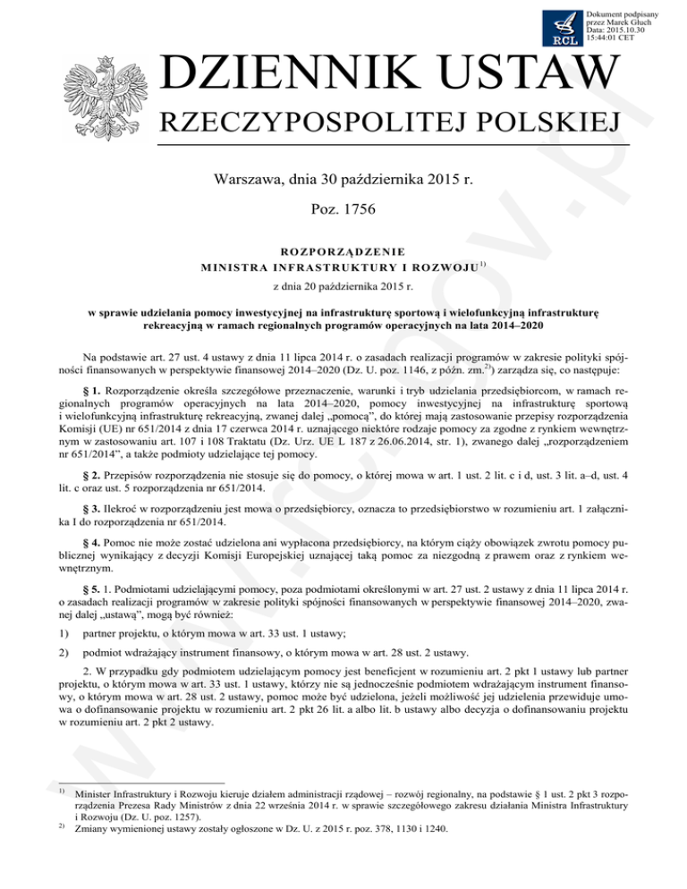 Dokument podpisany przez Marek Głuch Data: 2015.10.30 15:44:01 CET l.g ov .pl DZIENNIK USTAW RZECZYPOSPOLITEJ POLSKIEJ Warszawa, dnia 30 października 2015 r. Poz. 1756 RO ZP O R ZĄ D ZE N I E M INI S TR A INF RA S T R UK TU RY I RO ZW O J U 1) z dnia 20 października 2015 r. w sprawie udzielania pomocy inwestycyjnej na infrastrukturę sportową i wielofunkcyjną infrastrukturę rekreacyjną w ramach regionalnych programów operacyjnych na lata 2014–2020 Na podstawie art. 27 ust. 4 ustawy z dnia 11 lipca 2014 r. o zasadach realizacji programów w zakresie polityki spójności finansowanych w perspektywie finansowej 2014–2020 (Dz. U. poz. 1146, z późn. zm.2)) zarządza się, co następuje: w. rc § 1. Rozporządzenie określa szczegółowe przeznaczenie, warunki i tryb udzielania przedsiębiorcom, w ramach regionalnych programów operacyjnych na lata 2014–2020, pomocy inwestycyjnej na infrastrukturę sportową i wielofunkcyjną infrastrukturę rekreacyjną, zwanej dalej „pomocą”, do której mają zastosowanie przepisy rozporządzenia Komisji (UE) nr 651/2014 z dnia 17 czerwca 2014 r. uznającego niektóre rodzaje pomocy za zgodne z rynkiem wewnętrznym w zastosowaniu art. 107 i 108 Traktatu (Dz. Urz. UE L 187 z 26.06.2014, str. 1), zwanego dalej „rozporządzeniem nr 651/2014”, a także podmioty udzielające tej pomocy. § 2. Przepisów rozporządzenia nie stosuje się do pomocy, o której mowa w art. 1 ust. 2 lit. c i d, ust. 3 lit. a–d, ust. 4 lit. c oraz ust. 5 rozporządzenia nr 651/2014. § 3. Ilekroć w rozporządzeniu jest mowa o przedsiębiorcy, oznacza to przedsiębiorstwo w rozumieniu art. 1 załącznika I do rozporządzenia nr 651/2014. § 4. Pomoc nie może zostać udzielona ani wypłacona przedsiębiorcy, na którym ciąży obowiązek zwrotu pomocy publicznej wynikający z decyzji Komisji Europejskiej uznającej taką pomoc za niezgodną z prawem oraz z rynkiem wewnętrznym. § 5. 1. Podmiotami udzielającymi pomocy, poza podmiotami określonymi w art. 27 ust. 2 ustawy z dnia 11 lipca 2014 r. o zasadach realizacji programów w zakresie polityki spójności finansowanych w perspektywie finansowej 2014–2020, zwanej dalej „ustawą”, mogą być również: 1) 2) partner projektu, o którym mowa w art. 33 ust. 1 ustawy; podmiot wdrażający instrument finansowy, o którym mowa w art. 28 ust. 2 ustawy. ww 2. W przypadku gdy podmiotem udzielającym pomocy jest beneficjent w rozumieniu art. 2 pkt 1 ustawy lub partner projektu, o którym mowa w art. 33 ust. 1 ustawy, którzy nie są jednocześnie podmiotem wdrażającym instrument finansowy, o którym mowa w art. 28 ust. 2 ustawy, pomoc może być udzielona, jeżeli możliwość jej udzielenia przewiduje umowa o dofinansowanie projektu w rozumieniu art. 2 pkt 26 lit. a albo lit. b ustawy albo decyzja o dofinansowaniu projektu w rozumieniu art. 2 pkt 2 ustawy. 1) 2) Minister Infrastruktury i Rozwoju kieruje działem administracji rządowej – rozwój regionalny, na podstawie § 1 ust. 2 pkt 3 rozporządzenia Prezesa Rady Ministrów z dnia 22 września 2014 r. w sprawie szczegółowego zakresu działania Ministra Infrastruktury i Rozwoju (Dz. U. poz. 1257). Zmiany wymienionej ustawy zostały ogłoszone w Dz. U. z 2015 r. poz. 378, 1130 i 1240. Dziennik Ustaw –2– Poz. 1756 l.g ov .pl § 6. Pomoc ma na celu wspieranie rozwoju gospodarczego i społecznego województwa objętego regionalnym programem operacyjnym na lata 2014–2020 i jest udzielana na: 1) infrastrukturę sportową, jeżeli są spełnione warunki określone w art. 55 ust. 2 i 4–6 rozporządzenia nr 651/2014, lub 2) wielofunkcyjną infrastrukturę rekreacyjną, o której mowa w art. 55 ust. 3 rozporządzenia nr 651/2014, jeżeli są spełnione warunki określone w art. 55 ust. 4 i 6 rozporządzenia nr 651/2014. § 7. Pomoc jest udzielana: 1) zgodnie z art. 5 ust. 1 rozporządzenia nr 651/2014; 2) w formach i na warunkach, o których mowa w art. 5 ust. 2 lit. a–c rozporządzenia nr 651/2014; 3) na pokrycie kosztów kwalifikowalnych, o których mowa w art. 55 ust. 8 rozporządzenia nr 651/2014. § 8. 1. Wartość dopuszczalnej pomocy ustala się zgodnie z art. 55 ust. 10 rozporządzenia nr 651/2014. 2. W przypadku pomocy nieprzekraczającej równowartości 1 mln euro, wartość dopuszczalnej pomocy może zostać ustalona zgodnie z art. 55 ust. 12 rozporządzenia nr 651/2014. 3. Do obliczania wartości pomocy i kosztów kwalifikowalnych stosuje się art. 7 ust. 1–3 rozporządzenia nr 651/2014. § 9. Pomoc podlega kumulacji na zasadach określonych w art. 8 rozporządzenia nr 651/2014. § 10. W przypadku, o którym mowa w art. 4 ust. 1 lit. bb rozporządzenia nr 651/2014, pomoc stanowi pomoc indywidualną podlegającą notyfikacji Komisji Europejskiej i może być udzielona po jej zatwierdzeniu przez Komisję Europejską. § 11. Pomoc może być udzielona, jeżeli przedsiębiorca złożył wniosek o udzielenie pomocy, zwany dalej „wnioskiem”, zgodnie z art. 6 ust. 2 zdanie pierwsze rozporządzenia nr 651/2014. § 12. 1. Przedsiębiorca składa wniosek do podmiotu udzielającego pomocy. 2. Wniosek zawiera: 2) informacje wskazane w art. 6 ust. 2 zdanie drugie rozporządzenia nr 651/2014; w. rc 1) inne informacje, wskazane przez podmiot udzielający pomocy, niezbędne do dokonania oceny wniosku. 3. Do wniosku przedsiębiorca załącza dokumenty przygotowane zgodnie z przepisami wydanymi na podstawie art. 37 ust. 6 ustawy z dnia 30 kwietnia 2004 r. o postępowaniu w sprawach dotyczących pomocy publicznej (Dz. U. z 2007 r. Nr 59, poz. 404, z późn. zm.3)). 4. Po przeprowadzeniu oceny wniosku pomoc może być udzielona przedsiębiorcy na podstawie umowy albo decyzji o dofinansowaniu projektu w rozumieniu art. 2 pkt 2 ustawy. § 13. Pomoc jest udzielana do końca okresu dostosowawczego, o którym mowa w art. 58 ust. 4 zdanie pierwsze, w związku z art. 59 rozporządzenia nr 651/2014. ww § 14. Rozporządzenie wchodzi w życie z dniem następują