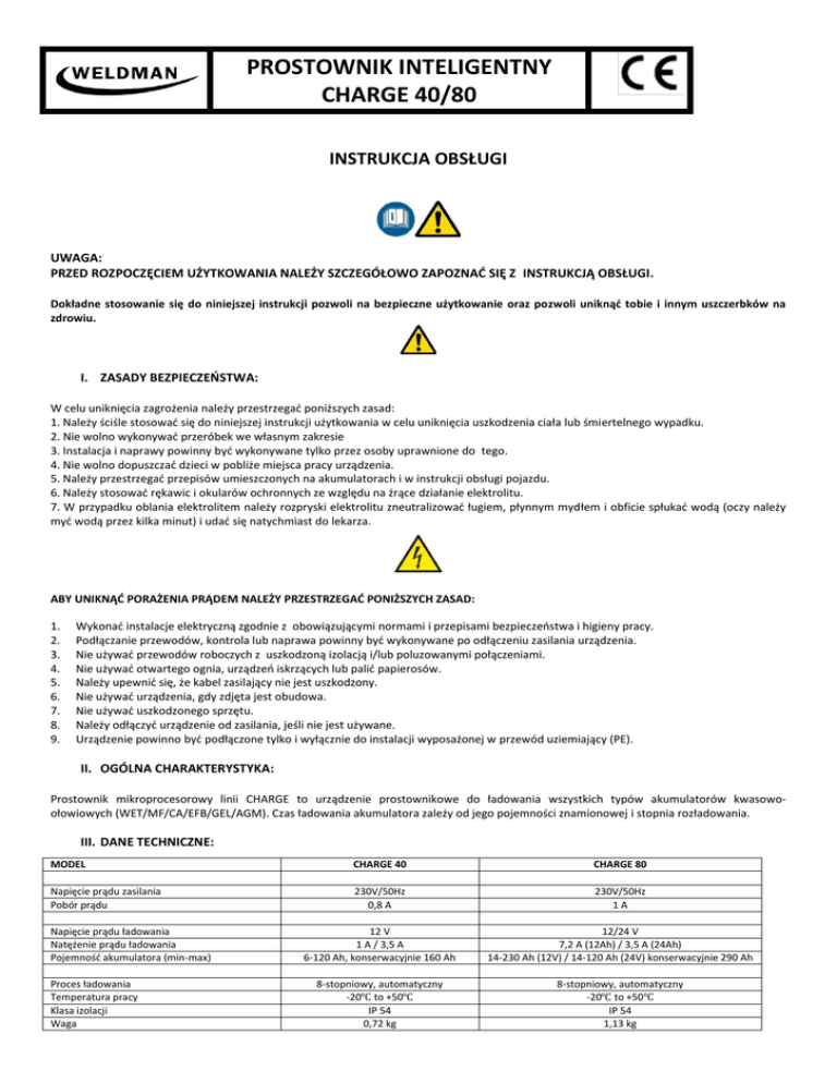 PROSTOWNIK INTELIGENTNY CHARGE 40/80 INSTRUKCJA OBSŁUGI UWAGA: PRZED ROZPOCZĘCIEM UŻYTKOWANIA NALEŻY SZCZEGÓŁOWO ZAPOZNAĆ SIĘ Z INSTRUKCJĄ OBSŁUGI. Dokładne stosowanie się do niniejszej instrukcji pozwoli na bezpieczne użytkowanie oraz pozwoli uniknąć tobie i innym uszczerbków na zdrowiu. I. ZASADY BEZPIECZEŃSTWA: W celu uniknięcia zagrożenia należy przestrzegać poniższych zasad: 1. Należy ściśle stosować się do niniejszej instrukcji użytkowania w celu uniknięcia uszkodzenia ciała lub śmiertelnego wypadku. 2. Nie wolno wykonywać przeróbek we własnym zakresie 3. Instalacja i naprawy powinny być wykonywane tylko przez osoby uprawnione do tego. 4. Nie wolno dopuszczać dzieci w pobliże miejsca pracy urządzenia. 5. Należy przestrzegać przepisów umieszczonych na akumulatorach i w instrukcji obsługi pojazdu. 6. Należy stosować rękawic i okularów ochronnych ze względu na żrące działanie elektrolitu. 7. W przypadku oblania elektrolitem należy rozpryski elektrolitu zneutralizować ługiem, płynnym mydłem i obficie spłukać wodą (oczy należy myć wodą przez kilka minut) i udać się natychmiast do lekarza. ABY UNIKNĄĆ PORAŻENIA PRĄDEM NALEŻY PRZESTRZEGAĆ PONIŻSZYCH ZASAD: 1. 2. 3. 4. 5. 6. 7. 8. 9. Wykonać instalacje elektryczną zgodnie z obowiązującymi normami i przepisami bezpieczeństwa i higieny pracy. Podłączanie przewodów, kontrola lub naprawa powinny być wykonywane po odłączeniu zasilania urządzenia. Nie używać przewodów roboczych z uszkodzoną izolacją i/lub poluzowanymi połączeniami. Nie używać otwartego ognia, urządzeń iskrzących lub palić papierosów. Należy upewnić się, że kabel zasilający nie jest uszkodzony. Nie używać urządzenia, gdy zdjęta jest obudowa. Nie używać uszkodzonego sprzętu. Należy odłączyć urządzenie od zasilania, jeśli nie jest używane. Urządzenie powinno być podłączone tylko i wyłącznie do instalacji wyposażonej w przewód uziemiający (PE). II. OGÓLNA CHARAKTERYSTYKA: Prostownik mikroprocesorowy linii CHARGE to urządzenie prostownikowe do ładowania wszystkich typów akumulatorów kwasowoołowiowych (WET/MF/CA/EFB/GEL/AGM). Czas ładowania akumulatora zależy od jego pojemności znamionowej i stopnia rozładowania. III. DANE TECHNICZNE: MODEL CHARGE 40 CHARGE 80 Napięcie prądu zasilania Pobór prądu 230V/50Hz 0,8 A 230V/50Hz 1A 12 V 1 A / 3,5 A 6-120 Ah, konserwacyjnie 160 Ah 12/24 V 7,2 A (12Ah) / 3,5 A (24Ah) 14-230 Ah (12V) / 14-120 Ah (24V) konserwacyjnie 290 Ah 8-stopniowy, automatyczny -20℃ to +50℃ IP 54 0,72 kg 8-stopniowy, automatyczny -20℃ to +50℃ IP 54 1,13 kg Napięcie prądu ładowania Natężenie prądu ładowania Pojemność akumulatora (min-max) Proces ładowania Temperatura pracy Klasa izolacji Waga IV. OPIS PANELU PROSTOWNIKA 1. 2. 3. 4. 5. 6. 7. Dioda LED alarmu Wskaźnik poziomu naładowania Włącznik główny Przycisk przełączania trybu ładowania MODE Diody LED prądu ładowania Dioda LED ładowania prądem o niskim napięciu Dioda LED zmiany napięcia zasilania (tylko mod. 80) V. INSTALACJA Ustawić prostownik na równej i suchej powierzchni z dala od łatwopalnych przedmiotów oraz upewnić się czy nie dostają się do wnętrza pyły, opary korozyjne, wilgoć. PODŁĄCZENIE DO SIECI Przed przystąpieniem do podłączenia elektrycznego należy: - sprawdzić czy dane znajdujące się na tabliczce odpowiadają wartościom napięcia i częstotliwości sieci w miejscu pracy urządzenia - sprawdzić czy sieć zasilająca pokrywa zapotrzebowanie mocy wejściowej - sprawdzić czy wartości bezpieczników są zgodne z podanymi w danych technicznych - skontrolować połączenia przewodów uziemiających. Prostownik jest zasilany przewodem z wtyczką 230V. PODŁĄCZENIA ELEKTRYCZNE POWINNY BYĆ WYKONYWANE WYŁĄCZNIE PRZEZ PERSONEL DOŚWIADCZONY LUB WYKWALIFIKOWANY PRZYGOTOWANIE DO PRACY: 1) 2) 3) 4) 5) 6) 7) 8) 9) Przed podłączeniem do sieci należy upewnić się czy wyłącznik główny jest w pozycji wyłączonej. Sprawdzić bezpiecznik, w razie wadliwego wymienić. Podłączyć przewody wyjściowe do odpowiednich gniazd 12V lub 24V. Podłączyć przewód zasilający do instalacji. W przypadku ładowania akumulatora odłączonego od instalacji elektrycznej w samochodzie należy przewody wyjściowe podłączyć do biegunów akumulatora: najpierw uchwyt czarny do bieguna (-), następnie czerwony do bieguna (+). W przypadku ładowania akumulatora podłączonego do instalacji elektrycznej w samochodzie podłączamy do klem akumulatora najpierw zacisk o biegunowości przeciwnej do biegunowości (masy) pojazdu. Przed rozpoczęciem ładowania akumulatora należy sprawdzić czy zaciski, połączenia i klemy mają dobre połączenia z biegunami akumulatora, ewentualnie należy je oczyścić z nalotu oraz sprawdzić i ewentualnie uzupełnić poziom elektrolitu w celach. Po naładowaniu należy wyłączyć zasilanie prostownika i zdjąć zaciski z akumulatora (pierwszy uchwyt o tej samej biegunowości co pojazd (masa). Funkcja pamięci automatycznie przywróci ostatnio wybrany tryb pracy w przypadku ponownego włączenia prostownika do zasilania. VI. ŁADOWANIE 8-stopniowy proces ładowania zapewnia uzyskanie optymalnych parametrów ładowania: ETAP 1: DIAGNOSTYKA: analiza akumulatora, jego stanu naładowania oraz poprawności połączeń pomiędzy akumulatorem i prostownikiem ETAP 2: ODSIARCZANIE: rozpoznanie zasiarczonego akumulatora, ładowanie prądem pulsującym o niskim napięciu i wysokim natężeniu umożliwia usunięcie siarczanu z płytek akumulatora, dzięki czemu zostaje przywrócona jego początkowa pojemność ETAP 3: MIĘKKI START: sprawdzenie czy akumulator nie jest uszkodzony i czy może przyjąć prąd ładowania (zapobiega ładowaniu uszkodzonego akumulatora); jeśli akumulator nie jest uszkodzony rozpoczyna się ładowanie stopniowo zwiększając natężenie prądu ładowania ETAP 4: ŁADOWANIE ZASADNICZE: ładowan