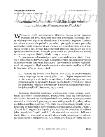 Postindustri Marcin Wądołowski Akademia Ignatianum w Krakowie DOI: 10.14746/r.2015.1.7 Postindustrialna tożsamość śląskiego miasta na przykładzie Siemianowic Śląskich W Górnego Śląska przez przeszło dwieście lat była miejscem rozwoju przemysłu ciężkiego, który odcisnął swe piętno na charakterze i wizerunku regionu. Zmiana ustrojowa w państwie polskim po 1989 r. pociągała za sobą potrzebę restrukturyzacji gospodarki, co wiązało się z zamknięciem wielu śląskich kopalń i hut. Proces ten rozpoczął głębokie przemiany na polu społeczno-kulturowym, których przejawem są poszukiwania nowej tożsamości regionu (Wódz, Wódz, 2005, s. 7 – 14). Po przemianach demokratycznych i wprowadzeniu w 1990 r. Ustawy o samorządzie terytorialnym nastąpił również ogólnopolski wzrost zainteresowania sprawami lokalnymi i ożywienie się ruchów regionalnych. W przypadku Śląska można mówić o ziszczeniu się słów ks. Emila Szramka, który w 1934 r. pisał: schodnia część historycznego „(…) kończy się bierna rola Śląska. Nie tylko, że problematyką swoją przyciąga coraz więcej głów i serc. Ciepło, nagromadzone w nim w całych stuleciach «narożnikowych» dziejów jego, zaczyna promieniować na zewnątrz. Ślązak dochodzi do wymodlonej przez ks. Bończyka «męskiej dojrzałości» i poczyna ekspansywnie działać jako przykład” (Szramek, 1934, s. 67). Renesans śląskości obejmuje współcześnie coraz szersze spektrum społecznej rzeczywistości. Popularnym staje się odwoływanie do śląskich korzeni czy śląskiego charakteru, co bywa wykorzystywane również w działaniach promocyjno-marketingowych. Przykłady widać nie tylko na półkach sklepowych, gdzie znaleźć można produkty odwołujące się do regionalnej proweniencji, jak chociażby: „Śląskie Oblaty”, „Śląski Żur”, regionalne śląskie piwa czy śląskie bombony określane jako „kopalnioki” bądź „szkloki”, ale również na miejskich billboardach, które wykorzystali w swoich działaniach promocyjnych włodarze analizowanej miejscowości, tj. Siemianowic Śląskich (patrz Zdjęcie nr 11, wiosna-lato 2015 [81] Marcin Wądołowski 1.). „Siemianowice dobre bo Śląskie” – slogan tej treści, umieszczany w różnych miejscach na terenie miasta, promuje od jakiegoś czasu gminę i wpisuje się w strategię marketingową miejscowego samorządu terytorialnego, która rozumiana jest jako „zintegrowany zespół instrumentów i działań marketingowych mających na celu wzrost zdolności konkurencyjnej wyodrębnionej, zagospodarowanej przestrzeni” (Klisiński, Widera, 2006, s. 9 – 10). Celem niniejszego artykułu jest przedstawienie analizy współczesnej tożsamości typowego poprzemysłowego śląskiego miasta na przykładzie Siemianowic Śląskich. Z jednej strony zobrazowany zostanie stosunek władz miejskich wobec industrialnego dziedzictwa, zaś z drugiej ożywienie się śląskiego ruchu regionalnego na terenie miasta. Zweryfikowana zostanie hipoteza mówiąca o kapitalizacji śląskiej kultury na terenach, które przez stulecia miały charakter industrialny, natomiast obecna sytuacja polityczno – gospodarcza wymaga poszukiwań nowej drogi ich dalszego egzystowania. W myśl tej tezy śląska kultura oraz różne formy rozrywki mają stanowić gałęzie zastępcze dla dotychczasowej działalności przemysłowej, zaś towarzyszące temu przedsięwzięcia, skupione wokół dowartościowania kultury regionalnej, prowadzić będą do rozwoju śląskiej tożsamości. Zdjęcie 1. Billboard promujący siemianowickie tereny inwestycyjne, umieszczony na terenie Kompleksu Sportowego „Siemion” w Siemianowicach Śląskich. Źródło: archiwum autora. [82] refleksje Postindustrialna tożsamoś śląskiego miasta na przykładzie Siemianowic Śląskich. Od „miasta węgla i stali” do „miasta sportu i rekreacji” Siemianowice Śląskie położone są w centrum konurbacji górnośląskiej, obok takich miast jak: Katowice, Chorzów, Piekary Śląskie, Czeladź oraz Wojkowice. Dzieje miasta są ściśle związane z industrializacją całego regionu, rozpoczętą pod koniec XVIII w. i trwającą na przestrzeni XIX i XX w. Do 1989 r. Siemianowice postrzegane były jako typowe miasto węgla i stali (patrz Zdjęcie 2.). Na jego obszarze na przestrzeni lat powstawały liczne kopalnie węgla kamiennego, huta stali (jej początki datowane są na 1836 r.) oraz mniejsze zakłady przemysłowe, jak chociażby fabryka kotłów parowych Fitznera. W 1969 r. funkcjonowały na terenie miasta dwie kopalnie: „Michał” i „Siemianowice”, huta „Jedność”, Zakłady Cukiernicze „Hanka”, Fabryka Śrub i Nitów, centralny zakład przedsiębiorstwa „Kotłomontaż” oraz duże zakłady mechaniczne (Liszka, 1969, s. 6). Po transformacji ustrojowej w 1989 r. większość z tych zakładów została zlikwidowana, co spowodowało, że bezrobocie w mieście sięgnęło w 2004 r. około 30% i było jednym z najwyższych w kraju (Stopa, 2004). Zdjęcie 2. Mural w centrum Siemianowic Śląskich z okresu PRL. Źródło: archiwum autora. nr 11, wiosna-lato 2015 [83] Marcin Wądołowski W obliczu upadającego przemysłu władze miejskie zmuszone były do znalezienia alternatywnej drogi dla dalszego funkcjonowania Siemianowic. Rozpoczęto poszukiwania zagranicznych inwestorów, co zaowocowało przyciągnięciem takich firm jak choćby Johnson Controls czy Huhtamaki. Dzięki tym działaniom bezrobocie spadło do poziomu ok. 14% w 2014 r. (Stopa, 2014). Proces przemian wiązał się również ze zmianą wizerunku miasta. Początkowe działania skupione były na kreowaniu Siemianowic jako „miasta sportu i rekreacji”. W tym celu wybudowano nowoczesne boisko do gry w hokeja na trawie, do którego następnie dobudowano trybunę (patrz Zdjęcie 3.). Zdjęcie 3. Boisko do hokeja na trawie w Siemianowicach Śląskich. W tle widać komin – pozostałość po tutejszym prze
