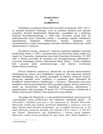 MARIAWICI W DABRÓWCE Wspólnota wyznaniowa Mariawitów powstała na przełomie XIX i XX w. na terenach Królestwa Polskiego, czyli na ziemiach polskich pod zaborem rosyjskim. Kościół Starokatolicki Mariawitów wyodrębnił się z polskiego Kościoła Rzymskokatolickiego w 1906 roku. Powodem secesji było nie zaakceptowanie przez hierarchię polską i rzymskiego papieża działalności Zgromadzenia Kapłanów Mariawitów, którego członkami byli rzymskokatoliccy księża dostrzegający potrzebę odrodzenia duchowego wśród duchowieństwa i wiernych. Początkowo termin „mariawici” oznaczał wspólnotę kapłanów Kościoła katolickiego, którzy w 1883 r. zawiązali tajne stowarzyszenie księży oparte na I regule św. Franciszka. Inspiratorką ruchu była Franciszka Kozłowska. W 1893 roku w Płocku, powołane do szerzenia czci Przenajświętszego Sakramentu i wzywania nieustającej pomocy Najświętszej Maryi Panny.1 Celem wspólnoty było szerzenie kultu eucharystycznego oraz odnowa wewnętrzna duchowieństwa polskiego. Pierwsi duchowni mariawiccy rekrutowali się spośród duchowieństwa katolickiego.Na starcie swej działalności mariawici siłą zajmowali kościoły obrządku łacińskiego, lecz później przystąpili do budowy własnych świątyń. Zazwyczaj zakładali nowe wspólnoty w parafiach, gdzie dochodziło do konfliktów duchowieństwa katolickiego z wiernymi. Najczęstszą przyczyną konfliktów była kwestia pobierania ofiar za posługi religijne. Księża mariawiccy starali się przewyższać księży katolickich gorliwością, pobożnością i niepobieraniem ofiar za posługi. W latach 1911–1914 mariawici wybudowali w Płocku swój kościół i klasztor i tam ustanowili swoją siedzibę. Jak podaje Jan Mirończuk w wielu parafiach katolickich mariawityzm był „zaszczepiany" przez proboszczów lub wikariuszy sąsiednich parafii. „ W Chorzelach i Kadzidle pracował w roli wikaryusza ks. Wacław Żebrowski, Maryawita. Dzięki jego naukom, gorliwości kapłańskiej a zwłaszcza życiu bez skazy, Kurpie mieli możność przekonania się, że kapłan Chrystusowy, to nie jakaś oderwana, poetyczna mrzonka, ale człowiek z krwi i kości [...] Tak też i nasi Kurpie. Zapoznawszy sięz działalnością i owocną pracą kapłanaMaryawity, całem sercem przylgnęli do tego ruchu, który takich kapłanów w 1 www.mariawita.pl społeczeństwie naszem zrodził". / „Kalendarz Maryawicki" 1909, s. 46. Ks. Żebrowski był wikariuszem w Kadzidle od kwietnia 1904 do września 1905/. W lutym 1906 r. ks. Żebrowski przybył do wsi Długi Kąt i tam w prywatnej kaplicy należącej do rodziny Prusaczyków zaczął odprawiać nabożeństwa.2 Na Kurpiach mariawici pojawili się niedługo po ich powstaniu. Wynikało to z bliskości do Płocka oraz z faktu, że tereny te należały do diecezji płockiej, gdzie powstał i szerzył się mariawityzm. W okolicach Ostrołęki mariawici pojawili się po 1905 r. w parafiach Jelonki i Kadzidło. W Jelonkach miejscowy proboszcz ks. Zygmunt Seryjko, chociaż sam sprzyjał temu ruchowi, jednak nie przeszedł na mariawityzm, którego zwolennicy przetrwali w parafii zaledwie rok.3 Prowadzenie nabożeństw oraz próba wybudowania w Długim Kącie świątyni spotykała się z niechęcią i wrogością mieszkańców wsi. Ostatecznie w 1907 r. ukończono budowę drewnianego kościoła. Mariawicka parafia kadzidlańska w Długim Kącie przyjęła wezwanie Przenajświętszego Sakramentu. Jej duszpasterzem został ks. Władysław Zbirochowicz, który przyjeżdżał do wsi raz w miesiącu ze Smogorzewa, niedaleko Pułtuska. Duchowny ten należący do Starokatolickiego Kościoła Mariawitów w 1906 r. założył wspólnotę mariawicką w Smogorzewie. W Długim Kącie mieszkały także siostry mariawitki, które zajmowały się haftowaniem. Drewniany kościół został później przeniesiony do wsi Brzozówka, gdzie znacząco zwiększyła się liczba wiernych mariawickich. Wierni tego wyznania zamieszkiwali również w Tatarach, Kadzidle, Lelisie, Jeglijowcu, Szafarni, Gibałkach, Glebach oraz w Dąbrówce Ostrołęckiej.4 Chociaż nie ma pisanych dokumentów o działalności Mariawitów w Dąbrówce, poza opisami Adama Chętnika, to jeszcze dzisiaj w pamięci starszych ludzi są pojedyncze elementy wspomnień o mariawitach . O niepokojach z tym związanych i gorliwości księży mariawickich. Pamiętają to z własnego życia, bądź też, słyszeli od swoich rodziców świadków tych wydarzeń. W zachowanych dokumentach widoczne są konflikty między duchownymi mariawickimi i katolickimi. dotyczyło to m.in. posług sakramentalnych, głównie małżeństw. Małżeństwa błogosławione przez duchownego mariawickiego niekiedy uważano za nieważne prawnie.5 2 Jan Mirończuk: Rzymskjokatolicy a inne wyznania chrześcijańskie w powiecie ostrołęckim, Zeszyty Naukowe Ostrołęckiego Towarzystwa Naukowego 21/2007, str. 81. 3 Jozef Łupiński: Działalność Mariawitów na Kurpiach, Studia Łomżyńskie t.XXiII, Łomża 2012, str.68. 4 Jozef Łupiński: Działalność Mariawitów na Kurpiach, Studia Łomżyńskie t.XXiII, Łomża 2012, str.69. 5 Józef Łupiński Działalność Mariawitów na Kurpiach, Studia Łomżyńskie t.XXiII, Łomża 2012, str.69. Niechętny czy wręcz wrogi stosunek do mariawitów prezentowali proboszczowie katolickich parafii. Z nieukrywaną satysfakcją przypisywali duchownym mariawickim niewłaściwy stosunek do władz odrodzonej Rzeczypospolitej: „stawił się osobiście zawezwany przeze mnie niżej podpisanego proboszcza Antoni Mąka szeregowiec zapasowy rocznik 1902 zam. w Dąbrówce i w obecności pełnoletnich świadków [...] oświadczył, że w miesiącu lutym r. b./1924/ ożenił się z Heleną Wiśniewską z Lelisa parafii Kadzidleńskiej, ponieważ jest wojskowym, a nie mógł wykazać się pozwoleniem odnośnych władz na zawarcie związku małżeńskiego, przeto proboszcz Kadzidleński odmówił mu pobłogosławie