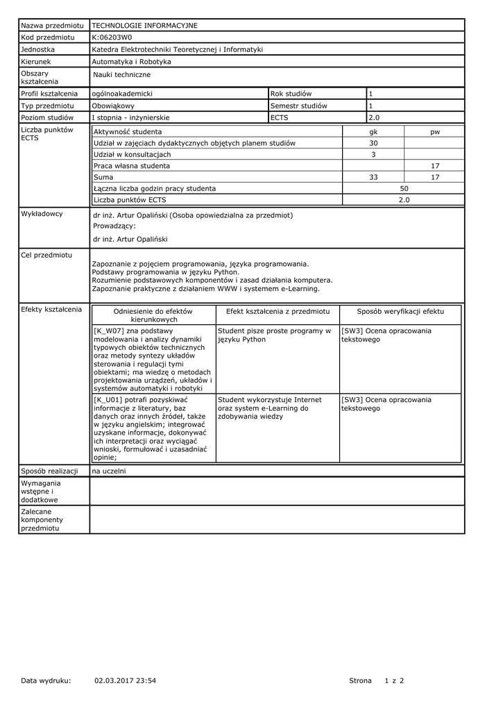 Nazwa przedmiotu TECHNOLOGIE INFORMACYJNE Kod przedmiotu K:06203W0 Jednostka Katedra Elektrotechniki Teoretycznej i Informatyki Kierunek Automatyka i Robotyka Obszary kształcenia Nauki techniczne Profil kształcenia ogólnoakademicki Rok studiów 1 Typ przedmiotu Obowiąkowy Semestr studiów 1 Poziom studiów I stopnia - inżynierskie ECTS 2.0 Liczba punktów ECTS Aktywność studenta gk Udział w zajęciach dydaktycznych objętych planem studiów 30 Udział w konsultacjach pw 3 Praca własna studenta 17 Suma Wykładowcy 33 17 Łączna liczba godzin pracy studenta 50 Liczba punktów ECTS 2.0 dr inż. Artur Opaliński (Osoba opowiedzialna za przedmiot) Prowadzący: dr inż. Artur Opaliński Cel przedmiotu Zapoznanie z pojęciem programowania, języka programowania. Podstawy programowania w języku Python. Rozumienie podstawowych komponentów i zasad działania komputera. Zapoznanie praktyczne z działaniem WWW i systemem e-Learning. Efekty kształcenia Sposób realizacji Odniesienie do efektów kierunkowych Efekt kształcenia z przedmiotu Sposób weryfikacji efektu [K_W07] zna podstawy Student pisze proste programy w modelowania i analizy dynamiki języku Python typowych obiektów technicznych oraz metody syntezy układów sterowania i regulacji tymi obiektami; ma wiedzę o metodach projektowania urządzeń, układów i systemów automatyki i robotyki [SW3] Ocena opracowania tekstowego [K_U01] potrafi pozyskiwać informacje z literatury, baz danych oraz innych źródeł, także w języku angielskim; integrować uzyskane informacje, dokonywać ich interpretacji oraz wyciągać wnioski, formułować i uzasadniać opinie; [SW3] Ocena opracowania tekstowego Student wykorzystuje Internet oraz system e-Learning do zdobywania wiedzy na uczelni Wymagania wstępne i dodatkowe Zalecane komponenty przedmiotu Data wydruku: 02.03.2017 23:54 Strona 1 z 2 Treść przedmiotu Wprowadzenie do zagadnień związanych z technologiami informacyjnymi. Zdalne nauczanie (e-learning). Technologie wspomagające edukację i szkolenie. Przetwarzania informacji, definicja komputera, pojęcie Internetu. Budowa i działanie komputera. Podstawowe technologie Internetu: routing i WWW, funkcje i budowa wyszukiwarek internetowych i WebCrawlerów. Programowanie w języku Python. Interpretacja kodu źródłowego do języka maszynowego. Wejście i wyjście podczas przetwarzania danych. Dane a kod. Odmienne struktury danych, Warunkowe wykonanie kodu. Wykonanie kodu w pętli. Pojęcie weryfikacji poprawności programu. Podstawowa analiza kodu. Pojęcie debuggingu. Pojęcie algorytmu. Złożoność algorytmów. Zalecana lista lektur Literatura podstawowa 1. 2. 3. 4. DuBois P.: MySQL, MIKOM, Warszawa 2000. Kierzkowski A.: PHP 4. Tworzenie stron WWW. Ćwiczenia praktyczne, HELION Wydawnictwo S.A. Gliwice 2002. Krzymowski B.: Access 2000 PL, Help, Warszawa 1999. Elmasri R. Shamkant B.: Wprowadzenie do systemów baz danych, HELION Wydawnictwo S.A. Gliwice 2002. Literatura uzupełniająca Materiały dydaktyczne na portalu e-Learning przedmiotu: http://moodle.ely.pg.gda.pl Formy zajęć i metody nauczania Forma zajęć Liczba godzin zajęć Suma godzin dydaktycznych w semestrze, objętych planem studiów Wykład Ćwiczenia Laboratorium Projekt Seminarium 30.0 0.0 0.0 0.0 0.0 30 W tym kształcenie na odległość: 0.0 Metody i kryteria oceniania Kryteria oceniania: składowe Próg zaliczeniowy Procent oceny końcowej Sprawdzian na koniec semestru 60.0 66.0 Prace domowe 60.0 34.0 Przykładowe zagadnienia / Przykładowe zadania / Realizowane zadania Co to jest komputer? Co to jest język programowania? Jak reprezentowana jest strona WWW w komputerze? Na czym polega programowanie komputera? Jakie są podstawowe komponenty komputera, i jak wpływają na całkowitą wydajność systemu? Jakie są podstawowe komponenty CPU, i jakie są ich funkcje? Język wykładowy polski Praktyki zawodowe Nie dotyczy Data wydruku: 02.03.2017 23:54 Strona 2 z 2