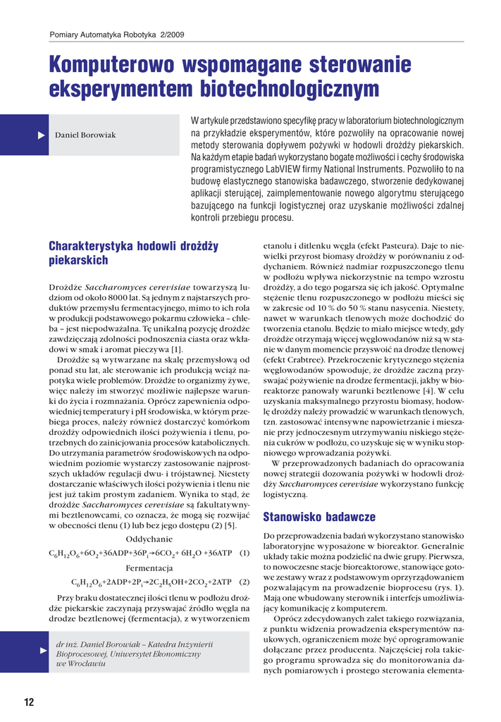 Pomiary Automatyka Robotyka 2/2009 Komputerowo wspomagane sterowanie eksperymentem biotechnologicznym W artykule przedstawiono specyfikę pracy w laboratorium biotechnologicznym na przykładzie eksperymentów, które pozwoliły na opracowanie nowej metody sterowania dopływem pożywki w hodowli drożdży piekarskich. Na każdym etapie badań wykorzystano bogate możliwości i cechy środowiska programistycznego LabVIEW firmy National Instruments. Pozwoliło to na budowę elastycznego stanowiska badawczego, stworzenie dedykowanej aplikacji sterującej, zaimplementowanie nowego algorytmu sterującego bazującego na funkcji logistycznej oraz uzyskanie możliwości zdalnej kontroli przebiegu procesu. Daniel Borowiak Charakterystyka hodowli drożdży piekarskich Drożdże Saccharomyces cerevisiae towarzyszą ludziom od około 8000 lat. Są jednym z najstarszych produktów przemysłu fermentacyjnego, mimo to ich rola w produkcji podstawowego pokarmu człowieka – chleba – jest niepodważalna. Tę unikalną pozycję drożdże zawdzięczają zdolności podnoszenia ciasta oraz wkładowi w smak i aromat pieczywa [1]. Drożdże są wytwarzane na skalę przemysłową od ponad stu lat, ale sterowanie ich produkcją wciąż napotyka wiele problemów. Drożdże to organizmy żywe, więc należy im stworzyć możliwie najlepsze warunki do życia i rozmnażania. Oprócz zapewnienia odpowiedniej temperatury i pH środowiska, w którym przebiega proces, należy również dostarczyć komórkom drożdży odpowiednich ilości pożywienia i tlenu, potrzebnych do zainicjowania procesów katabolicznych. Do utrzymania parametrów środowiskowych na odpowiednim poziomie wystarczy zastosowanie najprostszych układów regulacji dwu- i trójstawnej. Niestety dostarczanie właściwych ilości pożywienia i tlenu nie jest już takim prostym zadaniem. Wynika to stąd, że drożdże Saccharomyces cerevisiae są fakultatywnymi beztlenowcami, co oznacza, że mogą się rozwijać w obecności tlenu (1) lub bez jego dostępu (2) [5]. Oddychanie C6H12O6+6O2+36ADP+36Pi®6CO2+ 6H2O +36ATP (1) Fermentacja C6H12O6+2ADP+2Pi®2C2H5OH+2CO2+2ATP (2) Przy braku dostatecznej ilości tlenu w podłożu drożdże piekarskie zaczynają przyswajać źródło węgla na drodze beztlenowej (fermentacja), z wytworzeniem 12 dr inż. Daniel Borowiak – Katedra Inżynierii Bioprocesowej, Uniwersytet Ekonomiczny we Wrocławiu etanolu i ditlenku węgla (efekt Pasteura). Daje to niewielki przyrost biomasy drożdży w porównaniu z oddychaniem. Również nadmiar rozpuszczonego tlenu w podłożu wpływa niekorzystnie na tempo wzrostu drożdży, a do tego pogarsza się ich jakość. Optymalne stężenie tlenu rozpuszczonego w podłożu mieści się w zakresie od 10 % do 50 % stanu nasycenia. Niestety, nawet w warunkach tlenowych może dochodzić do tworzenia etanolu. Będzie to miało miejsce wtedy, gdy drożdże otrzymają więcej węglowodanów niż są w stanie w danym momencie przyswoić na drodze tlenowej (efekt Crabtree). Przekroczenie krytycznego stężenia węglowodanów spowoduje, że drożdże zaczną przyswajać pożywienie na drodze fermentacji, jakby w bioreaktorze panowały warunki beztlenowe [4]. W celu uzyskania maksymalnego przyrostu biomasy, hodowlę drożdży należy prowadzić w warunkach tlenowych, tzn. zastosować intensywne napowietrzanie i mieszanie przy jednoczesnym utrzymywaniu niskiego stężenia cukrów w podłożu, co uzyskuje się w wyniku stopniowego wprowadzania pożywki. W przeprowadzonych badaniach do opracowania nowej strategii dozowania pożywki w hodowli drożdży Saccharomyces cerevisiae wykorzystano funkcję logistyczną. Stanowisko badawcze Do przeprowadzenia badań wykorzystano stanowisko laboratoryjne wyposażone w bioreaktor. Generalnie układy takie można podzielić na dwie grupy. Pierwsza, to nowoczesne stacje bioreaktorowe, stanowiące gotowe zestawy wraz z podstawowym oprzyrządowaniem pozwalającym na prowadzenie bioprocesu (rys. 1). Mają one wbudowany sterownik i interfejs umożliwiający komunikację z komputerem. Oprócz zdecydowanych zalet takiego rozwiązania, z punktu widzenia prowadzenia eksperymentów naukowych, ograniczeniem może być oprogramowanie dołączane przez producenta. Najczęściej rola takiego programu sprowadza się do monitorowania danych pomiarowych i prostego sterowania elementa- Pomiary Automatyka Robotyka 2/2009 czenie ikon (funkcji) zgodnie z typem danych i kierunkiem ich przepływu. Za pomocą prostych elementów graficznych można szybko zaimplementować nawet bardzo rozbudowane algorytmy sterujące oraz procedury odpowiedzialne za wizualizację wyników i komunikację z operatorem. Zastosowanie środowiska programistycznego LabVIEW znacznie skraca czas potrzebny na stworzenie programu kontrolującego przebieg eksperymentów laboratoryjnych. Podczas badań w bioreaktorze z układem pomiarowo-sterującym (rys. 3) przeprowadzono 78 eksperymentów, z których każdy trwał dwanaście lub szesnaRys. 1. Zintegrowana stacja bioreaktorowa [www.sartorius-stedim.com] mi wykonawczymi. Program nie pozwala na zaimplementowanie skomplikowanych i rozbudowanych algorytmów sterowania wykorzystujących np. modele matematyczne czy techniki sztucznej inteligencji. Druga grupa, to stanowiska bioreaktorowe składające się z oddzielnych urządzeń różnych producentów, współpracujących ze sobą jako otoczenie bioreaktora (rys. 2). Pomimo, że zestaw taki zajmuje znacznie więcej miejsca i prezentuje się najczęściej mało estetycznie, to jego niewątpliwą zaletą jest ogromna elastyczność w doborze urządzeń i ich konfigurowaniu. Największym mankamentem takiego roz- Rys. 3. Schemat układu pomiarowo-sterującego wykorzystanego w ekspewiązania jest to, że komputerowo wspomagarymentach: 1 – bioreaktor, 2 – komputer PC, 3 – karta pomiarowa, 4 – moduły kondycjonujące, 5 – przekaźniki, 6 – regulator obrotów ne sterowanie musi być zaprojektowane i zamieszadła, 7 