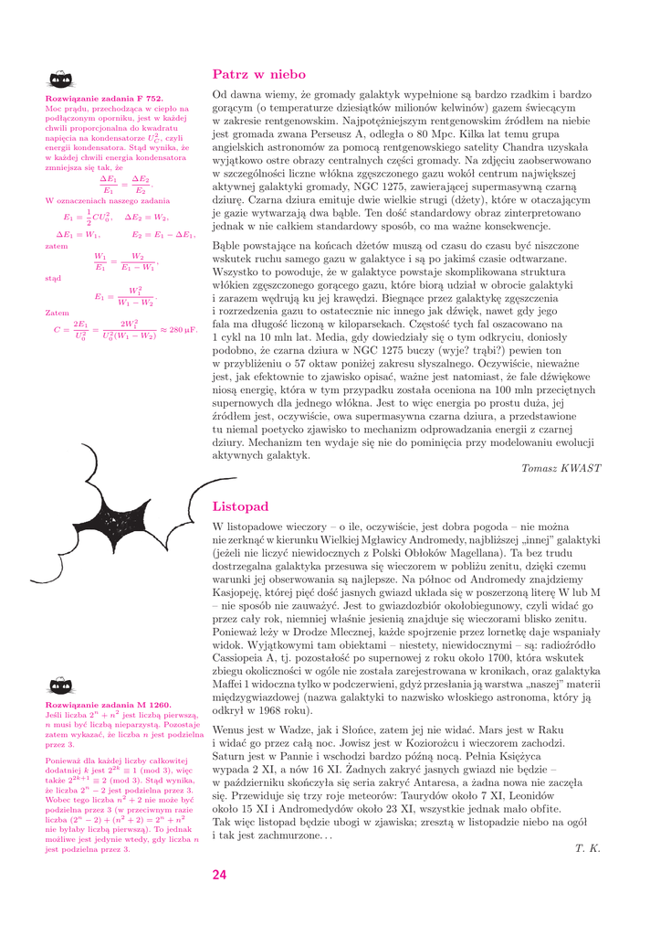 Patrz w niebo Rozwiązanie zadania F 752. Moc prądu, przechodząca w ciepło na podłączonym oporniku, jest w każdej chwili proporcjonalna do kwadratu 2 napięcia na kondensatorze UC , czyli energii kondensatora. Stąd wynika, że w każdej chwili energia kondensatora zmniejsza się tak, że ∆E1 ∆E2 = . E1 E2 W oznaczeniach naszego zadania 1 2 E1 = CU0 , ∆E2 = W2 , 2 ∆E1 = W1 , E2 = E1 − ∆E1 , zatem W2 W1 = , E1 E1 − W1 stąd E1 = W12 . W1 − W2 Zatem C= 2W12 2E1 = 2 ≈ 280 µF. 2 U0 U0 (W1 − W2 ) Od dawna wiemy, że gromady galaktyk wypełnione są bardzo rzadkim i bardzo gorącym (o temperaturze dziesiątków milionów kelwinów) gazem świecącym w zakresie rentgenowskim. Najpotężniejszym rentgenowskim źródłem na niebie jest gromada zwana Perseusz A, odległa o 80 Mpc. Kilka lat temu grupa angielskich astronomów za pomocą rentgenowskiego satelity Chandra uzyskała wyjątkowo ostre obrazy centralnych części gromady. Na zdjęciu zaobserwowano w szczególności liczne włókna zgęszczonego gazu wokół centrum największej aktywnej galaktyki gromady, NGC 1275, zawierającej supermasywną czarną dziurę. Czarna dziura emituje dwie wielkie strugi (dżety), które w otaczającym je gazie wytwarzają dwa bąble. Ten dość standardowy obraz zinterpretowano jednak w nie całkiem standardowy sposób, co ma ważne konsekwencje. Bąble powstające na końcach dżetów muszą od czasu do czasu być niszczone wskutek ruchu samego gazu w galaktyce i są po jakimś czasie odtwarzane. Wszystko to powoduje, że w galaktyce powstaje skomplikowana struktura włókien zgęszczonego gorącego gazu, które biorą udział w obrocie galaktyki i zarazem wędrują ku jej krawędzi. Biegnące przez galaktykę zgęszczenia i rozrzedzenia gazu to ostatecznie nic innego jak dźwięk, nawet gdy jego fala ma długość liczoną w kiloparsekach. Częstość tych fal oszacowano na 1 cykl na 10 mln lat. Media, gdy dowiedziały się o tym odkryciu, doniosły podobno, że czarna dziura w NGC 1275 buczy (wyje? trąbi?) pewien ton w przybliżeniu o 57 oktaw poniżej zakresu słyszalnego. Oczywiście, nieważne jest, jak efektownie to zjawisko opisać, ważne jest natomiast, że fale dźwiękowe niosą energię, która w tym przypadku została oceniona na 100 mln przeciętnych supernowych dla jednego włókna. Jest to więc energia po prostu duża, jej źródłem jest, oczywiście, owa supermasywna czarna dziura, a przedstawione tu niemal poetycko zjawisko to mechanizm odprowadzania energii z czarnej dziury. Mechanizm ten wydaje się nie do pominięcia przy modelowaniu ewolucji aktywnych galaktyk. Tomasz KWAST Listopad Rozwiązanie zadania M 1260. Jeśli liczba 2n + n2 jest liczbą pierwszą, n musi być liczbą nieparzystą. Pozostaje zatem wykazać, że liczba n jest podzielna przez 3. Ponieważ dla każdej liczby całkowitej dodatniej k jest 22k ≡ 1 (mod 3), więc także 22k+1 ≡ 2 (mod 3). Stąd wynika, że liczba 2n − 2 jest podzielna przez 3. Wobec tego liczba n2 + 2 nie może być podzielna przez 3 (w przeciwnym razie liczba (2n − 2) + (n2 + 2) = 2n + n2 nie byłaby liczbą pierwszą). To jednak możliwe jest jedynie wtedy, gdy liczba n jest podzielna przez 3. W listopadowe wieczory – o ile, oczywiście, jest dobra pogoda – nie można nie zerknąć w kierunku Wielkiej Mgławicy Andromedy, najbliższej „innej” galaktyki (jeżeli nie liczyć niewidocznych z Polski Obłoków Magellana). Ta bez trudu dostrzegalna galaktyka przesuwa się wieczorem w pobliżu zenitu, dzięki czemu warunki jej obserwowania są najlepsze. Na północ od Andromedy znajdziemy Kasjopeję, której pięć dość jasnych gwiazd układa się w poszerzoną literę W lub M – nie sposób nie zauważyć. Jest to gwiazdozbiór okołobiegunowy, czyli widać go przez cały rok, niemniej właśnie jesienią znajduje się wieczorami blisko zenitu. Ponieważ leży w Drodze Mlecznej, każde spojrzenie przez lornetkę daje wspaniały widok. Wyjątkowymi tam obiektami – niestety, niewidocznymi – są: radioźródło Cassiopeia A, tj. pozostałość po supernowej z roku około 1700, która wskutek zbiegu okoliczności w ogóle nie została zarejestrowana w kronikach, oraz galaktyka Maffei 1 widoczna tylko w podczerwieni, gdyż przesłania ją warstwa „naszej” materii międzygwiazdowej (nazwa galaktyki to nazwisko włoskiego astronoma, który ją odkrył w 1968 roku). Wenus jest w Wadze, jak i Słońce, zatem jej nie widać. Mars jest w Raku i widać go przez całą noc. Jowisz jest w Koziorożcu i wieczorem zachodzi. Saturn jest w Pannie i wschodzi bardzo późną nocą. Pełnia Księżyca wypada 2 XI, a nów 16 XI. Żadnych zakryć jasnych gwiazd nie będzie – w październiku skończyła się seria zakryć Antaresa, a żadna nowa nie zaczęła się. Przewiduje się trzy roje meteorów: Taurydów około 7 XI, Leonidów około 15 XI i Andromedydów około 23 XI, wszystkie jednak mało obfite. Tak więc listopad będzie ubogi w zjawiska; zresztą w listopadzie niebo na ogół i tak jest zachmurzone. . . T. K. 24