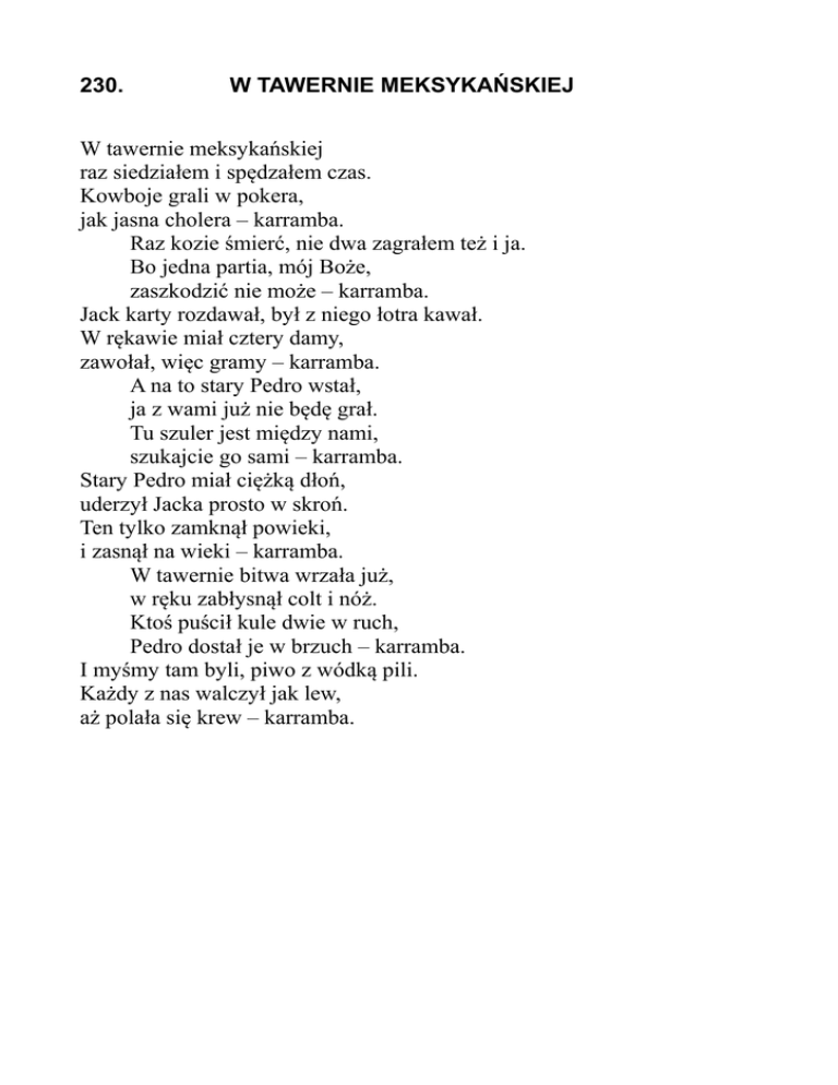 230. W TAWERNIE MEKSYKAŃSKIEJ W tawernie meksykańskiej raz siedziałem i spędzałem czas. Kowboje grali w pokera, jak jasna cholera – karramba. Raz kozie śmierć, nie dwa zagrałem też i ja. Bo jedna partia, mój Boże, zaszkodzić nie może – karramba. Jack karty rozdawał, był z niego łotra kawał. W rękawie miał cztery damy, zawołał, więc gramy – karramba. A na to stary Pedro wstał, ja z wami już nie będę grał. Tu szuler jest między nami, szukajcie go sami – karramba. Stary Pedro miał ciężką dłoń, uderzył Jacka prosto w skroń. Ten tylko zamknął powieki, i zasnął na wieki – karramba. W tawernie bitwa wrzała już, w ręku zabłysnął colt i nóż. Ktoś puścił kule dwie w ruch, Pedro dostał je w brzuch – karramba. I myśmy tam byli, piwo z wódką pili. Każdy z nas walczył jak lew, aż polała się krew – karramba.