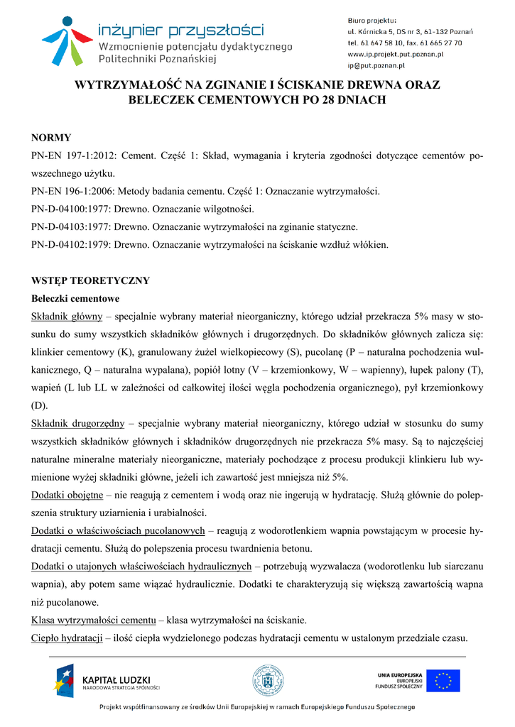 WYTRZYMAŁOŚĆ NA ZGINANIE I ŚCISKANIE DREWNA ORAZ BELECZEK CEMENTOWYCH PO 28 DNIACH NORMY PN-EN 197-1:2012: Cement. Część 1: Skład, wymagania i kryteria zgodności dotyczące cementów powszechnego użytku. PN-EN 196-1:2006: Metody badania cementu. Część 1: Oznaczanie wytrzymałości. PN-D-04100:1977: Drewno. Oznaczanie wilgotności. PN-D-04103:1977: Drewno. Oznaczanie wytrzymałości na zginanie statyczne. PN-D-04102:1979: Drewno. Oznaczanie wytrzymałości na ściskanie wzdłuż włókien. WSTĘP TEORETYCZNY Beleczki cementowe Składnik główny – specjalnie wybrany materiał nieorganiczny, którego udział przekracza 5% masy w stosunku do sumy wszystkich składników głównych i drugorzędnych. Do składników głównych zalicza się: klinkier cementowy (K), granulowany żużel wielkopiecowy (S), pucolanę (P – naturalna pochodzenia wulkanicznego, Q – naturalna wypalana), popiół lotny (V – krzemionkowy, W – wapienny), łupek palony (T), wapień (L lub LL w zależności od całkowitej ilości węgla pochodzenia organicznego), pył krzemionkowy (D). Składnik drugorzędny – specjalnie wybrany materiał nieorganiczny, którego udział w stosunku do sumy wszystkich składników głównych i składników drugorzędnych nie przekracza 5% masy. Są to najczęściej naturalne mineralne materiały nieorganiczne, materiały pochodzące z procesu produkcji klinkieru lub wymienione wyżej składniki główne, jeżeli ich zawartość jest mniejsza niż 5%. Dodatki obojętne – nie reagują z cementem i wodą oraz nie ingerują w hydratację. Służą głównie do polepszenia struktury uziarnienia i urabialności. Dodatki o właściwościach pucolanowych – reagują z wodorotlenkiem wapnia powstającym w procesie hydratacji cementu. Służą do polepszenia procesu twardnienia betonu. Dodatki o utajonych właściwościach hydraulicznych – potrzebują wyzwalacza (wodorotlenku lub siarczanu wapnia), aby potem same wiązać hydraulicznie. Dodatki te charakteryzują się większą zawartością wapna niż pucolanowe. Klasa wytrzymałości cementu – klasa wytrzymałości na ściskanie. Ciepło hydratacji – ilość ciepła wydzielonego podczas hydratacji cementu w ustalonym przedziale czasu. Cement – spoiwo hydrauliczne, tj. drobno zmielony materiał nieorganiczny, który po zmieszaniu z wodą tworzy masę, wiążącą i twardniejącą w wyniku reakcji i procesów hydratacji, zachowującą po stwardnieniu wytrzymałość i trwałość także pod wodą. Spoiwo w betonie – składnik, który w wyniku przemian fizycznych, chemicznych lub fizykochemicznych twardnieje, łącząc się w monolityczną całość z kruszywem. Wyróżnia się spoiwa powietrzne i hydrauliczne. Spoiwo powietrzne – spoiwa, dla których procesy wiązania i twardnienia zachodzą tylko na powietrzu. Należą do nich: wapno zwykłe, wapno suchogaszone (hydratyzowane), gips. Spoiwa hydrauliczne – spoiwa, które po zarobieniu wodą ulegają wiązaniu i twardnieniu zarówno na powietrzu, jak i wodzie. Należą do nich: wapno hydrauliczne, cementy. Zaczyn budowlany - mieszanina spoiwa mineralnego z wodą lub innym roztworem. Wyróżnia się zaczyny: cementowe, wapienne, cementowo-wapienne, gipsowe, gipsowo-wapienne. Zaprawa – mieszanina: spoiwa lub lepiszcz (względnie obu tych materiałów), drobnoziarnistych kruszyw, wody lub innej cieczy zarobowej, ewentualnych dodatków i domieszek, poprawiających właściwości zaprawy świeżej lub stwardniałej. Cementy powszechnego użytku dzieli się na pięć głównych rodzajów: CEM I – cement portlandzki, CEM II – cement portlandzki wieloskładnikowy, CEM III – cement hutniczy, CEM IV – cement pucolanowy, CEM V – cement wieloskładnikowy. Rodzaje cementów powszechnego użytku oraz ich skład: Skład (w procentach masya) Składniki główne Główne rodzaje CEM I Nazwa 27 rodzajów cementów powszechnego użytku Klinkier Żużel wielkopiecowy K S Db P Q V W T L LL CEM I 95100 - - - - - - - - - 0-5 CEM II/A-S 80-94 6-20 - - - - - - - - 0-5 CEM II/B-S 65-79 21-35 - - - - - - - - 0-5 Cement portlandzki krzemionkowy CEM II/A-D 90-94 - 6-10 - - - - - - - 0-5 Cement portlandzki CEM II/A-P 80-94 - - 6-20 - - - - - - 0-5 Cement portlandzki Cement portlandzki żużlowy CEM II Popiół lotny Pył krzemionnaturalna krzemionkowy naturalna wypalana kowy wapienny Skład niki drugorzędne Pucolana Łupek palony Wapień pucolanowy Cement portlandzki popiołowy Cement portlandzki łupkowy Cement portlandzki wapienny Cement portlandzki wieloskładnikowyc CEM III CEM IV CEM V Cement hutniczy Cement pucolanowyc Cement wieloskładnikowyc CEM II/B-P 65-79 - - 21-35 - - - - - - 0-5 CEM II/A-Q 80-94 - - - 6-20 - - - - - 0-5 CEM II/B-Q 65-79 - - - 21-35 - - - - - 0-5 CEM II/A-V 80-94 - - - - 6-20 - - - - 0-5 CEM II/B-V 65-79 - - - - 21-35 - - - - 0-5 CEM II/A-W 80-94 - - - - - 6-20 - - - 0-5 CEM II/B-W 65-79 - - - - - 21-35 - - - 0-5 CEM II/A-T 80-94 - - - - - - 6-20 - - 0-5 CEM II/B-T 65-79 - - - - - - 21-35 - - 0-5 CEM II/A-L 80-94 - - - - - - - 6-20 - 0-5 CEM II/B-L 65-79 - - - - - - - 21-35 - 0-5 CEM II/A-LL 80-94 - - - - - - - - 6-20 0-5 CEM II/B-LL 65-79 - - - - - - - - 21-35 0-5 CEM II/A-M 80-88 ---------------------------------------------------------12-20--------------------------------------------- 0-5 CEM II/B-M 65-79 --------------------------------------------------------------21-35--------------------------------------- 0-5 CEM III/A 35-64 36-65 - - - - - - - - 0-5 CEM III/B 20-34 66-80 - - - - - - - - 0-5 CEM III/C 5-19 81-95 - - - - - - - - 0-5 CEM IV/A 65-89 - ---------------------------------11-35-------------------- - - - 0-5 CEM IV/B 45-64 - ---------------------------------36-55-------------------- - - - 0-5 CEM V/A 40-64 18-30 - ---------------18-30------------ - - - - 0-5 CEM V/B 20-38 31-49 - ---------------31-49------------ - - - - 0-5 Wartości tablicy odnoszą się do sumy składników głównych i drugorzędnych Udział pyłu krzemionkowego 