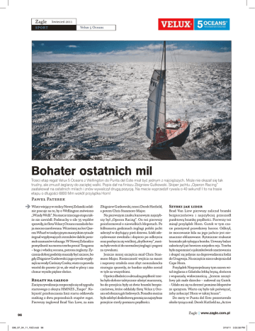Żagle kwiecień 2011 sport Velux 5 Oceans Bohater ostatnich mil Trzeci etap regat Velux 5 Oceans z Wellington do Punta del Este miał być jednym z najcięższych. Może nie okazał się tak trudny, ale zmusił żeglarzy do zaciętej walki. Popis dał na finiszu Zbigniew Gutkowski. Skiper jachtu „Operon Racing” zaatakował na ostatnich milach i znów wywalczył drugą pozycję. Na mecie wyprzedził rywala o 40 sekund! I to na trasie etapu o długości 6800 Mm wokół przylądka Horn! Paweł Paterek Wiatr wiejący w stolicy Nowej Zelandii solidnie pracuje na to, by o Wellington mówiono „Windy Welli”. Na starcie trzeciego etapu także nie zawiódł. Podmuchy o sile 35 węzłów sprawiły, że flota Velux 5 Oceans ruszała do boju mocno zarefowana. Wcześniej na kei Queens Wharf w tradycyjnym maoryskim rytuale żegnał wypływajcych sterników daleki potomek szamanów tohunga. W Nowej Zelandii o pomyślność na morzu trzeba prosić Tangaroa – boga i władcę oceanu, patrona żeglarzy. Życzenia dobrej podróży musiały być szczere, bo gdy Zbigniew Gutkowski i jego rywale wypłynęli na wody Cieśniny Cooka, wiatr co prawda wzrósł do prawie 50 w, ale wiał w plecy i zza chmur wyszło piękne słońce. Regaty na całego Zacięta rywalizacja rozpoczęła się od sygnału startowego z okrętu HMNZS „Taupo”. Kolejność przekraczania linii startu oddawała ranking z dwu poprzednich etapów regat. Pierwszy żeglował Brad Van Liew, za nim 96 096_97_04_11_V5O.indd 96 Zbigniew Gutkowski, trzeci Derek Hatfield, a potem Chris Stanmore-Major. Na pierwszym znaku kursowym najszybszy był „Operon Racing”. On też pierwszy poinformował o niewielkich kłopotach. Po kilkunastu godzinach żeglugi polski jacht uderzył w dryfujący pień drzewa. Łódź zdecydowanie zwolniła i dopiero po odkryciu oraz pozbyciu się wielkiej „dryfkotwy”, można było wrócić do normalnej żeglugi i pogoni za rywalami. Jeszcze mniej szczęścia miał Chris Stanmore-Major. Konieczność wejścia na maszt i naprawy sztaksla oraz zbyt nonszalancka strategia sprawiły, że bardzo szybko został w tyle za wszystkimi. Oprócz dbałości o aktualną prędkość trzeba było dobrze taktycznie ułożyć marszrutę, bo do przejścia były aż dwie bramki bezpieczeństwa, które oddalały flotę Velux 5 Oceans od obszaru gór lodowych. Ponadto można było zdobyć dodatkową premię za najszybsze przejście strefy pomiaru prędkości. Szybki jak lider Brad Van Liew pierwszy zaliczał bramki bezpieczeństwa i najszybciej przeszedł punktową bramkę prędkości. Pierwszy też minął przylądek Horn. Gutek w tym czasie przeżywał prawdziwy horror. Odkrył, że mocowanie kila na jego jachcie jest nieznacznie obluzowane. Rytmiczne stukanie brzmiało jak tykająca bomba. Urwany balast zakończył już bowiem niejeden rejs. Trzeba było zapomnieć o jakimkolwiek szarżowaniu i skupić się jedynie na doprowadzeniu łodzi do Urugwaju. Na szczęście nieco ukojenia dał Cape Horn. Przylądek Nieprzejednany tym razem witał żeglarza z Gdańska lekką bryzą, słońcem i wspaniałą widocznością. „Jestem szczęśliwy jak małe dziecko – radował się Gutek. – Udało mi się tu dotrzeć pomimo kłopotów ze sprzętem. Warto się było tak poświęcać, żeby zobaczyć Horn w takiej krasie”. Do mety w Punta del Este pozostawało około tysiąca mil. Derek Hatfield na „Active Żagle | www.zagle.com.pl 3/16/11 3:55:58 PM