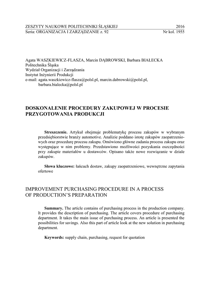 ZESZYTY NAUKOWE POLITECHNIKI ŚLĄSKIEJ Seria: ORGANIZACJA I ZARZĄDZANIE z. 92 2016 Nr kol. 1955 Agata WASZKIEWICZ-FLASZA, Marcin DĄBROWSKI, Barbara BIAŁECKA Politechnika Śląska Wydział Organizacji i Zarządzania Instytut Inżynierii Produkcji e-mail: [email protected], [email protected], [email protected] DOSKONALENIE PROCEDURY ZAKUPOWEJ W PROCESIE PRZYGOTOWANIA PRODUKCJI Streszczenie. Artykuł obejmuje problematykę procesu zakupów w wybranym przedsiębiorstwie branży automotive. Analizie poddano istotę zakupów zaopatrzeniowych oraz procedurę procesu zakupu. Omówiono główne zadania procesu zakupu oraz występujące w nim problemy. Przedstawiono możliwości pozyskania oszczędności przy zakupie materiałów u dostawców. Opisano także nowe rozwiązanie w dziale zakupów. Słowa kluczowe: łańcuch dostaw, zakupy zaopatrzeniowe, wewnętrzne zapytania ofertowe IMPROVEMENT PURCHASING PROCEDURE IN A PROCESS OF PRODUCTION’S PREPARATION Summary. The article contains of purchasing process in the production company. It provides the description of purchasing. The article covers procedure of purchasing department. It takes the main issue of purchasing process. An article is presented the possibilities for savings. Also this part of article look at the new solution in purchasing department. Keywords: supply chain, purchasing, request for quotation 384 A. Waszkiewicz-Flasza, M. Dąbrowski, B. Białecka 1. Wprowadzenie W przedsiębiorstwach produkcyjnych zarządzanie procesem zakupowym nabiera coraz większego znaczenia. Racjonalizacja procesu zakupu prowadzi bowiem do bardziej efektywnego funkcjonowania przedsiębiorstw1, co korzystnie oddziałuje nie tylko na finansowanie bieżącej działalności przedsiębiorstwa, ale i na jego rozwój i postęp2. Potrzeba wdrażania nowych, efektywnych systemów zakupu wynika przede wszystkim z wymagań stawianych przedsiębiorstwu przez współczesne otoczenie. Skracanie czasu zakupu, innowacyjność systemu zamawiania oraz konkurencyjność kosztowa to czynniki, które uzasadniają uproszczanie czasochłonnych czynności zakupowych. Organizacje, które chcą skutecznie konkurować na rynku, zmuszone są do ciągłego rozwoju. Jednym z jego kierunków jest wyeliminowanie tradycyjnych, nieefektywnych procedur zakupu3. Aby to osiągnąć, należy pomijać niepotrzebne etapy procesu zakupowego, dążyć do skrócenia czasu oczekiwania na materiały oraz eliminować wszelkie czynności, które nie dodają wartości w danym procesie4. W niniejszym artykule przedstawiono badania dotyczące procedury zakupowej w wybranym przedsiębiorstwie produkcyjnym branży automotive. Wynikiem badań jest propozycja uproszczenia procedury zakupowej. 2. Zakupy zaopatrzeniowe w łańcuchu dostaw Skuteczne zaopatrzenie w towary i usługi przyczynia się do przewagi konkurencyjnej danej organizacji. Proces zaopatrzenia łączy uczestników łańcucha dostaw i zapewnia pożądaną jakość tworzoną przez dostawców w tym łańcuchu. Jakość materiałów i usług „wchodzących” do systemu wpływa na jakość „wychodzących” z niego wyrobów gotowych, a zatem na zadowolenie klienta i dochód firmy. Koszty na wejściu do systemu stanowią dużą część kosztów całkowitych. Zważywszy na znaczenie zakupów zaopatrzeniowych w kształtowaniu się przychodów, kosztów i relacji między uczestnikami łańcucha dostaw, staje się zrozumiałe, Szczepankiewicz W.: Organizacja źródeł zaopatrzenia i rola handlu detalicznego w kanałach rynku, [w:] Szumilak J. (red.): Handel detaliczny. Funkcjonowanie i kierunki rozwoju. Oficyna Ekonomiczna, Kraków 2004, s. 142. 2 Skowronek Cz.: Wpływ procesów zaopatrzenia i gospodarowania materiałami na wyniki ekonomiczne przedsiębiorstwa. „Gospodarka Materiałowa i Logistyka”, nr 1, 1997, s. 5. 3 Lysons K.: Zakupy zaopatrzeniowe. PWE, Warszawa 2004, s. 45. 4 Croom S.: Press Release. Electronic Purchasing, 1998. 1 Doskonalenie procedury zakupowej… 385 dlaczego te aspekty przykuwają coraz większą uwagę zarówno praktyków, jak i środowisk naukowych5. Zamówienia wewnętrzne, które zaczynają się w momencie przyjęcia zamówienia przez przedsiębiorstwo, są członem łączącym wewnątrzorganizacyjne systemy logistyczne 6. Sprawne zarządzanie procesem realizacji zamówienia zobowiązuje do zrozumienia całego procesu zakupowego. Wymaga to określenia czasu trwania poszczególnych czynności oraz analizy działań, które tworzą wartość dla klienta wewnętrznego oraz tych, które tej wartości nie tworzą7. Skrócenie czasu nawiązuje do zagadnień związanych z koncepcją wartości dodanej. Wynika to z faktu, że minimalizacja czasu trwania czynności jest ściśle powiązana z analizą procesów realizowanych w przedsiębiorstwie oraz oceną ich przydatności z punktu widzenia efektywności firmy8. Ciągłe doskonalenie kluczowych procesów logistycznych zmierza do poprawy niezawodności, elastyczności i skrócenia czasu realizacji zamówienia klienta wewnętrznego. Występująca tendencja do poprawy niezawodności realizacji zamówienia klientów wymusza na przedsiębiorstwach podejmowanie ścisłej kooperacji z dostawcami. Jednocześnie indywidualizacja podejścia oraz dostosowywanie do specyficznych wymagań klientów wewnętrznych wymagają wzmożonej elastyczności systemu logistycznego 9. 3. Istota zakupów zaopatrzeniowych i ich znaczenie w organizacji Efektywne zakupy zaopatrzeniowe przyczyniają się do przewagi konkurencyjnej danej organizacji. Aby zrozumieć ten złożony proces, najpierw należy go zdefiniować. W węższym znaczeniu zakupy zaopatrzeniowe to akt zakupu towarów i usług dla firmy, a w szerszym znaczeniu to proces pozyskiwania dóbr i usług dla firmy10. Proces ten jest cyklem czynności, które bardzo często przekraczają granice organizacji i wychodzą poza nią. Zakupy zaopatrzeniowe definiowane są jako pozyskiwanie odpowiednich materiałów, wyposażenia, komponentów, cz