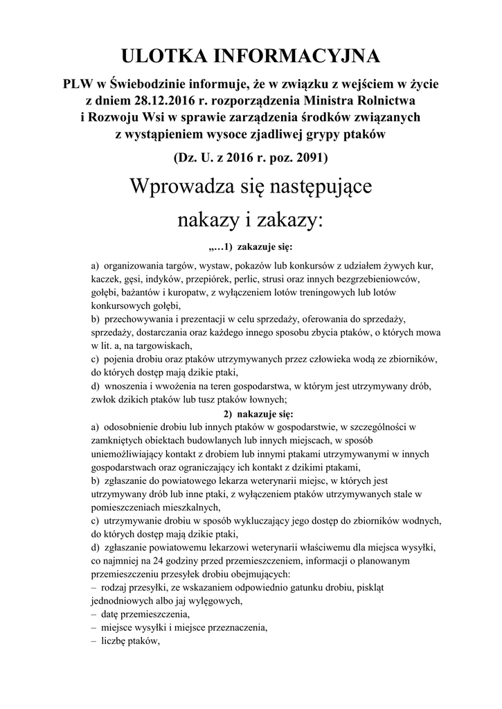 ULOTKA INFORMACYJNA PLW w Świebodzinie informuje, że w związku z wejściem w życie z dniem 28.12.2016 r. rozporządzenia Ministra Rolnictwa i Rozwoju Wsi w sprawie zarządzenia środków związanych z wystąpieniem wysoce zjadliwej grypy ptaków (Dz. U. z 2016 r. poz. 2091) Wprowadza się następujące nakazy i zakazy: ,,…1) zakazuje się: a) organizowania targów, wystaw, pokazów lub konkursów z udziałem żywych kur, kaczek, gęsi, indyków, przepiórek, perlic, strusi oraz innych bezgrzebieniowców, gołębi, bażantów i kuropatw, z wyłączeniem lotów treningowych lub lotów konkursowych gołębi, b) przechowywania i prezentacji w celu sprzedaży, oferowania do sprzedaży, sprzedaży, dostarczania oraz każdego innego sposobu zbycia ptaków, o których mowa w lit. a, na targowiskach, c) pojenia drobiu oraz ptaków utrzymywanych przez człowieka wodą ze zbiorników, do których dostęp mają dzikie ptaki, d) wnoszenia i wwożenia na teren gospodarstwa, w którym jest utrzymywany drób, zwłok dzikich ptaków lub tusz ptaków łownych; 2) nakazuje się: a) odosobnienie drobiu lub innych ptaków w gospodarstwie, w szczególności w zamkniętych obiektach budowlanych lub innych miejscach, w sposób uniemożliwiający kontakt z drobiem lub innymi ptakami utrzymywanymi w innych gospodarstwach oraz ograniczający ich kontakt z dzikimi ptakami, b) zgłaszanie do powiatowego lekarza weterynarii miejsc, w których jest utrzymywany drób lub inne ptaki, z wyłączeniem ptaków utrzymywanych stale w pomieszczeniach mieszkalnych, c) utrzymywanie drobiu w sposób wykluczający jego dostęp do zbiorników wodnych, do których dostęp mają dzikie ptaki, d) zgłaszanie powiatowemu lekarzowi weterynarii właściwemu dla miejsca wysyłki, co najmniej na 24 godziny przed przemieszczeniem, informacji o planowanym przemieszczeniu przesyłek drobiu obejmujących: – rodzaj przesyłki, ze wskazaniem odpowiednio gatunku drobiu, piskląt jednodniowych albo jaj wylęgowych, – datę przemieszczenia, – miejsce wysyłki i miejsce przeznaczenia, – liczbę ptaków, e) przechowywanie paszy dla ptaków w sposób zabezpieczający przed kontaktem z dzikimi ptakami oraz ich odchodami, f) karmienie i pojenie drobiu oraz ptaków utrzymywanych w niewoli w sposób zabezpieczający paszę i wodę przed dostępem dzikich ptaków oraz ich odchodami, g) wyłożenie mat dezynfekcyjnych przed wejściami i wyjściami z budynków inwentarskich, w których jest utrzymywany drób, a w przypadku braku niecek dezynfekcyjnych - przed wjazdami i wyjazdami z gospodarstwa, w którym jest utrzymywany drób, oraz stałe utrzymywanie wyłożonych mat lub niecek dezynfekcyjnych w stanie zapewniającym skuteczne działanie środka dezynfekcyjnego, h) stosowanie przez osoby wchodzące do budynków inwentarskich, w których jest utrzymywany drób, odzieży ochronnej oraz obuwia ochronnego, przeznaczonych do użytku wyłącznie w danym budynku, i) stosowanie przez osoby wykonujące czynności związane z obsługą drobiu zasad higieny osobistej, w tym mycie rąk przed wejściem do budynków inwentarskich, j) oczyszczanie i odkażanie sprzętu i narzędzi używanych do obsługi drobiu przed każdym ich użyciem, k) powstrzymanie się przez osoby, które w ciągu ostatnich 72 godzin uczestniczyły w polowaniu na ptaki łowne, od wykonywania czynności związanych z obsługą drobiu, l) dokonywanie codziennego przeglądu stad drobiu wraz z prowadzeniem dokumentacji zawierającej w szczególności informacje na temat liczby padłych ptaków, spadku pobierania paszy lub nieśności. 2. Posiadacz drobiu zawiadamia organ Inspekcji Weterynaryjnej albo najbliższy podmiot świadczący usługi z zakresu medycyny weterynaryjnej o wystąpieniu u drobiu następujących objawów klinicznych: 1) zwiększonej śmiertelności; 2) znaczącego spadku pobierania paszy i wody; 3) objawów nerwowych takich jak: drgawki, skręty szyi, paraliż nóg i skrzydeł, niezborność ruchów; 4) duszności; 5) sinicy i wybroczyn; 6) biegunki; 7) nagłego spadku nieśności. 3. Dzierżawcy lub zarządcy obwodów łowieckich zgłaszają organowi Inspekcji Weterynaryjnej albo najbliższemu podmiotowi świadczącemu usługi z zakresu medycyny weterynaryjnej przypadki zwiększonej śmiertelności dzikich ptaków….” W celu zapoznania się z całą treścią w/w rozporządzenia odsyłamy do (Dz. U. z 2016 r. poz. 2091)