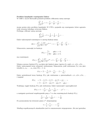 Problem bazylejski: rozwiązanie Eulera W 1689 r. Jacob Bernoulli postawił problem obliczenia sumy szeregu ∞ X 1 1 1 1 = 1 + 2 + 2 + 2 + ··· , n2 2 3 4 n=0 znany potem jako problem bazylejski. W 1735 r. pojawiło się rozwiązanie, które ugruntowało renomę młodego wówczas Eulera. Próbując obliczyć sumę szeregu ∞ X 1 1 1 1 = 1 + 2 + 2 + 2 + ··· 2 n 2 3 4 n=0 Euler wykorzystał rozwinięcie w szereg funkcji sinus: sin x = ∞ X (−1)n x5 x7 x3 x 2n+1 = x − + − + ··· (2n + 1)! 3! 5! 7! n=0 Mianowicie, zauważył, że funkcja P(x) = ( 1 sin x x gdy x = 0, gdy x = 6 0, ma rozwinięcie ∞ X (−1)n x2 x4 x6 P(x) = x 2n = 1 − + − + ··· (2n + 1)! 3! 5! 7! n=0 Miejsca zerowe funkcji P(x) są takie jak funkcji sinus (oprócz 0), czyli ±π, ±2π, ±3π, . . . Euler wykorzystał teraz własność wielomianu. Mianowicie, jeśli wielomian f(x) ma pierwiastki a1 , a2 , . . . , an oraz f(0) = 1, to x x x f(x) = 1 − 1− ··· 1 − a1 a2 an Euler potraktował teraz funkcję P(x) jak wielomian o pierwiastkach ±π, ±2π, ±3π, . . . i napisał x x P(x) = 1 − πx 1 + πx 1 − 2π 1 + 2π ··· = 2 2 2 x x x2 = 1 − πx 2 1 − 4π 1 − 9π 1 − 16π ··· 2 2 2 Traktując ciągle funkcję P(x) jak wielomian, Euler wymnożył i uporządkował: P(x) = 1 − 1 1 1 + + + · · · x2 + · · · , 2 2 2 π 4π 9π a następnie porównał współczynniki przy x 2 w obu rozwinięciach funkcji P(x): 1 1 1 1 + + + ··· = . 2 2 2 π 4π 9π 3! Po pomnożeniu tej równości przez π 2 otrzymujemy 1+ 1 1 π2 + + ··· = . 4 9 6 Według współczesnych standardów jest to rozumowanie niepoprawne. Ale jest genialne.