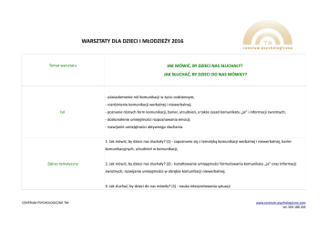 WARSZTATY DLA DZIECI I MŁODZIEŻY 2016 Temat warsztatu JAK MÓWIĆ, BY DZIECI NAS SŁUCHAŁY? JAK SŁUCHAĆ, BY DZIECI DO NAS MÓWIŁY? - uświadomienie roli komunikacji w życiu codziennym; - rozróżnienie komunikacji werbalnej i niewerbalnej; Cel - poznanie różnych form komunikacji, barier, utrudnień, a także zasad komunikatu „ja” i informacji zwrotnych; - doskonalenie umiejętności rozpoznawania emocji; - rozwijanie umiejętności aktywnego słuchania. 1. Jak mówić, by dzieci nas słuchały? (1) - zapoznanie się z tematyką komunikacji werbalnej i niewerbalnej, barier komunikacyjnych, utrudnień w komunikacji; Zakres tematyczny 2. Jak mówić, by dzieci nas słuchały? (2) - kształtowanie umiejętności formułowania komunikatu „ja” oraz informacji zwrotnych, rozwijanie umiejętności w obrębie komunikacji niewerbalnej; 3. Jak słuchać, by dzieci do nas mówiły? (1) - nauka interpretowania sytuacji CENTRUM PSYCHOLOGICZNE TM www.centrum-psychologiczne.com tel. 504 188 263 w kategoriach uczuć i motywów, rozwinięcie umiejętności rozumienia i akceptowania uczuć, poznanie zasad aktywnego słuchania; 4. Jak słuchać, by dzieci do nas mówiły? (2) - kształtowanie umiejętności formułowania komunikatów nazywających i odzwierciedlających emocje dziecka, poznanie sposobów radzenia sobie z trudnymi emocjami u dziecka. Dla kogo? Grupy wiekowe Ilość osób w grupie Ilość spotkań warsztatowych Czas trwania 1 spotkania Osoba prowadząca CENTRUM PSYCHOLOGICZNE TM Warsztat kierowany jest do rodziców - grupy stworzone będą z osób posiadających dzieci w podobnym wieku. dorośli 4 – 6 osób 4 spotkania ( 8 godzin warsztatowych) 120 min. mgr Aleksandra Miętek www.centrum-psychologiczne.com tel. 504 188 263 1. Kontakt pod nr tel. 504 188 263 do rejestracji naszego Centrum Jak dostać się na warsztat? 2. Pani Magda w rejestracji udzieli niezbędnych informacji 3. Zostanie do Państwa przesłana krótka ankieta do wypełnienia dotyczącą funkcjonowania dziecka 4. Koszt za moduł warsztatu (4 grupowe spotkania – 8 godz. z psychologiem) – 335 zł CENTRUM PSYCHOLOGICZNE TM www.centrum-psychologiczne.com tel. 504 188 263