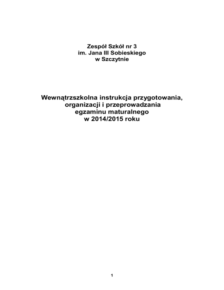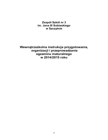 Zespół Szkół nr 3 im. Jana III Sobieskiego w Szczytnie Wewnątrzszkolna instrukcja przygotowania, organizacji i przeprowadzania egzaminu maturalnego w 2014/2015 roku 1 Spis treści: I. Postępowanie z niejawnymi materiałami egzaminacyjnymi............................... …..3 II. Harmonogram realizacji zadań ……………………………………………………………….…….5 III. Zasady obiegu informacji ………………………………………………………...……………...6 IV. Przygotowanie i organizacja egzaminu w części ustnej .................................. …..8 V. Przygotowanie i organizacja egzaminu w części pisemnej .............................. …10 VI. Komunikowanie wyników ………………………………………………...…………...13 W instrukcji zastosowano następujące skróty : SZE – Szkolny Zespół Egzaminacyjny PZE – Przedmiotowy Zespół Egzaminacyjny ZN – Zespół Nadzorujący OKE – Okręgowa Komisja Egzaminacyjna CKE – Centralna Komisja Egzaminacyjna 2 I. Postępowanie z niejawnymi materiałami egzaminacyjnymi. 1. Niejawnymi materiałami egzaminacyjnymi są zbiory zestawów zadań do części ustnej egzaminu maturalnego oraz przesyłki zawierające pakiety z arkuszami egzaminacyjnymi i innymi materiałami egzaminacyjnymi do części pisemnej egzaminu maturalnego. 2. Przewodniczący SZE szkoli i przygotowuje do przeprowadzenia egzaminu nauczycieli swojej szkoły, w tym nauczycieli oddelegowanych do innych szkół. Zakres szkolenia obejmuje organizację i przebieg egzaminu maturalnego, zapoznanie z wewnątrzszkolną instrukcją maturalną, postępowanie z niejawnymi materiałami egzaminacyjnymi. 3. Przewodniczący SZE odbiera od członków SZE i innych osób biorących udział w egzaminie maturalnym pisemne oświadczenia o przestrzeganiu ustaleń w sprawie zabezpieczenia materiałów egzaminacyjnych przed nieuprawnionym ujawnieniem. 4. Zestawy zadań i kryteria oceniania na część ustną egzaminu z języka polskiego oraz języka obcego nowożytnego są udostępniane członkom właściwych PZE. 5. Przewodniczący SZE lub osoba przez niego upoważniona odbiera i wspólnie z wyznaczonym przez siebie członkiem SZE sprawdza nienaruszenie przesyłek zawierających pakiety z materiałami egzaminacyjnymi. Niejawne materiały egzaminacyjne przechowywane są do dnia przeprowadzenia odpowiedniej części egzaminu w sejfie szkolnym znajdującym się w gabinecie dyrektora. 6. Klucze do sejfu, w którym przechowywane są niejawne materiały egzaminacyjne, posiada w okresie ich przechowywania przewodniczący SZE lub jego zastępca. 7. Przewodniczący wraz z zastępcą SZE sprawdza w każdym dniu egzaminu, przed jego rozpoczęciem, czy pakiety zawierające arkusze i materiały egzaminacyjne są nienaruszone, a w przypadku ich naruszenia niezwłocznie zawiadamia dyrektora OKE. 8. W dniu egzaminu przewodniczący PZE lub ZN w obecności przedstawiciela zdających w danej sali odbiera od przewodniczącego SZE pakiet materiałów egzaminacyjnych i niezwłocznie przenosi go do sali egzaminacyjnej. 9. Do czasu rozdania arkuszy zdającym nikt nie może mieć wglądu do ich treści. 10. Członkowie ZN wymieniają w razie potrzeby zestawy egzaminacyjne na kompletne. Czynność ta jest protokołowana i potwierdzana podpisem przez zdającego, któremu wymieniono arkusze egzaminacyjne. 11. Po zakończeniu egzaminu członkowie ZN zbierają arkusze egzaminacyjne od zdających. Odebrane od zdających zestawy gromadzone są przez 3 przewodniczącego ZN w jednym miejscu sali tak, aby nikt z obecnych na sali nie miał do nich wglądu. 12. Przewodniczący ZN porządkuje, kompletuje, pakuje i zabezpiecza materiały egzaminacyjne, listy zdających, protokoły odbioru prac, zestawy (także nagrane płyty CD-ROM oznaczone numerem PESEL zdającego w przypadku egzaminu z informatyki) według zaleceń OKE oraz niezwłocznie dostarcza je wraz z wypełnionymi i podpisanymi protokołami z egzaminu przewodniczącemu SZE po zakończeniu każdej części egzaminu. 13. Przewodniczący SZE po zakończeniu egzaminu przechowuje materiały egzaminacyjne do czasu przekazania ich do punktu odbioru w sejfie szkolnym. 14. Pozostała w szkole dokumentacja dotycząca przygotowania i przebiegu egzaminu zabezpieczana jest przez dyrektora szkoły przed nieuprawnionym ujawnieniem. 15. W razie wystąpienia sytuacji szczególnej, nieuwzględnionej w przepisach prawa, przewodniczący PZE lub ZN niezwłocznie przekazuje niezbędne informacje przewodniczącemu SZE i postępuje zgodnie z podjętymi przez niego decyzjami. 16. Jeżeli przewodniczący SZE, z powodu choroby lub innych ważnych przyczyn, nie może pełnić swoich obowiązków, wszystkie jego zadania przejmuje zastępca przewodniczącego SZE. 4 II. Harmonogram realizacji zadań. do 30.09.2014: złożenie wstępnych deklaracji przystąpienia do egzaminu maturalnego oraz dokumentów uprawniających do dostosowania warunków i formy egzaminu do indywidualnych potrzeb psychofizycznych edukacyjnych ucznia, do 07.02.2015: złożenie ostatecznych deklaracji przystąpienia do egzaminu maturalnego oraz dokumentów uprawniających do dostosowania warunków i formy egzaminu do indywidualnych potrzeb psychofizycznych i edukacyjnych ucznia, do 04.03.2015: powołanie zespołów przedmiotowych do przeprowadzenia części ustnej egzaminu, do 04.03.2015: ogłoszenie szkolnego harmonogramu egzaminów ustnych, do 04.04.2015: powołanie zespołów nadzorujących przebieg części pisemnej egzaminu, od 04.05.2015 do 22.05.2015: przeprowadzenie egzaminów pisemnych, od 04.05.2015 do 29.05.2015: przeprowadzenie egzaminów ustnych z języków obcych nowożytnych, od 11.05.2015 do 23.05.2015: przeprowadzenie egzaminów ustnych z języka polskiego, od 01.06.2015 do 17.06.2015: egzamin maturalny w terminie dodatkowym, 30.06.2015: przekazanie świadectw dojrzałości i aneksów do szkół, do 07.07.2015: odbiór pisemnych oświadcze