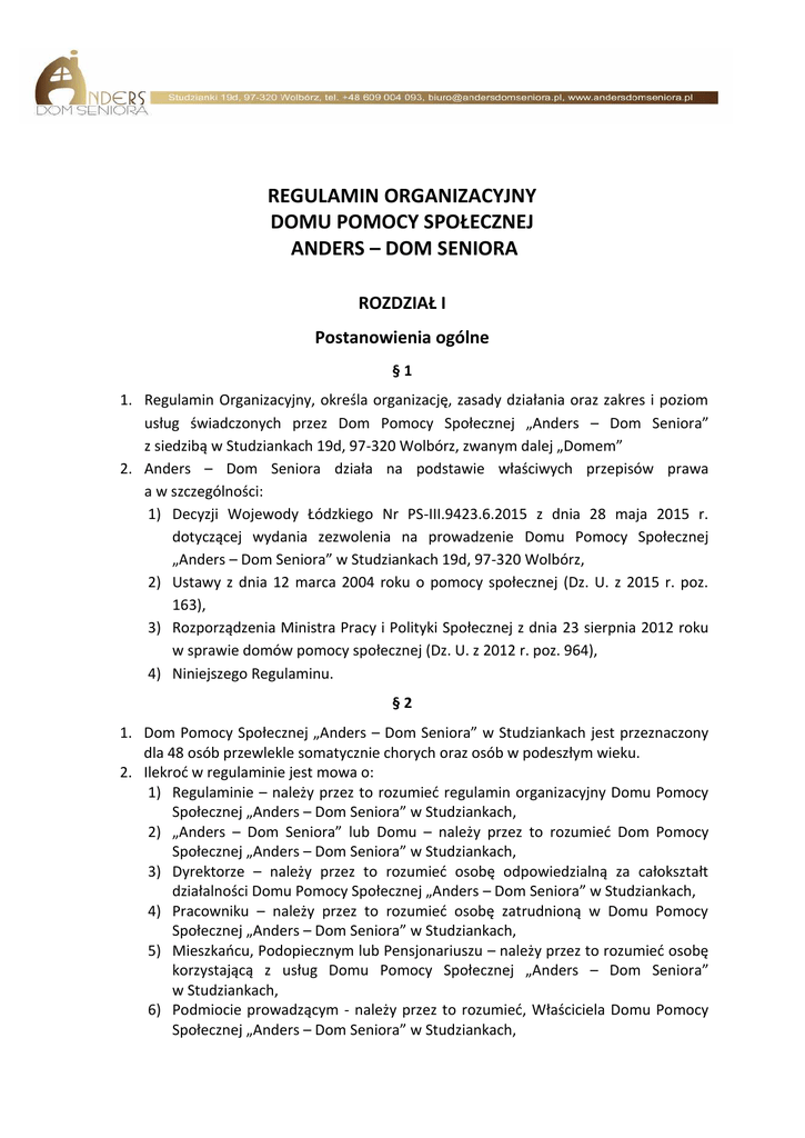 REGULAMIN ORGANIZACYJNY DOMU POMOCY SPOŁECZNEJ ANDERS – DOM SENIORA ROZDZIAŁ I Postanowienia ogólne §1 1. Regulamin Organizacyjny, określa organizację, zasady działania oraz zakres i poziom usług świadczonych przez Dom Pomocy Społecznej „Anders – Dom Seniora” z siedzibą w Studziankach 19d, 97-320 Wolbórz, zwanym dalej „Domem” 2. Anders – Dom Seniora działa na podstawie właściwych przepisów prawa a w szczególności: 1) Decyzji Wojewody Łódzkiego Nr PS-III.9423.6.2015 z dnia 28 maja 2015 r. dotyczącej wydania zezwolenia na prowadzenie Domu Pomocy Społecznej „Anders – Dom Seniora” w Studziankach 19d, 97-320 Wolbórz, 2) Ustawy z dnia 12 marca 2004 roku o pomocy społecznej (Dz. U. z 2015 r. poz. 163), 3) Rozporządzenia Ministra Pracy i Polityki Społecznej z dnia 23 sierpnia 2012 roku w sprawie domów pomocy społecznej (Dz. U. z 2012 r. poz. 964), 4) Niniejszego Regulaminu. §2 1. Dom Pomocy Społecznej „Anders – Dom Seniora” w Studziankach jest przeznaczony dla 48 osób przewlekle somatycznie chorych oraz osób w podeszłym wieku. 2. Ilekroć w regulaminie jest mowa o: 1) Regulaminie – należy przez to rozumieć regulamin organizacyjny Domu Pomocy Społecznej „Anders – Dom Seniora” w Studziankach, 2) „Anders – Dom Seniora” lub Domu – należy przez to rozumieć Dom Pomocy Społecznej „Anders – Dom Seniora” w Studziankach, 3) Dyrektorze – należy przez to rozumieć osobę odpowiedzialną za całokształt działalności Domu Pomocy Społecznej „Anders – Dom Seniora” w Studziankach, 4) Pracowniku – należy przez to rozumieć osobę zatrudnioną w Domu Pomocy Społecznej „Anders – Dom Seniora” w Studziankach, 5) Mieszkańcu, Podopiecznym lub Pensjonariuszu – należy przez to rozumieć osobę korzystającą z usług Domu Pomocy Społecznej „Anders – Dom Seniora” w Studziankach, 6) Podmiocie prowadzącym - należy przez to rozumieć, Właściciela Domu Pomocy Społecznej „Anders – Dom Seniora” w Studziankach, 7) Właścicielu – należy przez to rozumieć osobę reprezentującą DS. Anders sp. z o. o – p. Kamil Mazurek §3 1. Dom Pomocy Społecznej „Anders – Dom Seniora” jest samodzielną jednostką organizacyjną, podległą bezpośrednio Firmie DS. Anders Sp. z o.o. z siedzibą Studzianki 19 D, 97 – 320 Wolbórz 2. Dom Pomocy Społecznej „Anders – Dom Seniora” jest jednostką prywatną, stacjonarną, stałego i okresowego pobytu zapewniającą całodobową opiekę osobom przewlekle somatycznie chorym i osobom w podeszłym wieku. 3. Dom świadczy usługi bytowe, opiekuńcze i wspomagające mieszkańcom Domu, w tym szeroko rozumianą rehabilitację. §4 1. Siedzibą Domu Pomocy Społecznej „Anders – Dom Seniora” jest nieruchomość położona w miejscowości STUDZIANKI nr 19D, kod 97-320, poczta WOLBÓRZ. 2. Dom używa nazwy: Anders – Dom Seniora. §5 1. Podmiotem prowadzącym Anders – Dom Seniora jest Właściciel. 2. Do zadań Właściciela Domu należy: 1) zapewnienie bazy lokalowej Domu i utrzymanie jego stanu technicznego na poziomie zapewniającym spełnienie standardu określonego w ustawie o pomocy społecznej, 2) prowadzenie gospodarki finansowej Domu, 3) wynagradzanie pracowników zgodnie z obowiązującymi przepisami prawa, 4) przestrzeganie przepisów BHP. 3. Domem kieruje Dyrektor zatrudniony przez Właściciela Anders – Dom Seniora. 4. Dyrektor odpowiada za prawidłowe funkcjonowanie Anders – Dom Seniora i reprezentuje Dom na zewnątrz. 5. W działalności Domu obowiązują zasady praworządności, sprawiedliwości, gospodarności, służebności wobec swoich klientów i współdziałania ze społeczeństwem. 6. Dyrektor kierując Domem, w szczególności: 1) określa organizację wewnętrzną oraz tryb pracy Domu, 2) dokonuje podziału zadań pracownikom Domu i kieruje ich pracą, 3) określa zasady polityki kadrowej, dba o należyty dobór pracowników i podnoszenie ich kwalifikacji, 4) rozstrzyga sprawy sporne miedzy pracownikami, 5) awansuje, nagradza, wyróżnia, ewentualnie udziela kar pracownikom Domu, 6) zapewnia skuteczny nadzór nad pracą podległych pracowników, 7) nadzoruje przestrzeganie przez pracowników Domu dyscypliny pracy i właściwego stosunku do mieszkańców Domu, 8) nadzoruje prawidłowość oceny sytuacji pensjonariusza, 9) prowadzi nadzór nad jakością i prawidłowością świadczonych usług, 10) sprawuje bieżącą kontrolę i nadzór nad opracowywaniem i realizacją indywidualnych planów wspierania mieszkańca, 11) prowadzi nadzór nad warunkami życia mieszkańców. 9. Dyrektor zapewnia system kontroli zarządczej, który obejmuje: 1) zgodność działalności z przepisami prawa, 2) skuteczne i efektywne działania, 3) przestrzeganie i promowanie zasad etycznego zachowania, 4) efektywność i skuteczność przepływu informacji. ROZDZIAŁ II Szczegółowy zakres zadań Domu §6 1. Dom zaspakaja swoim mieszkańcom potrzeby bytowe, opiekuńcze i wspomagające zgodnie z obowiązującymi w tym zakresie standardami, poprzez świadczenie usług: 1) bytowych, zapewniając: a) miejsce zamieszkania; b) wyposażenie w niezbędne, meble i sprzęt, pościel i bieliznę pościelową; c) wyżywienie w tym dietetyczne zgodnie ze wskazaniami lekarskimi, w ramach obowiązujących norm żywieniowych; d) odzież i obuwie; e) utrzymanie czystości w Domu, 2) opiekuńczych, polegających na: a) udzielaniu pomocy w podstawowych czynnościach życiowych, b) pielęgnacji w tym pielęgnacji podczas choroby; c) niezbędnej pomocy w załatwianiu spraw osobistych, 3) wspomagających, polegających na: a) umożliwieniu udziału w terapii zajęciowej; b) podnoszeniu sprawności i aktywizowaniu mieszkańców Domu; c) umożliwieniu zaspokojenia potrzeb religijnych i kulturalnych; d) zapewnieniu warunków do rozwoju samorządności mieszkańców Domu; e) stymulowaniu nawiązywania, utrzymywania i rozwijania kontaktu z rodziną i społecznością lokal