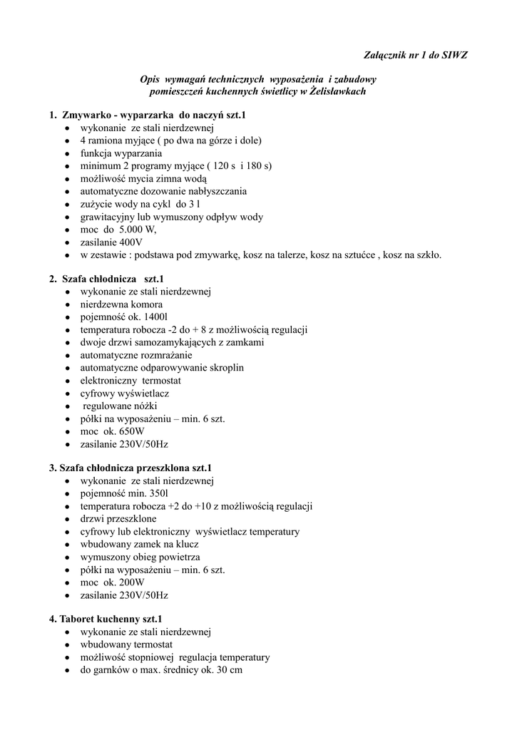 Załącznik nr 1 do SIWZ Opis wymagań technicznych wyposażenia i zabudowy pomieszczeń kuchennych świetlicy w Żelisławkach 1. Zmywarko - wyparzarka do naczyń szt.1 wykonanie ze stali nierdzewnej 4 ramiona myjące ( po dwa na górze i dole) funkcja wyparzania minimum 2 programy myjące ( 120 s i 180 s) możliwość mycia zimna wodą automatyczne dozowanie nabłyszczania zużycie wody na cykl do 3 l grawitacyjny lub wymuszony odpływ wody moc do 5.000 W, zasilanie 400V w zestawie : podstawa pod zmywarkę, kosz na talerze, kosz na sztućce , kosz na szkło. 2. Szafa chłodnicza szt.1 wykonanie ze stali nierdzewnej nierdzewna komora pojemność ok. 1400l temperatura robocza -2 do + 8 z możliwością regulacji dwoje drzwi samozamykających z zamkami automatyczne rozmrażanie automatyczne odparowywanie skroplin elektroniczny termostat cyfrowy wyświetlacz regulowane nóżki półki na wyposażeniu – min. 6 szt. moc ok. 650W zasilanie 230V/50Hz 3. Szafa chłodnicza przeszklona szt.1 wykonanie ze stali nierdzewnej pojemność min. 350l temperatura robocza +2 do +10 z możliwością regulacji drzwi przeszklone cyfrowy lub elektroniczny wyświetlacz temperatury wbudowany zamek na klucz wymuszony obieg powietrza półki na wyposażeniu – min. 6 szt. moc ok. 200W zasilanie 230V/50Hz 4. Taboret kuchenny szt.1 wykonanie ze stali nierdzewnej wbudowany termostat możliwość stopniowej regulacja temperatury do garnków o max. średnicy ok. 30 cm moc max. 3.500 W zasilanie 230V/50Hz 5. Kuchenka elektryczna szt.1 wykonanie ze stali nierdzewnej 4 płyty grzewcze o mocy po 2.000W piec elektryczny konwekcyjny o mocy 2.500W moc max. 10.500W zasilanie 400W 6. Patelnia przechylna elektryczna szt.1 wykonanie ze stali nierdzewnej przeznaczona do smażenia produktów spożywczych na tłuszczu misa wykonana ze stali nierdzewnej płynna regulacja temperatury kontrolka pracy pojemność misy ręczny lub automatyczny przechył misy mac max. do 6.000 W zasilanie 400V 7. Baseny, zlewozmywaki, baterie wykonanie ze stali nierdzewnej kwasoodpornej gr. 1,0 mm tylny „rant” zabezpieczający baseny o głębokości 45 cm stopki regulujące w zakresie +/- 15 mm baseny – 2 sztuki o wymiarach 1000/600mm i 800/600 mm zlewozmywaki dwukomorowe - 2 sztuki o wymiarach 1000/ 600 mm baterie prysznicowe sztorcowe – 4 sztuki typ baterii dostosowany do istniejącej instalacji wewnętrznej. 8. Okap szt.1 wyciąg mechaniczny wykonanie ze stali nierdzewnej kwasoodpornej wyposażony w łapacze tłuszczu wentylator o mocy max. do 500W wydajność min. 1.100m3/h średnica króćca wyciągowego dostosowana do istniejącej instalacji zasilanie 230V/50Hz 9. Regały magazynowe a) wykonane ze stali nierdzewnej kwasoodpornej w wersji spawanej regały posiadają po 4 półki pełne 3 sztuki o wym. ok. 1300/500/1800 2 sztuki o wym. ok. 1100/400/1800 b) wykonane ze stali nierdzewnej kwasoodpornej w wersji modułowej 3 sztuki o wym. ok. 1300/500/1800 z modułem narożnym umożliwiającym ustawienie w kształcie litery L posiadające po 4 półki perforowane, 1 sztuka o wysokości ok 1500 mm, głębokości ok. 400 – 500 mm posiadająca kółka z hamulcem, 2 półki o rozstawie umożliwiającym umieszczenie pojemników gastronomicznych, oraz 1 specjalna półka na butelki, 10. Zabudowa kuchenna zestaw składający się z ok. 8 elementów – stołów roboczych, blaty wykonane ze stali nierdzewnej kwasoodpornej grubości 1,0 mm wygłuszone płytą gładką laminowaną o grubości min. 18 mm przyklejoną od spodu do blachy klejem który posiada atest PZH do stosowania w przemyśle spożywczym, od strony ściennej stoły wyposażone w „rant” uniemożliwiający zsuwanie się odpadów, stoły wyposażone w stopki umożliwiające wypoziomowanie w zakresie +/- 15 mm, nogi stołów - rura kwadratowa o wym 40/40mm, łączna długość stołów roboczych ok. 1.000 cm w tym: 4 wyposażone w dodatkową półkę a dwa z nich dodatkowo wyposażone w otwory umożliwiające zrzut odpadków bezpośrednio do pojemników, Przed wykonaniem zabudowy, ustawieniem zlewozmywaków i basenów konfigurację ustawienia poszczególnych elementów należy uzgodnić z Zamawiającym Opis techniczny wyposażenia świetlicy 1. Krzesła pożądane wymiary: szerokość ok. 540 mm wysokość ok. 820 mm długość ok. 420 mm stelaż stal lakierowana proszkowo siedzisko i oparcie wyściełane materiałem obiciowym tkanina obiciowa charakteryzująca się wysoką odpornością na ścieranie konstrukcja krzesła umożliwiająca ich składowanie w „stos” wzór krzesła i kolorystyka dobrana po uzgodnieniu z Zamawiającym ilość sztuk 120 2. Stoły składane blat stołów o wymiarach 1800 mm x 800 mm wysokość stołu min. 700 mm rama i stelaż z rur stalowych lakierowanych w kolorze uzgodnionym z Zamawiającym blaty wykonane z płyty melaminowej wykończonej listwą pcv, konstrukcja umożliwiająca składanie złożonych stołów w „stos”, wzór stołu jak i kolorystyka dobrane po uzgodnieniu z Zamawiającym ilość sztuk 25 3. Wieszaki konstrukcja wykonana z rury stalowej malowanej proszkowo o minimalnym przekroju 25mm, wymiary: długość 1500mm, wysokość ok. 1600 mm, szerokość podstawy nie większa niż 500mm min. 10 szt. haków podwójnych z każdej strony, możliwość złożenia wieszaka zamówienie obejmuję dostawę 10 sztuk wieszaków dwustronnych, 4. Gabloty - Witryny a) gabloty wiszące ze sklepieniem wymiary 80/25/80 cm zamknięcie na zamek ilość sztuk 5 b) szafy wystawiennicze – gabloty stojące ze sklepieniem wymiary 86 36/190 cm wersja podwójna i 56/36/190 cm wersja pojedyncza cokół wykonany z płyty kolor cokołu dobrany po uzgodnieniu z Zamawiającym drzwi podwójne lub pojedyńcze zamknięcie na zamek ilość sztuk z drzwiami podwójnymi - 1 ilość sztuk z drzwiami pojedynczymi - 4 c) szafy wystawiennicze – gabloty stojące bez sklepienia wymiary 56/36/190 cokół wykonany z płyty zamknięcie na zamek ilość sztuk 10 Wymagania minima