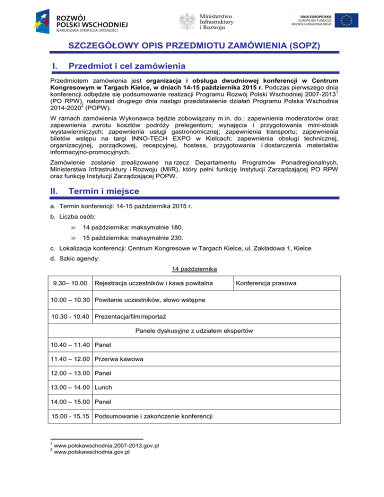 SZCZEGÓŁOWY OPIS PRZEDMIOTU ZAMÓWIENIA (SOPZ) I. Przedmiot i cel zamówienia Przedmiotem zamówienia jest organizacja i obsługa dwudniowej konferencji w Centrum Kongresowym w Targach Kielce, w dniach 14-15 października 2015 r. Podczas pierwszego dnia 1 konferencji odbędzie się podsumowanie realizacji Programu Rozwój Polski Wschodniej 2007-2013 (PO RPW), natomiast drugiego dnia nastąpi przedstawienie działań Programu Polska Wschodnia 2 2014-2020 (POPW). W ramach zamówienia Wykonawca będzie zobowiązany m.in. do.: zapewnienia moderatorów oraz zapewnienia zwrotu kosztów podróży prelegentom; wynajęcia i przygotowania mini-stoisk wystawienniczych; zapewnienia usługi gastronomicznej; zapewnienia transportu; zapewnienia biletów wstępu na targi INNO-TECH EXPO w Kielcach; zapewnienia obsługi technicznej, organizacyjnej, porządkowej, recepcyjnej, hostess, przygotowania i dostarczenia materiałów informacyjno-promocyjnych. Zamówienie zostanie zrealizowane na rzecz Departamentu Programów Ponadregionalnych, Ministerstwa Infrastruktury i Rozwoju (MIiR), który pełni funkcję Instytucji Zarządzającej PO RPW oraz funkcję Instytucji Zarządzającej POPW. II. Termin i miejsce a. Termin konferencji: 14-15 października 2015 r. b. Liczba osób: • 14 października: maksymalnie 180. • 15 października: maksymalnie 230. c. Lokalizacja konferencji: Centrum Kongresowe w Targach Kielce, ul. Zakładowa 1, Kielce d. Szkic agendy: 14 października 9.30– 10.00 Rejestracja uczestników i kawa powitalna Konferencja prasowa 10.00 – 10.30 Powitanie uczestników, słowo wstępne 10.30 - 10.40 Prezentacja/film/reportaż Panele dyskusyjne z udziałem ekspertów 10.40 – 11.40 Panel 11.40 – 12.00 Przerwa kawowa 12.00 – 13.00 Panel 13.00 – 14.00 Lunch 14.00 – 15.00 Panel 15.00 - 15.15 Podsumowanie i zakończenie konferencji 1 2 www.polskawschodnia.2007-2013.gov.pl www.polskawschodnia.gov.pl 15 października 9.30– 10.00 Rejestracja uczestników i kawa powitalna Konferencja prasowa 10.00 – 10.05 Otwarcie spotkania i przywitanie gości 10.05 – 10.20 Wystąpienie 1. 10.20 – 10.30 Prezentacja 2. lub 10.30 – 10.45 Wystąpienie 3. Panel 10.45 – 11.00 Wystąpienie 4. 11.00 – 11.30 Przerwa kawowa Panele dyskusyjne z udziałem ekspertów 11.30 – 12.15 Panel 12.15 – 12.45 Panel 12.45 – 13.30 Lunch 13.30 -14.15 Panel 14.15 – 14.30 Zakończenie konferencji III. Zakres zamówienia 1. Miejsce konferencji a. Wykonawca zorganizuje konferencję w Centrum Kongresowym Targów Kielce, zlokalizowanym przy ul. Zakładowej 1 w Kielcach. Zamawiający w dniach 14 - 15 października 2015 r. zapewnia wszystkie potrzebne sale wraz z wyposażeniem i pomieszczenia: salę konferencyjną Omega, salę na konferencję prasową, VIP room, miejsce na usługę cateringową, przestrzeń do ekspozycji mini-stoisk wystawienniczych, videowalla, telewizorów LCD oraz wystawy projektów PO RPW, przechowalnię bagażu i szatnię. Koszty zapewnienia ww. pomieszczeń nie stanowią kosztów Wykonawcy. b. Wykonawca zapewni w VIP roomie świeżo parzoną kawę, herbatę (czarną, owocową), ciasteczka, owoce, wodę mineralną, szklanki do wody. c. Wykonawca czytelnie oznaczy wszystkie miejsca, w których odbędą się wydarzenia realizowane na zlecenie Zamawiającego oraz drogi prowadzące do nich. Oznakowanie musi być gotowe każdego dnia, co najmniej godzinę przed rozpoczęciem. d. Wykonawca, podczas obu dni konferencji, zapewni obsługę techniczną, organizacyjną i porządkową wszystkich pomieszczeń, o której jest mowa w poszcz. częściach SOPZ. 2. Prelegenci a. Wykonawca w ustalonym przez strony terminie będzie zobowiązany do potwierdzenia udziału w konferencji prelegentów z Polski oraz gotowości sześciu z nich do przygotowania prezentacji wprowadzającej do tematyki panelu dyskusyjnego. Przewiduje się, że w konferencji udział weźmie około 35 prelegentów, w tym około 9 z Instytucji Zarządzającej (IZ) i Instytucji Pośredniczącej (IP) PO RPW/POPW oraz maksymalnie 26 prelegentów posiadających aktualną wiedzę i doświadczenie w tematyce konferencji, z których 6 zostanie poproszonych o przygotowanie prezentacji. Zaproszenia do potencjalnych prelegentów dotyczące udziału 2 w konferencji wystosuje Zamawiający. W przypadku, gdy Zamawiający w wyznaczonym przez strony terminie otrzyma od Wykonawcy informacje o braku możliwości wzięcia udziału przez danego prelegenta w konferencji, wystosuje zaproszenie do kolejnych prelegentów lub ograniczy liczbę prelegentów w danym panelu dyskusyjnym. b. Udział prelegentów będzie bezpłatny, z zastrzeżeniem pkt d oraz f. c. Zamawiający, po ustaleniu ostatecznej listy prelegentów mogących wziąć udział w konferencji wytypuje maksymalnie 6 prelegentów, którzy będą zobowiązani do przygotowania multimedialnej „prezentacji wprowadzającej” do tematyki panelu dyskusyjnego oraz zaprezentowania jej podczas konferencji. d. Wykonawca, w drodze umowy, zleci prelegentom, o których mowa w pkt c., przygotowanie prezentacji. Wykonawca będzie zobowiązany do wypłacenia im z budżetu projektu wynagrodzenia za przygotowanie i przedstawienie prezentacji podczas konferencji, z zastrzeżeniem, że koszt na jednego prelegenta nie przekroczy 1000 zł brutto. e. Wykonawca w umowach z prelegentami, o których mowa w pkt d, zagwarantuje przeniesienie na Zamawiającego praw autorskich do prezentacji. Wykonawca zobowiąże prelegentów do przekazania prezentacji w terminie i na adres poczty elektronicznej wskazany przez Zamawiającego. f. Dla maksymalnie 26 prelegentów Wykonawca zapewni zwrot kosztów podróży do kwoty maksymalnej 500 zł brutto/ osobę. g. Wykonawca ponosi pełną odpowiedzialność za zobowiązania oraz wszelkie kwestie formalnoprawne wobec maksymalnie 26 prelegentów biorących udział w konferencji (z wyłączeniem przedstawicieli IZ i IP PO RPW/POPW), w tym wobec maksymalnie 6 prelegentów, o których mowa w pkt c. 3. M