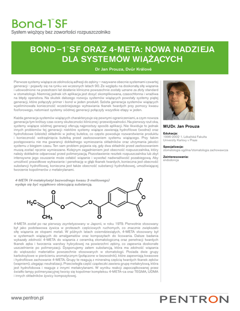 Bond-1 SF System wiążący bez zawartości rozpuszczalnika ™ BOND–1 SF ORAZ 4-META: NOWA NADZIEJA DLA SYSTEMÓW WIĄŻĄCYCH ™ Dr Jan Prouza, Dvůr Králové Pierwsze systemy wiążące ze zdolnością adhezji do zębiny – nazywane obecnie systemami czwartej generacji - pojawiły się na rynku we wczesnych latach 90. Ze względu na doskonałą siłę wiązania i udowodnione na przestrzeni lat działanie kliniczne powszechnie zostały uznane za złoty standard w stomatologii. Niemniej jednak ich aplikacja jest dosyć skomplikowana, czasochłonna i wrażliwa na błędy operatora. Na skutek dalszego rozwoju systemów wiążących powstały systemy piątej generacji, które połączyły primer i bond w jeden produkt. Szósta generacja systemów wiążących wyeliminowała konieczność wcześniejszego wytrawiania tkanek twardych przy pomocy kwasu fosforowego, natomiast systemy siódmej generacji połączyły wszystkie etapy w jeden. Każda generacja systemów wiążących charakteryzuje się pewnymi ograniczeniami, a czym nowsza generacja tym krótszy czas oceny skuteczności klinicznej i przewidywalności. Na pierwszy rzut oka, systemy wiążące siódmej generacji oferują najprostszy sposób aplikacji. Nie likwiduje to jednak innych problemów tej generacji: niektóre systemy wiążące zawierają hydrofilowe (wodne) oraz hydrofobowe (oleiste) składniki w jednej butelce, co często powoduje rozwarstwienie produktu i konieczność wstrząśnięcia butelką przed zastosowaniem systemu wiążącego. Przy takim postępowaniu nie ma gwarancji dokładnego wymieszania składników oraz utrzymania jakości systemu z biegiem czasu. Ten sam problem pojawia się, gdy dwa składniki przed zastosowaniem muszą zostać ręcznie wymieszane. Kolejnym zagadnieniem jest obecność rozpuszczalnika, który należy dokładnie odparować przed polimeryzacją. Pozostawienie resztek rozpuszczalnika lub zbyt intensywne jego osuszanie może osłabić wiązanie i wywołać nadwrażliwość pozabiegową. Aby umożliwić prawidłowe wytrawianie i penetrację w głąb tkanek twardych, konieczna jest obecność substancji hydrofilowej, konieczna jest także obecność substancji hydrofobowej, umożliwiającej tworzenie kopolimerów z metakrylanami. 4-META (4-metakryloetyl bezwodnego kwasu 3-melitowego) wydaje się być wyjątkowo obiecującą substancją. 4-META został po raz pierwszy zsyntetyzowany w Japonii, w roku 1979. Pierwotnie stosowany był jako podstawowa żywica w protezach częściowych ruchomych, co znacznie zwiększało siłę wiązania ze stopami metali. W późnych latach osiemdziesiątych, 4-META stosowany był w systemach wiążących do amalgamatów oraz kompozytach do licowania. Dalsze badania wykazały zdolność 4-META do wiązania z ceramiką stomatologiczną oraz penetracji twardych tkanek zęba i tworzenia warstwy hybrydowej na powierzchni zębiny, co zapewnia doskonałe uszczelnienie po polimeryzacji. Dysponujemy zatem substancją, która ma zdolność wiązania do większości materiałów powszechnie stosowanych w stomatologii. Posiada dwie grupy karboksylowe w pierścieniu aromatycznym (połączone w bezwodnik), które zapewniają kwasowe i hydrofilowe zachowanie 4-META. Grupy te reagują z mineralną częścią twardych tkanek zębów (wapniem), ulegając neutralizacji. Przeciwległa część cząsteczki zawiera grupę metakrylową, która jest hydrofobowa i reaguje z innymi metakrylanami. W wyniku reakcji zapoczątkowanej przez światło lampy polimeryzacyjnej tworzy się kopolimer kompleksu 4-META-ca oraz TEGMA, UDMA i innych składników żywicy kompozytowej. www.pentron.pl MUDr. Jan Prouza Edukacja: 1996-2002 1. Lékařská Fakulta Univerzity Karlovy v Praze Specjalizacja: stomatologia ogólna/stomatologia zachowawcza Zainteresowania: endodoncja Bond-1 SF System wiążący bez zawartości rozpuszczalnika ™ BOND–1 SF SF ORAZ 4-META: NOWA NADZIEJA DLA SYSTEMÓW WIĄŻĄCYCH ™ Dr Jan Prouza, Dvůr Králové Badania TEM nad wiązaniem przeprowadzone przez Leuven Biomat. Research Cluster Katholieke Universiteit Leuven, Belgia Nie wykryto warstwy mazistejv Wypustki żywicy wyraźnie widoczne w kanalikach zębinowych Ca10(PO4)6(OH)2 HYDROKSYAPATYT (HAP) 4-MET 4-META-HAP tworzenie stabilnej soli Fig. 7wiążących z zawartością monomeru 4-META Mechanizm adhezji systemów do tkanek twardych zęba www.pentron.pl Bond-1 SF System wiążący bez zawartości rozpuszczalnika ™ BOND–1 SF SF ORAZ 4-META: NOWA NADZIEJA DLA SYSTEMÓW WIĄŻĄCYCH ™ Dr Jan Prouza, Dvůr Králové 4-META jest podstawą nowego systemu wiążącego Pentron. Bond-1 SF jest jednobutelkowym, samotrawiącym, światłoutwardzalnym systemem wiążącym bez zawartości rozpuszczalników. 4-META nie wymaga żadnych rozpuszczalników, aby wniknąć w głąb zębiny, co zapewnia unikalne właściwości systemowi Bond-1 SF. Rozpuszczalniki (aceton, alkohol, woda, itp.) mają zastosowanie w większości systemów wiążących. Niestety ich niedokładne odparowanie może osłabić siłę wiązania lub spowodować wystąpienie nadwrażliwości pozabiegowej. Brak rozpuszczalnika eliminuje konieczność osuszania systemu wiążącego, oszczędza czas i zmniejsza ryzyko popełnienia błędu podczas stosowania przez operatora. Warstwa hybrydowa osiągnięta za pomocą systemu wiążącego bez dodatku rozpuszczalników nie przyciąga wilgoci z zębiny (drzewa wodne), przez co poprawia jakość i wytrzymałość połączenia adhezyjnego. Bond-1 SF posiada pH = 3 – 4, dzięki czemu charakteryzuje się siłą wiązania do szkliwa równą 22,6 MPa - niezwykle wysoką w porównaniu z innymi systemami samotrawiącymi. Siła wiązania do zębiny wynosi 27,7 MPa. Zawartość cząsteczek wypełniacza wynosi 40,5%, co zapewnia systemowi Bond-1 SF wysoką – nie powodującą spływania materiału – lepkość i doskonałą widoczność na powierzchni ubytku. Gruba warstwa systemu wiążącego tworzy elastyczną warstwę, zmni