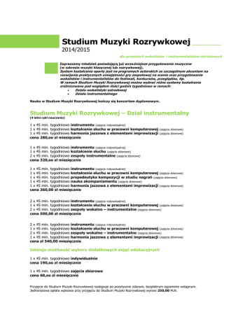 Studium Muzyki Rozrywkowej _________ 2014/2015 dla przyszłych wokalistów i instrumentalistów estradowych Zapraszamy młodzież posiadającą już wcześniejsze przygotowanie muzyczne (w zakresie muzyki klasycznej lub rozrywkowej). System kształcenia oparty jest na programach autorskich ze szczególnym akcentem na rozwijanie praktycznych umiejętności gry zespołowej na scenie oraz przygotowanie wokalistów i instrumentalistów do festiwali, konkursów, przeglądów, itp. W ramach Studium Muzyki Rozrywkowej można wybrać różne systemy kształcenia zróżnicowane pod względem ilości godzin tygodniowo w ramach: • Działu wokalistyki estradowej • Działu instrumentalnego Nauka w Studium Muzyki Rozrywkowej kończy się koncertem dyplomowym. Studium Muzyki Rozrywkowej – Dział instrumentalny (4 letni cykl nauczania) 1 x 45 min. tygodniowo instrumentu (zajęcia indywidualnie) 1 x 45 min. tygodniowo kształcenie słuchu w pracowni komputerowej (zajęcia zbiorowe) 1 x 45 min. tygodniowo harmonia jazzowa z elementami improwizacji (zajęcia zbiorowe) cena 280,oo zł miesięcznie 1 x 45 min. tygodniowo instrumentu (zajęcia indywidualnie) 1 x 45 min. tygodniowo kształcenie słuchu (zajęcia zbiorowe) 2 x 45 min. tygodniowo zespoły instrumentalne (zajęcia zbiorowe) cena 320,oo zł miesięcznie 1 x 45 min. tygodniowo instrumentu (zajęcia indywidualnie) 1 x 45 min. tygodniowo kształcenie słuchu w pracowni komputerowej (zajęcia zbiorowe) 1 x 45 min. tygodniowo propedeutyka kompozycji w studiu nagrań (zajęcia zbiorowe) 1 x 45 min. tygodniowo nauka akompaniamentu (zajęcia zbiorowe) 1 x 45 min. tygodniowo harmonia jazzowa z elementami improwizacji (zajęcia zbiorowe) cena 360,00 zł miesięcznie 2 x 45 min. tygodniowo instrumentu (zajęcia indywidualnie) 1 x 45 min. tygodniowo kształcenie słuchu w pracowni komputerowej (zajęcia zbiorowe) 2 x 45 min. tygodniowo zespoły wokalno – instrumentalne (zajęcia zbiorowe) cena 500,00 zł miesięcznie 2 x 45 min. tygodniowo instrumentu (zajęcia indywidualnie) 1 x 45 min. tygodniowo kształcenie słuchu w pracowni komputerowej (zajęcia zbiorowe) 2 x 45 min. tygodniowo zespoły wokalno – instrumentalne (zajęcia zbiorowe) 1 x 45 min. tygodniowo harmonia jazzowa z elementami improwizacji (zajęcia zbiorowe) cena zł 540,00 miesięcznie Istnieje możliwość wyboru dodatkowych zajęć edukacyjnych 1 x 45 min. tygodniowo indywidualnie cena 190,oo zł miesięcznie 1 x 45 min. tygodniowo zajęcia zbiorowe cena 60,oo zł miesięcznie Przyjęcie do Studium Muzyki Rozrywkowej następuje po pozytywnie zdanym, bezpłatnym egzaminie wstępnym. Jednorazowa opłata wpisowa przy przyjęciu do Studium Muzyki Rozrywkowej wynosi 250,00 PLN. Studium Muzyki Rozrywkowej – Dział wokalistyki estradowej (4 letni cykl nauczania) 1 x 45 min. tygodniowo wokal – interpretacja piosenki (zajęcia indywidualnie) 1 x 45 min. tygodniowo kształcenie słuchu w pracowni komputerowej (zajęcia zbiorowe) 1 x 45 min. tygodniowo zespoły wokalno – instrumentalne (zajęcia zbiorowe) cena 280,oo zł miesięcznie 1 x 45 min. tygodniowo wokal – interpretacja piosenki (zajęcia indywidualnie) 1 x 45 min. tygodniowo kreowanie wizerunku scenicznego w studiu filmowym 2 x 45 min. tygodniowo zespoły wokalno – instrumentalne (zajęcia zbiorowe) cena 350,oo zł miesięcznie 1 x 45 min. tygodniowo wokal – interpretacja piosenki (zajęcia indywidualnie) 1 x 45 min. tygodniowo kształcenie słuchu (zajęcia zbiorowe) 1 x 45 min. tygodniowo emisja i dykcja lub ruch sceniczny (zajęcia zbiorowe) 1 x 45 min. tygodniowo kreowanie wizerunku scenicznego w studiu filmowym cena 420,oo zł miesięcznie (zajęcia zbiorowe) (zajęcia zbiorowe) 1 x 45 minut tygodniowo wokal – interpretacja piosenki (zajęcia indywidualnie) 1 x 45 minut tygodniowo wokal – emisja i dykcja (zajęcia indywidualnie) 1 x 45 minut tygodniowo kształcenie słuchu (zajęcia zbiorowe) 2 x 45 minut tygodniowo kreowanie wizerunku scenicznego w studiu filmowym cena 550,oo zł miesięcznie (zajęcia zbiorowe) Istnieje możliwość wyboru dodatkowych zajęć edukacyjnych 1 x 45 min. tygodniowo indywidualnie cena 190,oo zł miesięcznie 1 x 45 min. tygodniowo zajęcia zbiorowe cena 60,oo zł miesięcznie Przyjęcie do Studium Muzyki Rozrywkowej następuje po pozytywnie zdanym, bezpłatnym egzaminie wstępnym. Jednorazowa opłata wpisowa przy przyjęciu do Studium Muzyki Rozrywkowej wynosi 250,00 PLN. Czesne w Prywatnej Szkole Muzycznej „VENO’S STUDIO” płatne jest w dziesięciu stałych ratach – od września do czerwca – bez okresu wakacji letnich (lipiec, sierpień). Przy jednorazowej opłacie semestralnej opłata wpisowa wynosi 50%. Przy jednorazowej opłacie rocznej – przyjęcie bez opłaty wpisowej.
