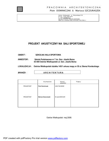 PRACOWNIA ARCHITEKTONICZNA Piotr DOMINICZAK & Mariusz SZCZURASZEK Ostrów Wielkopolski ul. Warynskiego 21/2 tel. fax. ( 0-62 ) 592 35 35 e – mail [email protected] NIP 622 215 05 42 REGON 250752580 GBW S.A. O/Ostrów Wlkp 16101032-7197-27001-1 PROJEKT AKUSTYCZNY NA SALI SPORTOWEJ OBIEKT : INWESTOR : SZKOLNA HALA SPORTOWA Szkoła Podstawowa nr 7 im. Gen. Józefa Bema 63-400 Ostrów Wielkopolski ul. Gen. Józefa Bema LOKALIZACJA : Ostrów Wielkopolski działka 145/1 arkusz mapy nr 55 ul. Bema/ Kordeckiego BRANŻA : ARCHITEKTURA Imię Nazwisko Numery uprawnień PROJEKTANT Piotr Dominiczak UAN-7342-98/92 PROJEKTANT Mariusz Szczuraszek Nr ewid.9/99 DUW Ostrów Wielkopolski maj 2008. PDF created with pdfFactory Pro trial version www.pdffactory.com Podpisy Pracownia Architektoniczna Piotr Dominiczak i Mariusz Szczuraszek 63-400 Ostrów Wielkopolski ul. Waryńskiego 21\2 ZAWARTOŚĆ OPRACOWANIA 1. Strona tytułowa 2. Zawartość opracowania 3. Opis str. nr 1 str. nr 2 str. nr 3 4. Część graficzna 1. 2. Sufit akustyczny : rzut, przekrój Ekran akustyczny na ścianach SUFIT AKUSTYCZNY NA SALI SPORTOWEJ maj 2008 PDF created with pdfFactory Pro trial version www.pdffactory.com 2 Pracownia Architektoniczna Piotr Dominiczak i Mariusz Szczuraszek 63-400 Ostrów Wielkopolski ul. Waryńskiego 21\2 OPIS 1.1 Obiekt. SZKOLNA HALA SPORTOWA 1.2. Adres. Ostrów Wielkopolski działka 145/1 arkusz mapy nr 55 ul. Bema/ Kordeckiego 1.3. Inwestor : Szkoła Podstawowa nr 7 im. Gen. Józefa Bema 63-400 Ostrów Wielkopolski ul. Gen. Józefa Bema 1.4. Własność terenu: Inwestor 1.5. Opracowanie projektu : PRACOWNIA ARCHITEKTONICZNA P.DOMINICZAK & M.SZCZURASZEK 1.6. Opis przyjętego rozwiązania: W celu polepszenia parametrów akustycznych na hali sportowej przy Szkole nr 7 w Ostrowie Wlkp. należy wykonać sufity z wełny szklanej pokrytej tkaniną chroniąca przed uderzeniami mechanicznymi . W projekcie przyjęto sufit firmy ECOPHON , typ: SUPER G o klasie pochłaniania dźwięków 2A , płyty grubości 35 mm licowane są tkaniną z włókna szklanego i malowane powłoką malarską w kolorze zbliżonym do NSC S1002-Y ( biały) o współczynniku odbicia światła na poziomie 78%. Sufit należy mocować do spodu blachy trapezowej na systemowych profilach zgodnie z wytycznymi producenta. Płyty po zamocowaniu nie są przeznaczone do demontażu. Płyty sufitu instalować w możliwie późnym etapie budowy , przy montażu używać czystych, bawełnianych rękawic. Na ścianach sali należy wykonać ekrany akustyczne z płyt Ecophon oraz absorber płytowy zgodnie z wytycznymi zawartymi w Oparcie Akustycznym oraz części rysunkowej niniejszego opracowania. Szczegółowe parametry produktów podano na rysunku jak oraz specyfikacji technicznej. UWAGA ! Opisane i przyjęte w dokumentacji materiały i technologie mogą zostać zastąpione materiałami i technologiami o tożsamych lub lepszych właściwościach fizyko-chemicznych. Zamówienie należy dokonać po zweryfikowaniu wymiarów na budowie. PROJEKTANT: arch. Piotr Dominiczak arch. Mariusz Szczuraszek SUFIT AKUSTYCZNY NA SALI SPORTOWEJ maj 2008 PDF created with pdfFactory Pro trial version www.pdffactory.com 3 PDF created with pdfFactory Pro trial version www.pdffactory.com PDF created with pdfFactory Pro trial version www.pdffactory.com