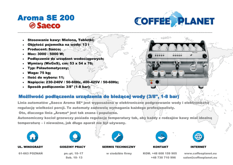 Aroma SE 200 ......................................................................................................................................................................................................................................................................................................................................... Stosowanie kawy: Mielona, Tabletki; Objętość pojemnika na wodę: 13 l Producent: Saeco; Moc: 3000 - 5000 W; Podłączenie do urządzeń wodociągowych; Wymiary (WxGxS), cm: 53 x 54 x 76; Typ: Półautomatyczny; Waga: 75 kg; Ilość do wyboru: 11; Napięcie: 230-240V / 50-60Hz, 400-425V / 50-60Hz; Sposób podłączenia: 3/8" (1-8 bar); Możliwość podłączenia urządzenia do bieżącej wody (3/8", 1-8 bar) Linia automatów „Saeco Aroma SE“ jest wyposażona w elektroniczne podgrzewanie wody i elektroniczną regulację wielkości porcji. Te automaty zadowolą wymagania każdego profesjonalisty. Oto, dlaczego linia „Aroma“ jest tak znana i popularna. Autonomiczny kocioł grzewczy posiada regulację temperatury tak, aby każdy z rodzajów kawy miał idealną temperaturę – i nieważne, jak długo aparat nie był używany. UL. WINOGRADY 61-663 POZNAŃ GODZINY PRACY pn.-pt. 10–17 Sob. 10- 13 SERWIS TECHNICZNY KONTAKT w siedzibie firmy KOM. +48 608 159 905 +48 730 710 996 INTERNET www.coffeeplanet.eu [email protected]