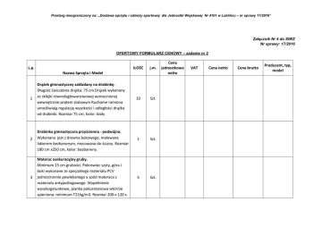 Przetarg nieograniczony na: „Dostawa sprzętu i odzieży sportowej dla Jednostki Wojskowej Nr 4101 w Lublińcu – nr sprawy 17/2016” Załącznik Nr 4 do SIWZ Nr sprawy: 17/2016 OFERTOWY FORMULARZ CENOWY – zadanie nr 2 L.p. ILOŚC j.m. 1 Drążek gimnastyczny zakładany na drabinkę. Długość ćwiczebna drążka: 75 cm Drążek wykonany ze sklejki równoległowarstwowej wzmocnionej wewnętrznie prętem stalowym Ruchome ramiona umożliwiają regulację wysokości i odległości drążka od drabinki. Rozmiar 75 cm, kolor: biały 10 Szt. 2 Drabinka gimnastyczna przyścienna - podwójna. Wykonana jest z drewna bukowego, malowana lakierem bezbarwnym, mocowana do ściany. Rozmiar 180 cm x250 cm, kolor: bezbarwny. 1 Szt. 3 Materac asekuracyjny gruby. Minimum 25 cm grubości. Pokrowiec szyty, góra i boki wykonane ze specjalnego materiału PCV jednostronnie powlekanego a spód materaca z materiału antypoślizgowego. Wypełnienie wysokogatunkowe, pianka poliuretanowa wtórnie spieniona: minimum T21kg/m3. Rozmiar 200 x 120 x 5 Szt. Nazwa Sprzętu i Model Cena jednostkowa netto VAT Cena netto Cena brutto Producent, typ, model Przetarg nieograniczony na: „Dostawa sprzętu i odzieży sportowej dla Jednostki Wojskowej Nr 4101 w Lublińcu – nr sprawy 17/2016” 25 cm, kolor: niebieski. 4 5 6 7 LINA CROSSFIT Z POWŁOKĄ NYLONOWĄ Sport Thieme lub równoważny Antypoślizgowe rączki, naturalna skóra zapobiegająca przetarciu liny, wodoodporna. Długość 9 m, średnica 38 mm, kolor: czarny. RAKIETKA DO TENISA STOŁOWEGO STIGA IMPAX lub równoważna. Rączka- Concave (wklęsła). Okładzina- drive, 2,0 mm. Deska- 5 warstwowa, extra light. W skali 0-100: Szybkość: 57. Rotacja: 40. Kontrola: 80 Manekin treningowy do walki wręcz swobodnie stojący. Podstawa wykonana z tworzywa PP, napełniana wodą (ok.150kg) lub suchym, przesianym piaskiem (ok.180kg) dla zapewnienia odpowiedniej stabilności. Manekin przeznaczony jest do treningu walki wręcz. Wysokiej jakości korpus przypominający ciało mężczyzny, mocowany na sprężystej kolumnie. Waga korpusu ok 15 kg. Wysokość manekina regulowana 162-195 cm. Waga pustego przyrządu ok. 20 kg. DREWNIANE KÓŁKA GIMNASTYCZNE. Posiadają wygodny system klamer, dzięki czemu możemy z łatwością regulować długość taśm. Taśmy muszą być wysokiej wytrzymałości, i długości co najmniej 5 m i szerokości 5 cm. W zestawie klamra do 2 Szt. 6 Szt. 1 Szt. 2 Kpl. Przetarg nieograniczony na: „Dostawa sprzętu i odzieży sportowej dla Jednostki Wojskowej Nr 4101 w Lublińcu – nr sprawy 17/2016” regulacji taśm. Drewniane kółka muszą być wykonane z trwałego materiału i nie mogą być śliskie. 8 9 PIŁKA NOŻNA ADIDAS CONEXT 15 GLIDER lub równoważny Materiał: termoplastyczny poliuretan - Optymalna przyczepności odporność na ścieranie - Rozmiar: 5 - Ciśnienie robocze: 0,5-0,7 bar/7,3-10,2 psi. - Zawór zwrotny butylowy - Przeznaczenie: boiska trawiaste Piłka Futsalowa Adidas Conext lub równoważny. Maszynowo szyte panele wykonane z TPU powlekanego nylonem zapewniają miękki dotyk, a zarazem wyjątkową trwałość. Butylowy pęcherz zapewnia utrzymanie odpowiedniego kształtu. Rozmiar 4, kolor: czerwony lub zielony. Stół STIGA EXPERT ROLLER lub równoważny. Doskonały stół turniejowy oparty na konstrukcji CSS. Dwie samodzielne połówki. Stół jest bardzo stabilny i funkcjonalny. Stelaż na kółkach i automatycznie rozkładane nogi. Bardzo łatwy w montażu, 10 demontażu, przenoszeniu i przechowywaniu. Po złożeniu zajmuje bardzo mało miejsca. Grubość stołu - 85mm , z czego 25mm to blat z płyty pilśniowej i 60 mm wspornik (wzmocniona rama dookoła stołu). Blat pokryty wysokiej jakości materiałem o doskonałej sprężystości. Bardzo mocna i wytrzymała konstrukcja. 3 Szt. 3 Szt. 2 Szt. Przetarg nieograniczony na: „Dostawa sprzętu i odzieży sportowej dla Jednostki Wojskowej Nr 4101 w Lublińcu – nr sprawy 17/2016” Stół posiada Certyfikat Unii Europejskiej EN14468-1 Class A. Do gry pojedynczej i podwójnej. Rozmiar : szer. 152,5 cm, dł. 66,5 cm, wys. 154 cm, grubość 85 mm Razem